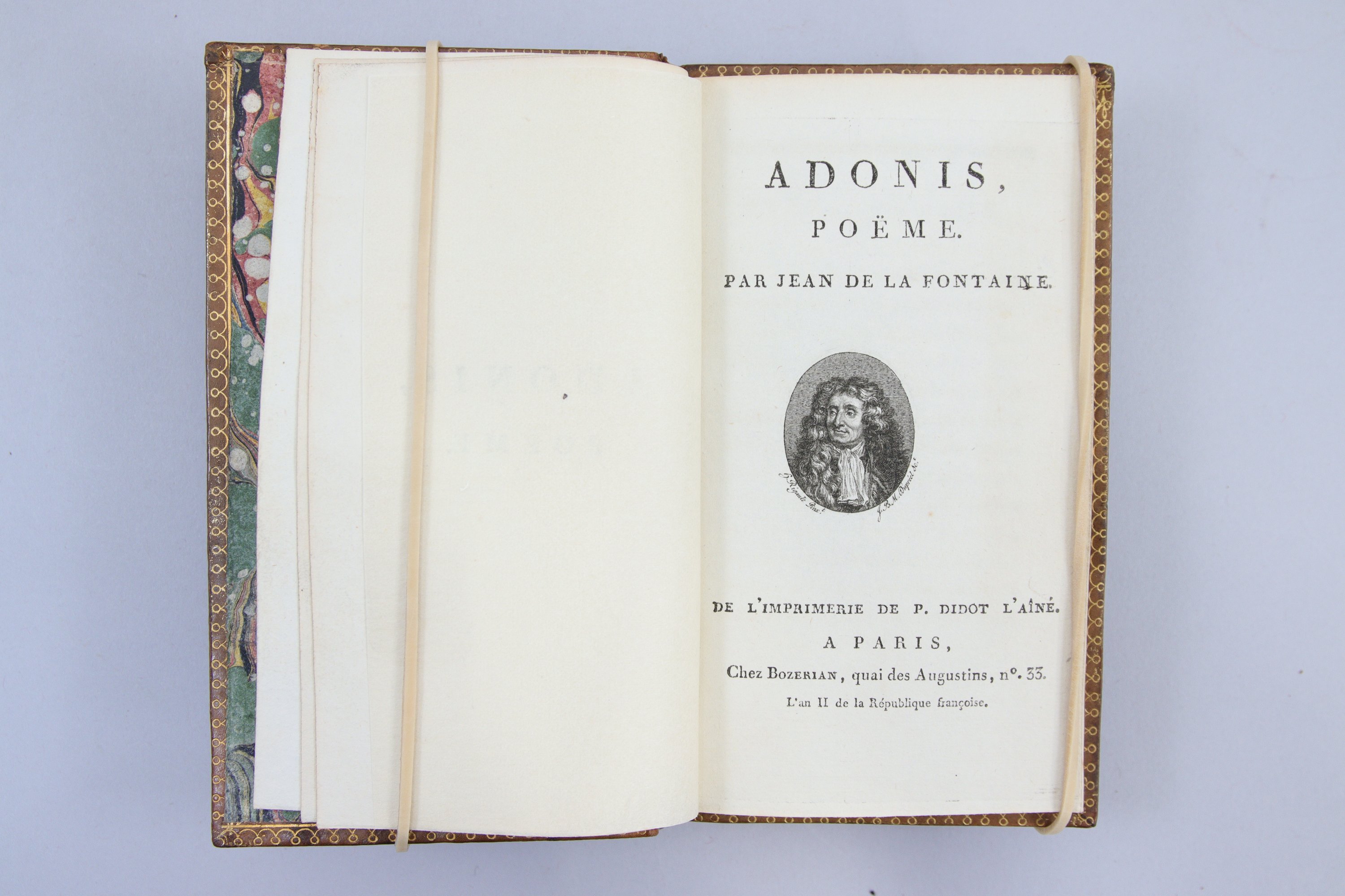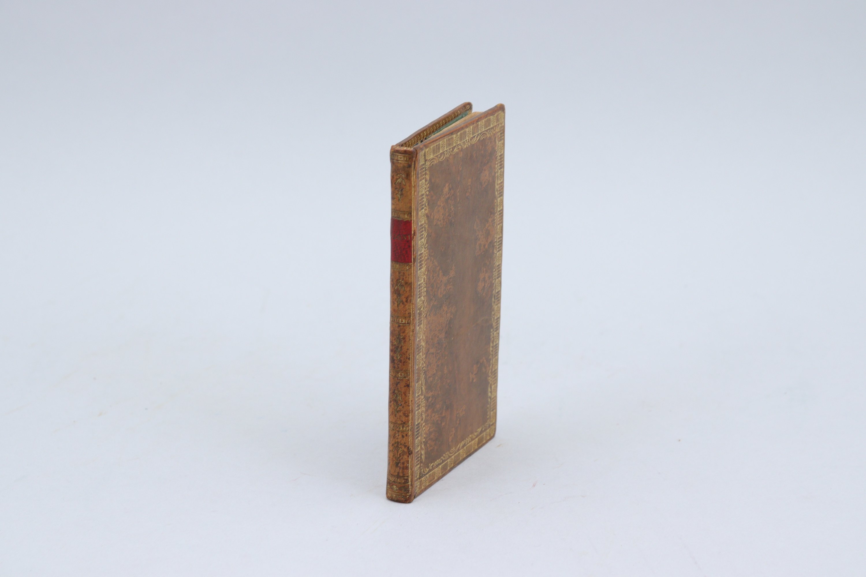 In-18, 66 pages. Plein veau flammé. Roulette de frise grecque, et rinceau sur les plats ; dos sans nerf ; roulette au croisillon sur les coupes ; roulette sur les chasses ; toutes tranches dorées. Reliure du temps, attribuable à l'atelier de Bozérian. (Ors du dos ternis).