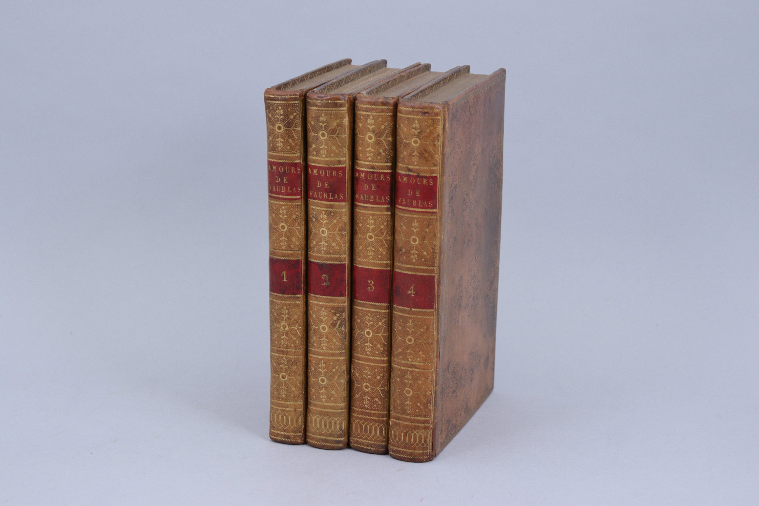 4 volumes in-8, veau raciné du temps. I: (2 ff), 244 pp. et 6 planches h.t ; II: (2ff), 274 pp et 7 planches h.t.; III: (2ff), 307 pp.et 6 planches h.T.: IV: (2ff), 330 pp., 8 planches h.T.