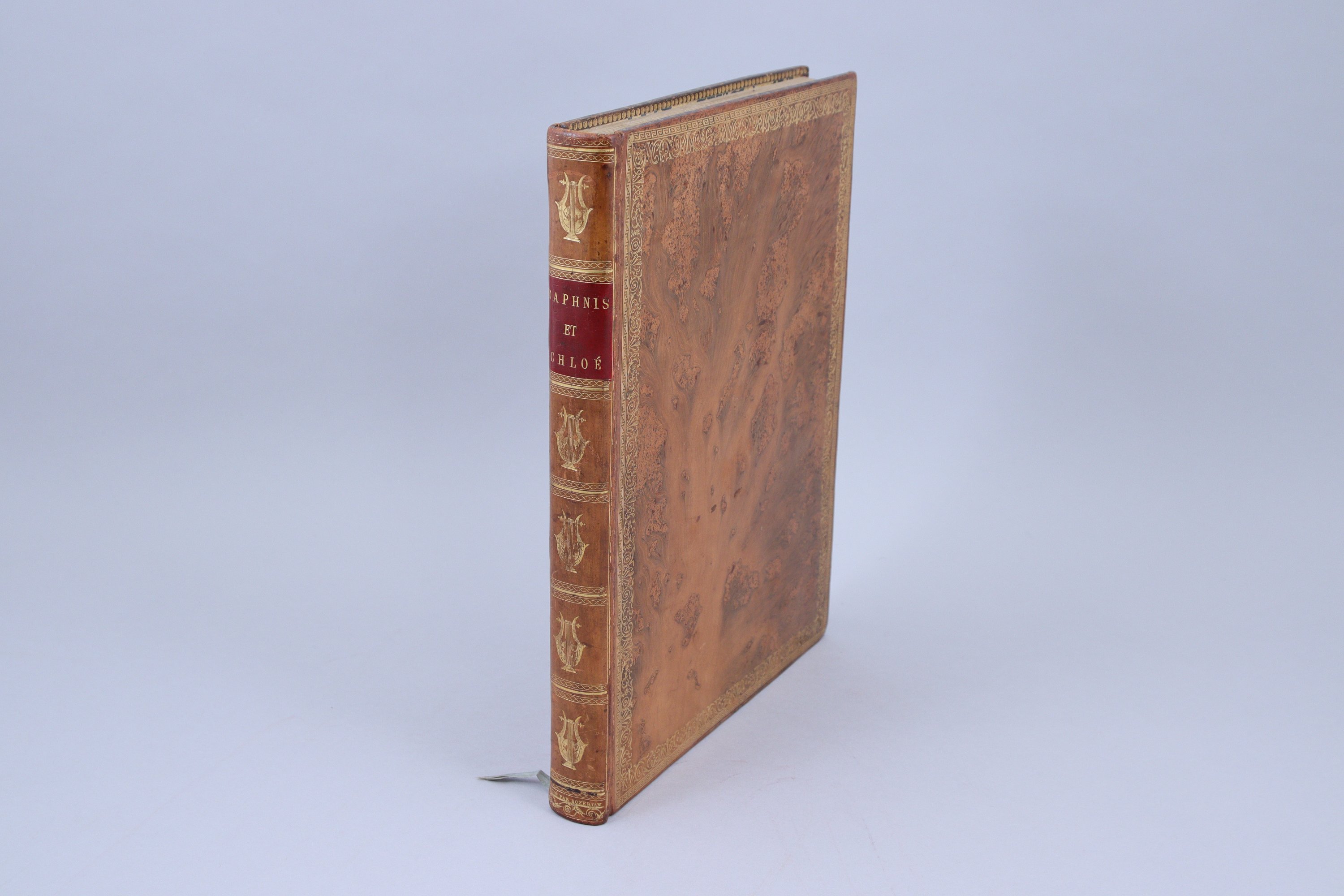 Grand in-4°. Dimensions intérieures: 310 X 232 mm. VIII et 200 pages. Plein veau blond flammé, roulette d'encadrement à la clé grecque, bordée par une large roulette à décor de rinceau ; dos sans nerf avec grand fer à la lyre 5 fois répété ; pièce de titre de maroquin rouge. Filet aux pointillés sur les coupes. Roulette aux sphères sur les chasses. Gardes de papier à la cuve blanc, jaune et bleu. Toutes tranches dorées. Reliure signée "Bozérian" en queue. (Quelques rares rousseurs. Discrète restauration du mors supérieur)