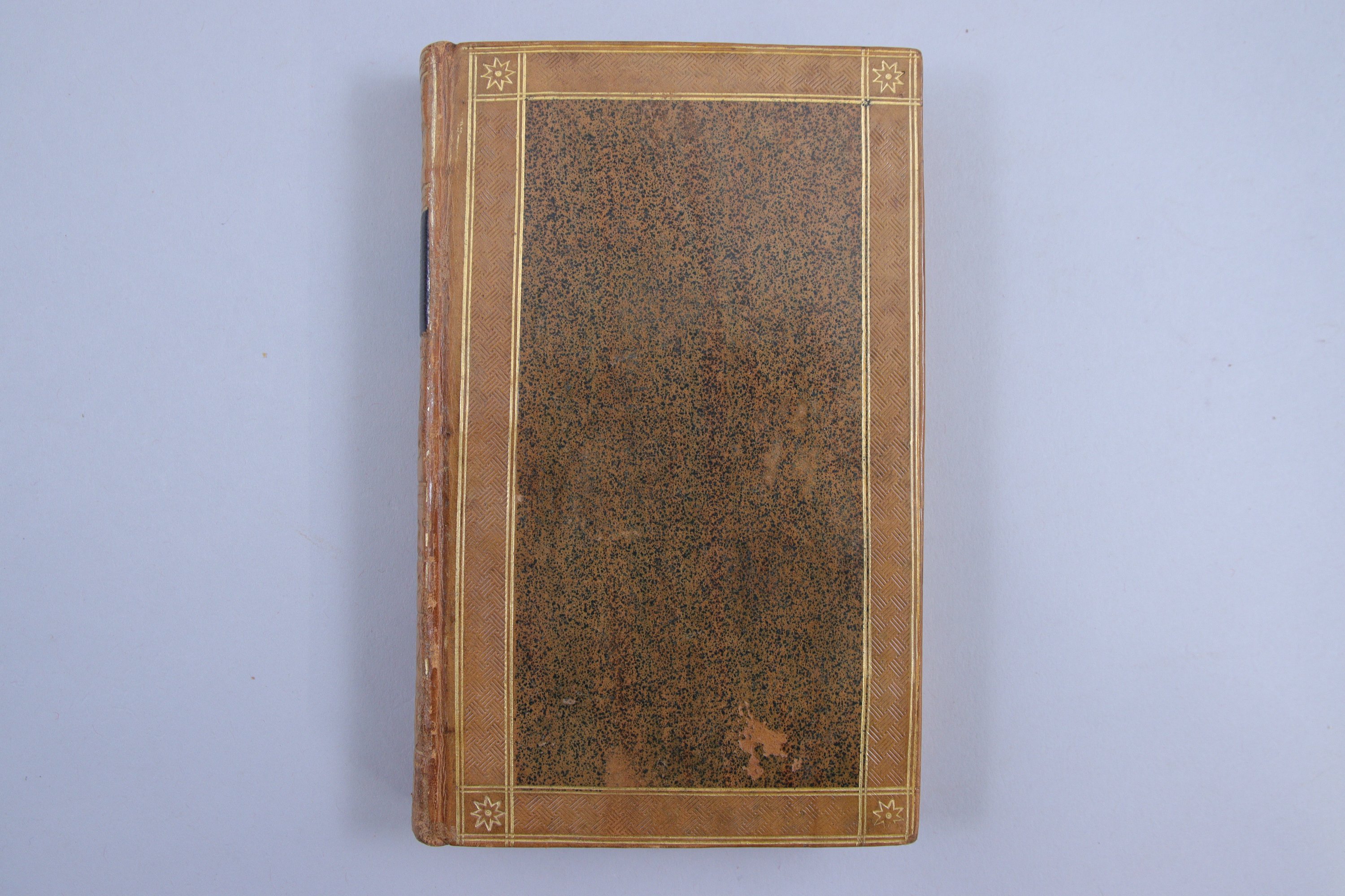 Charmante reliure du temps en plein veau blond, 2 doubles filets droits et 1 large roulette à froid encadrent des plats finement mouchetés ; dos sans nerf très orné ; filet sur les coupes ; roulette intérieure ; toutes tranches dorées.