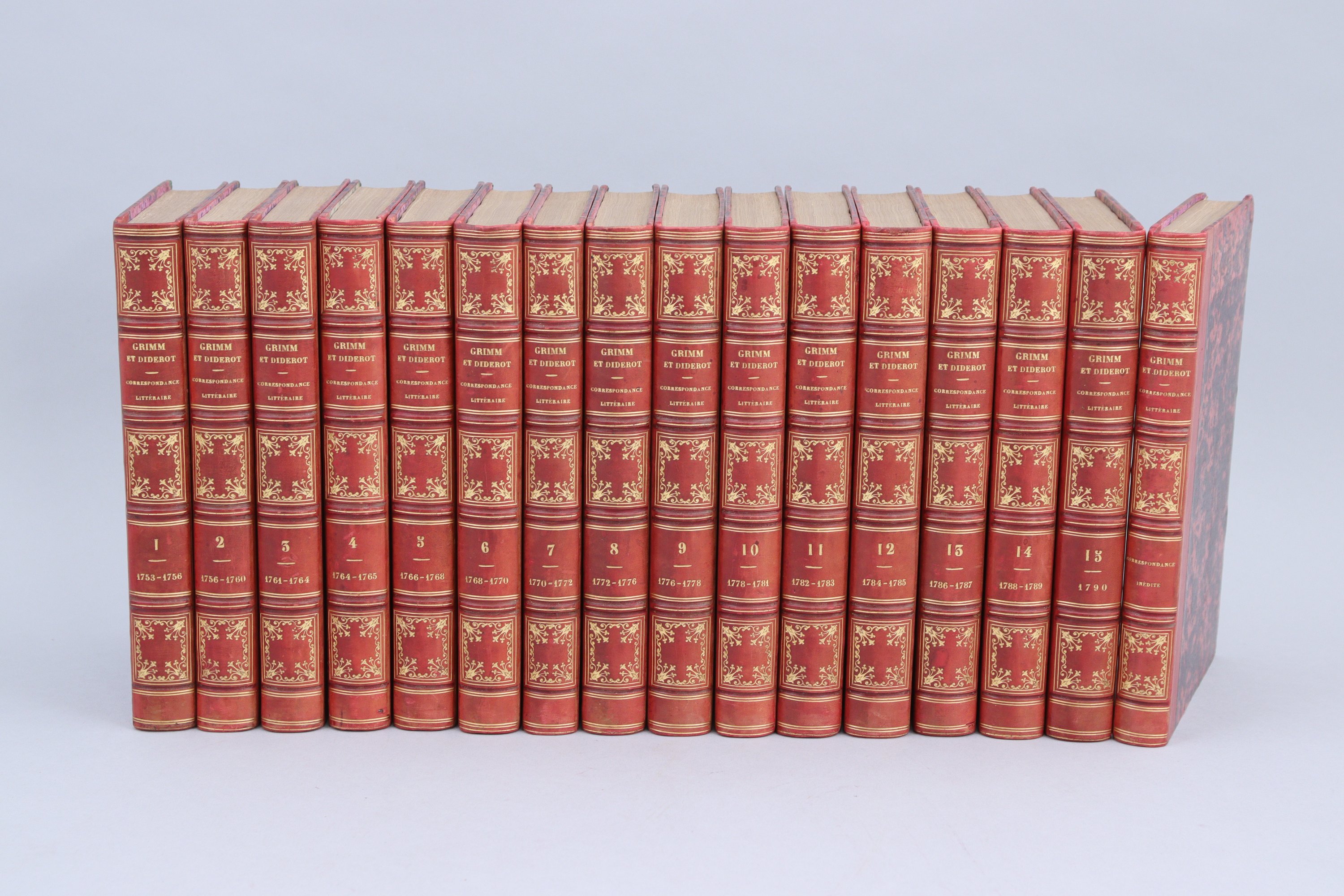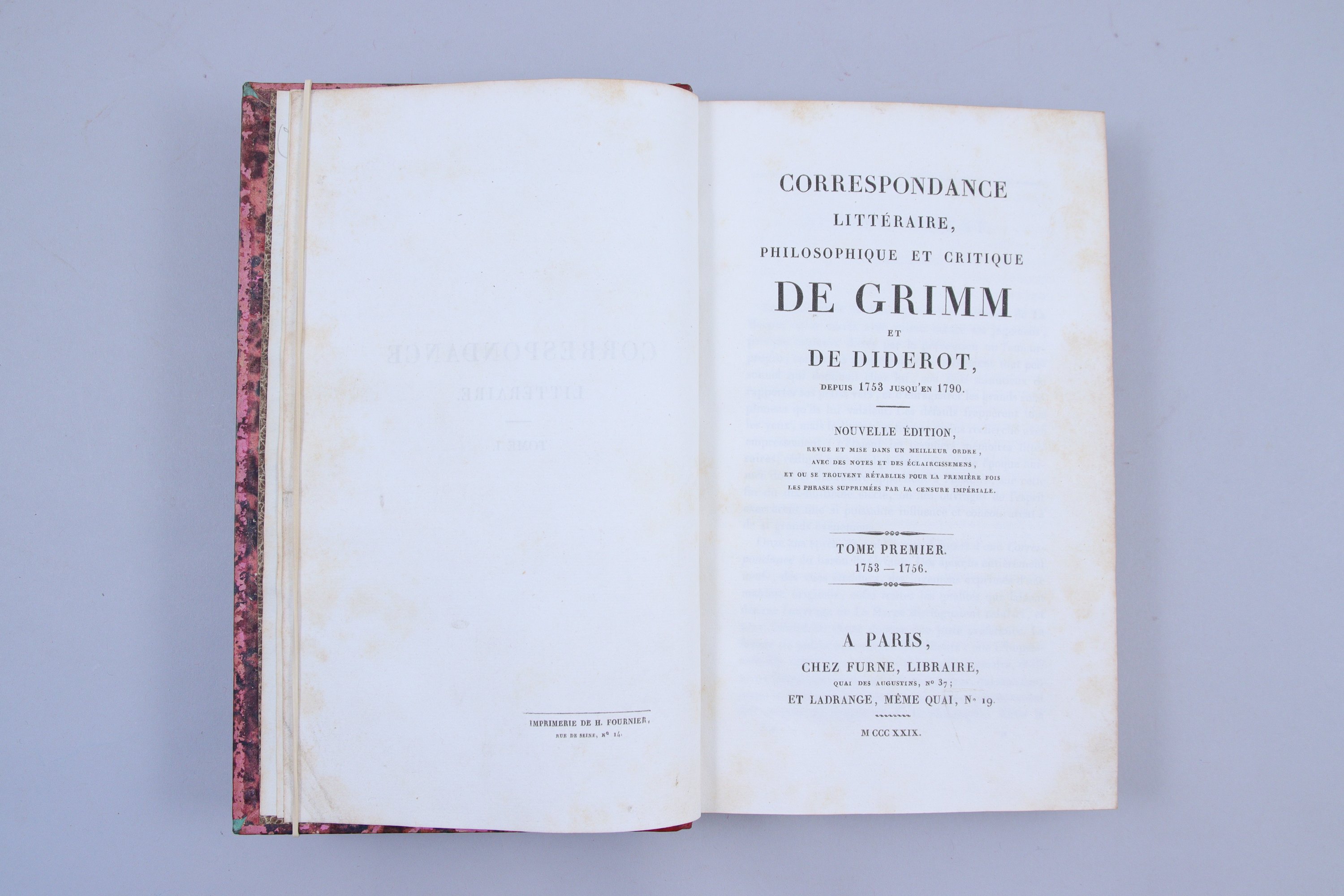 Edition en partie originale. Bien complet du volume intitulé "Correspondance inédite de Grimm et de Diderot, et recueil de lettres, poésies, morceaux et fragments retranchés par la Censure Impériale en 1812 et 1813" publiée en supplément par les mêmes libraires en 1829.