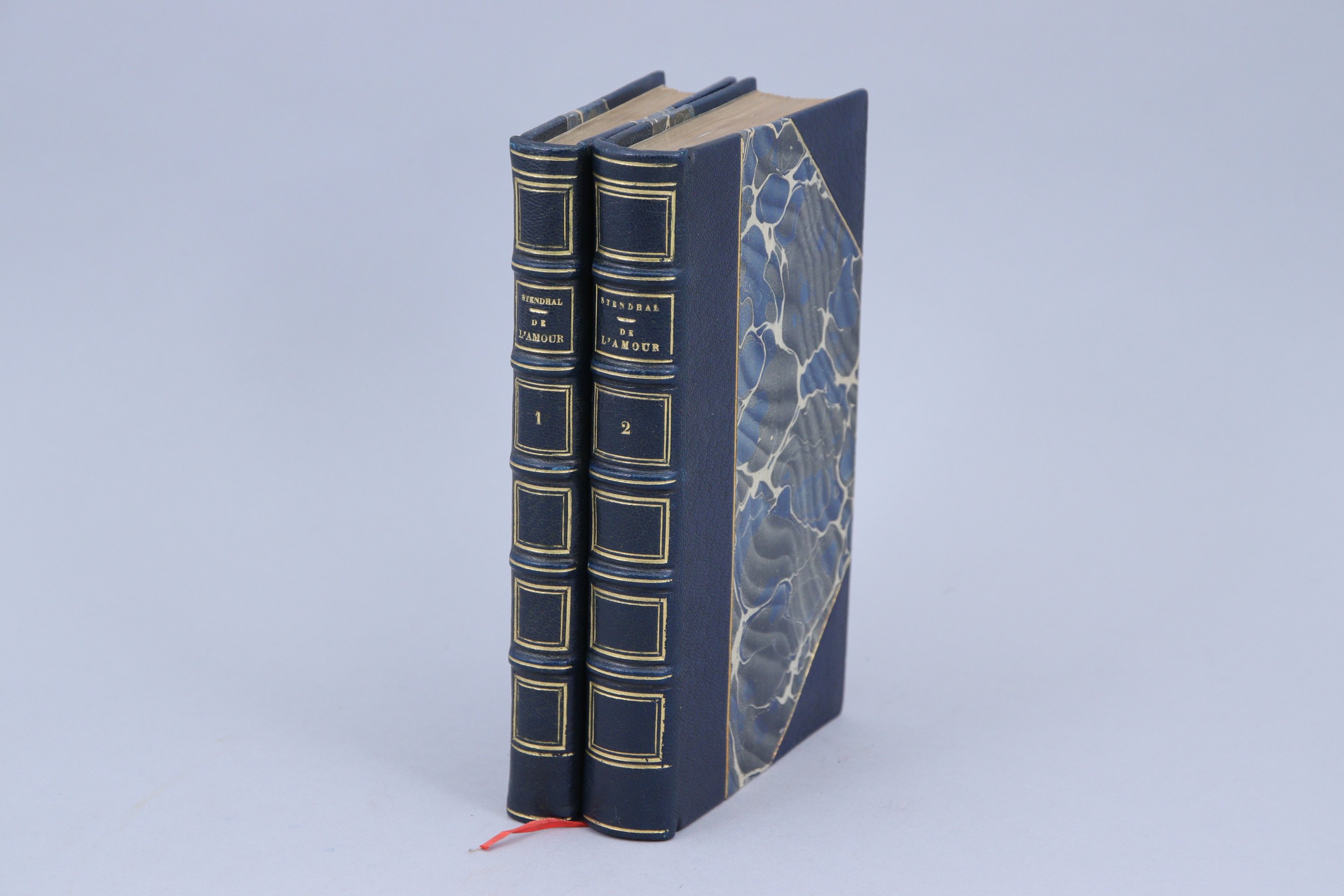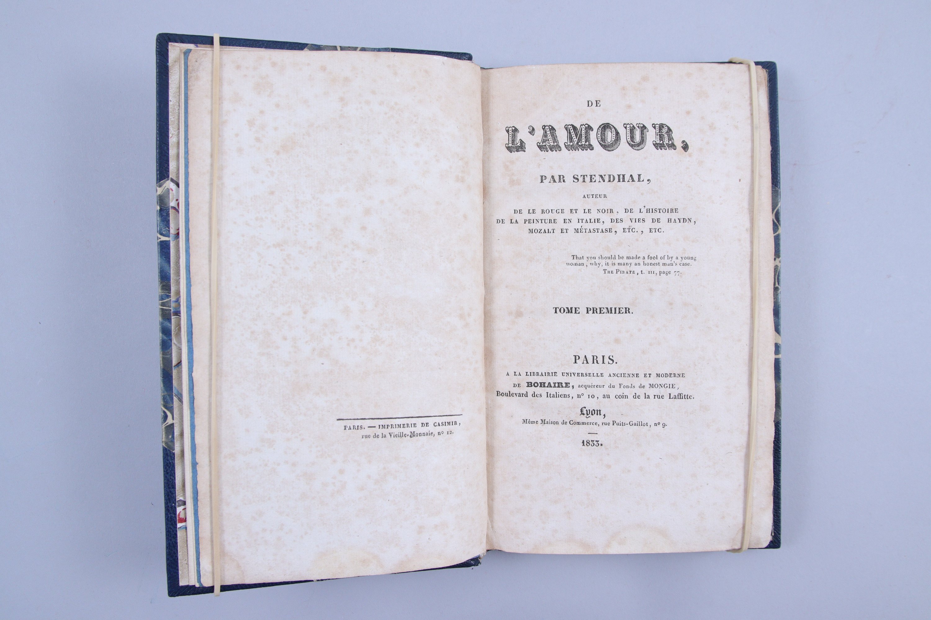 Publié chez Mongie, en 1822, De l'Amour se vendit très mal: une vingtaine d'exemplaires en dix ans. Mongie cessant son activité, les invendus furent achetés par Bohaire, qui les remit en vente à son adresse en 1833, changeant seulement les faux-titres et les titres (avec la coquille Mozalt pour Mozart). "Les textes sont ceux de l'édition originale". (Carteret).