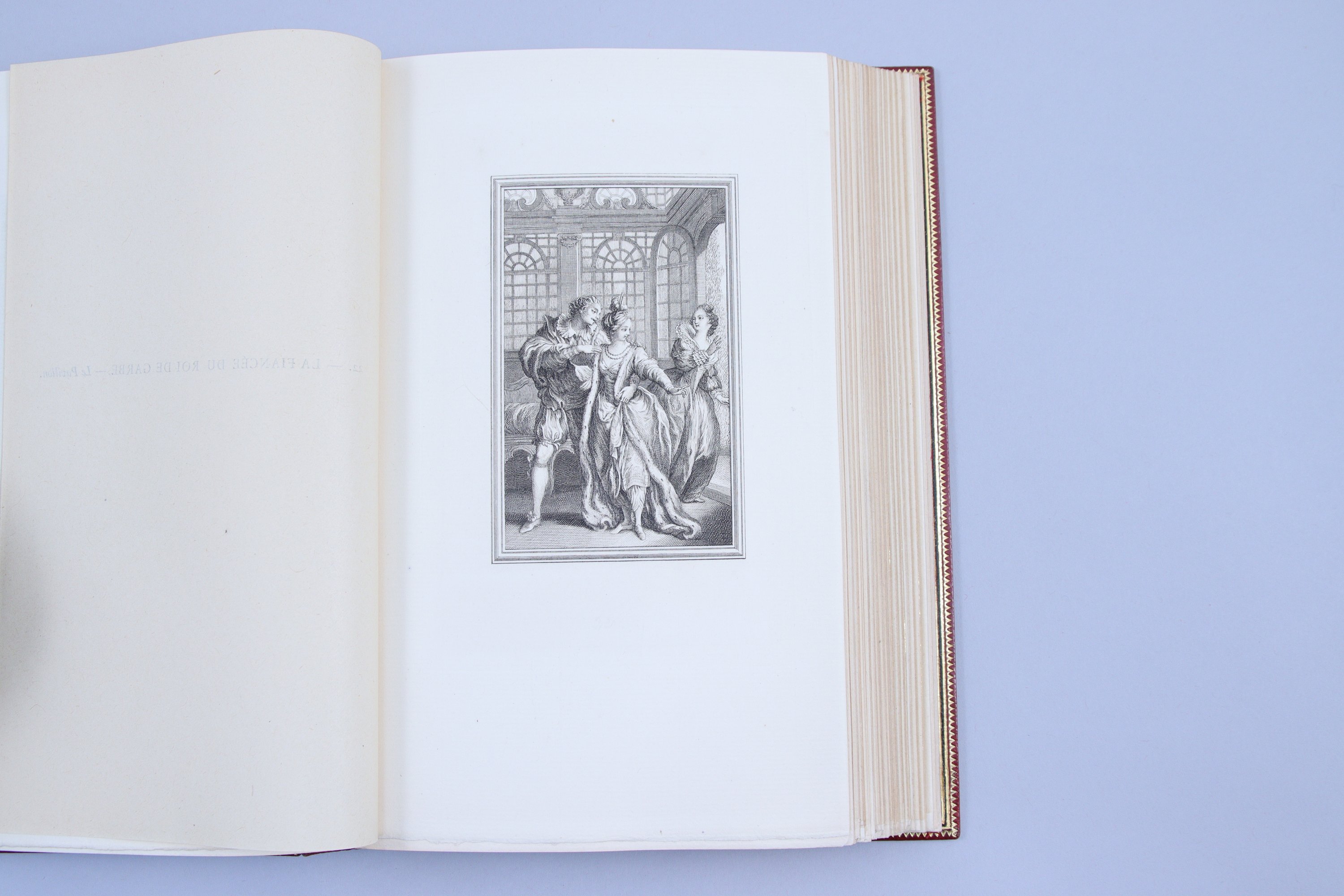 Luxueux tirage à petit nombre des 84 cuivres originaux -dont 4 planches refusées- de Eisen pour l'édition dite des Fermiers Généraux de 1762, et du portrait de La Fontaine par Hyacinthe Rigault. Les planches, tirées sur vergé de Hollande, montées sur onglets,sont précédées d'une serpente sur Chine avec texte imprimé.