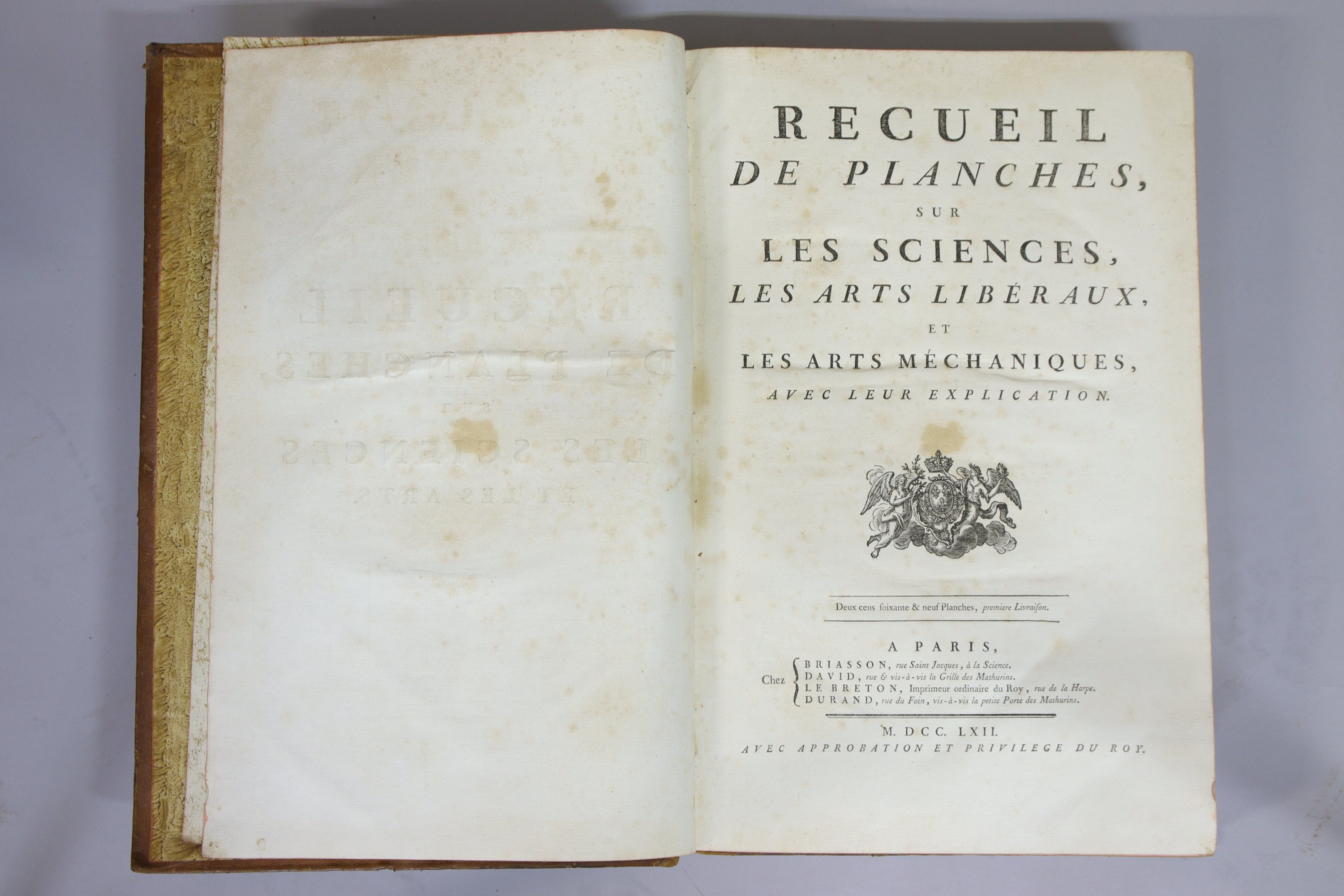 33 volumes in-folio (sur 35: les deux volumes de Table publiés en 1780 manquent). Reliures du temps en veau ra-ciné. Bien complet du frontispice et des 3129 planches. Les dos des tomes I à VII sont ornés de fers « à la gre-nade » et ont des gardes de papier à la cuve. Tous les au-tres volumes présentent un dos orné d'un fer « à la rose des vents », encadré de quatre fers « au ruban » ; leurs gardes sont de papier peigné ocre. Tranches rouges.