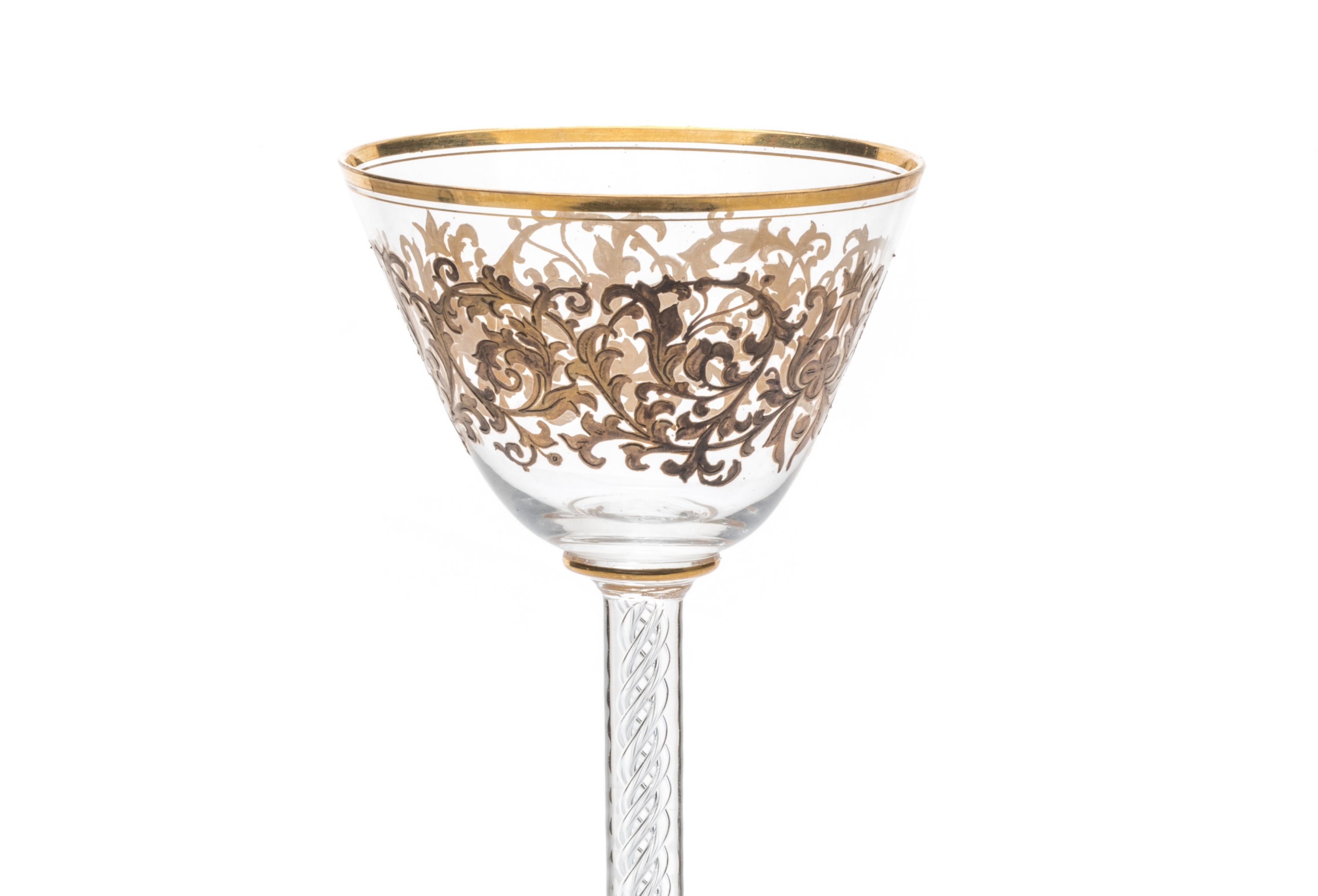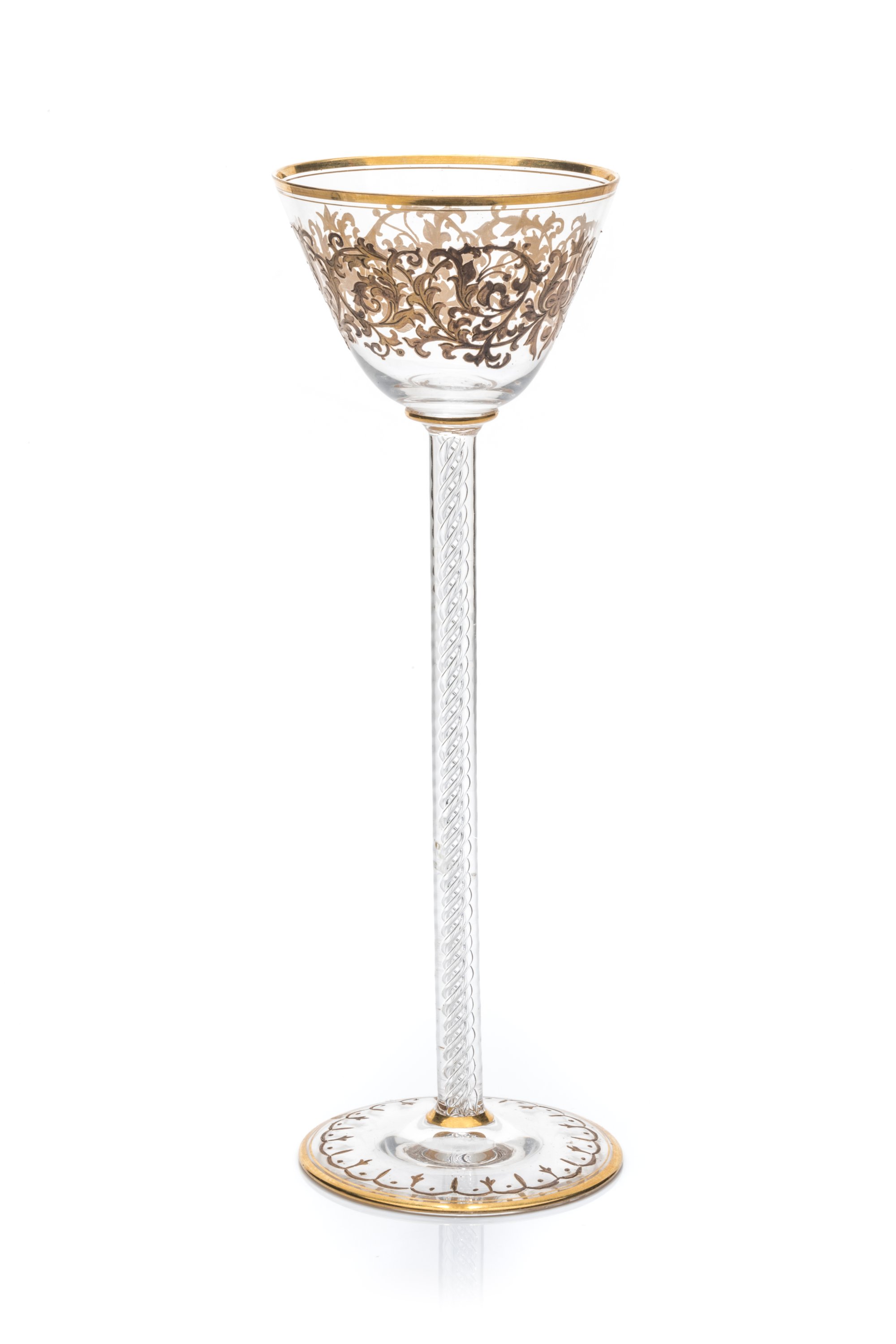 en verre transparent orné, dans un registre ceint de trois fils d'or, de rinceaux, fleurs et couronnes jaunes rehaussées d'or. Il repose sur un spectaculaire pied à décor torsadé spiralé et est enrichi par une frise géométrique et trois fils d'or.