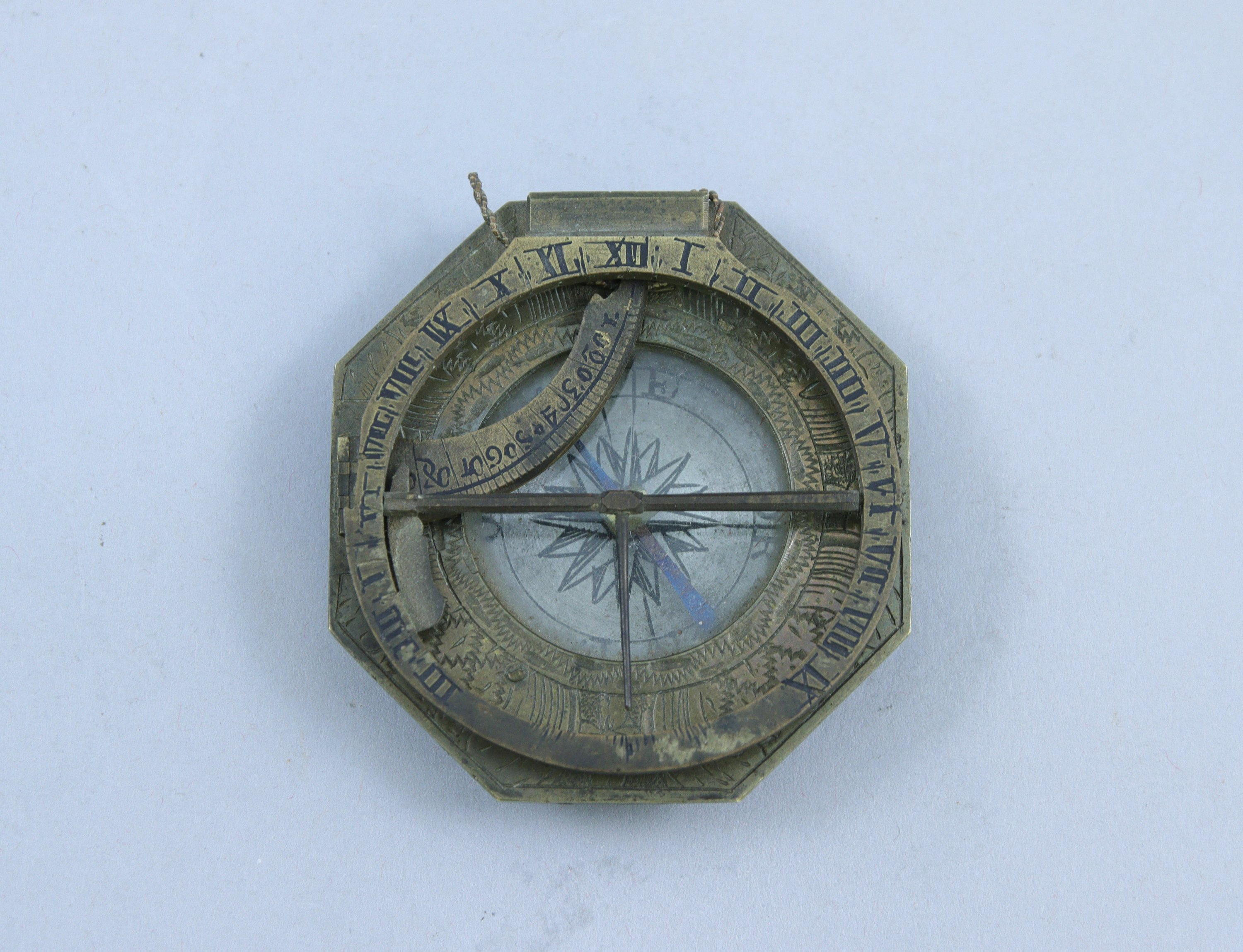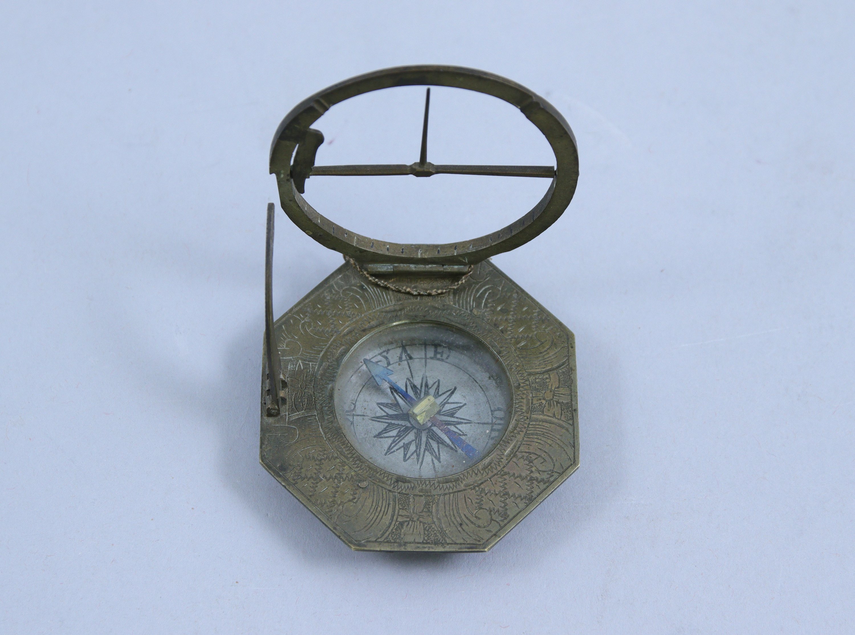 en laiton, de forme octogonale, finement gravé et décoré de fleurons et de feuilles d'acanthe. L'anneau à charnière gradué en chiffres romains et les degrés en chiffres arabes. Au centre, une boussole magnétique sur rose des vents à l'aiguille bleuie. Au dos est gravé "Eleva Poli" (élévations aux pôles) ainsi que le nom de villes avec leur latitude (Corfou, Pise, Lüneburg...) et L. GRASZ, probablement le fabricant.