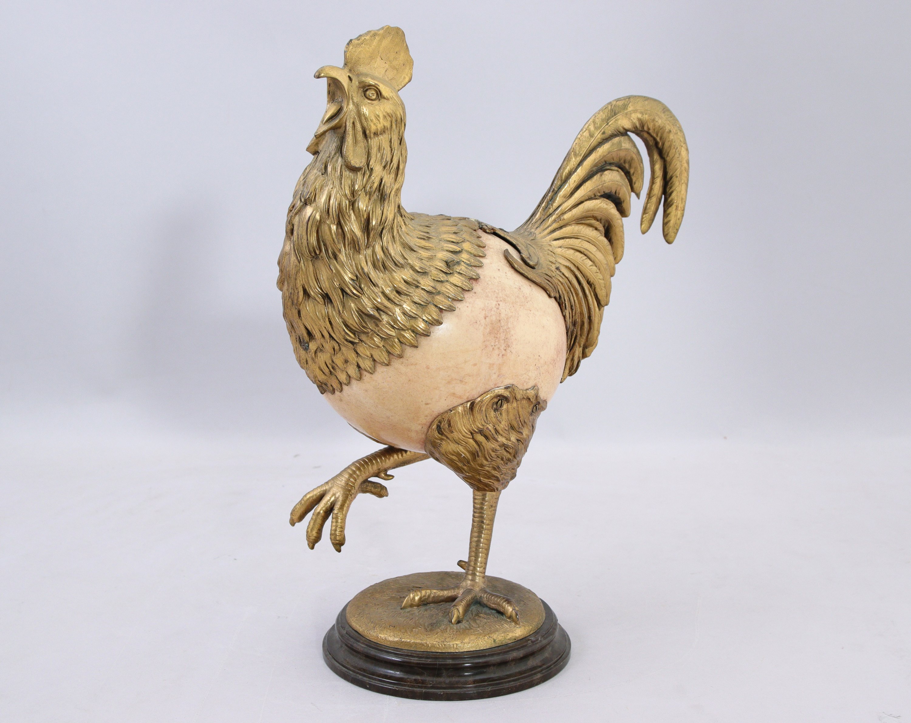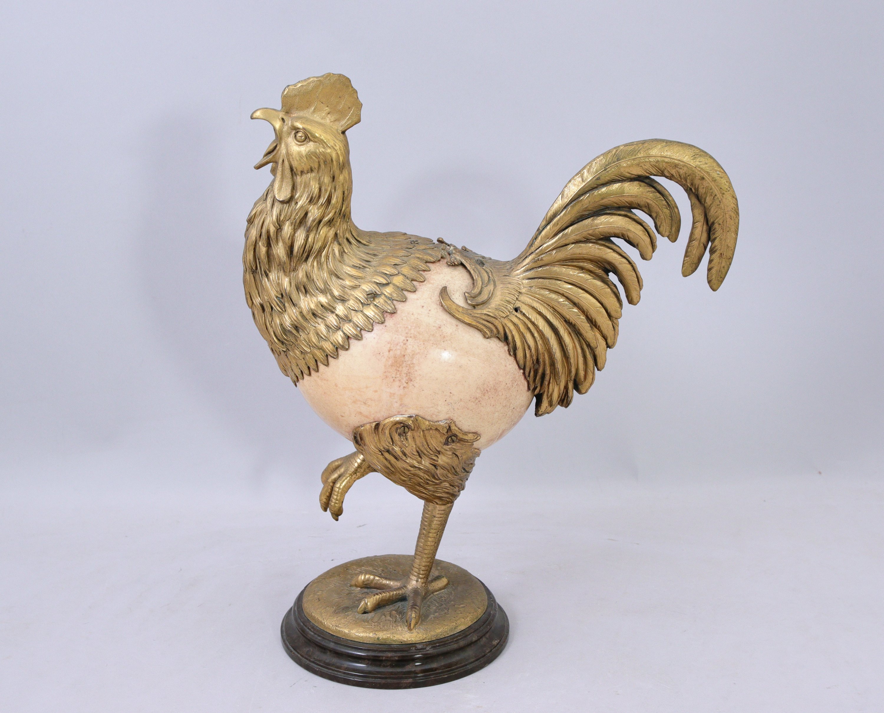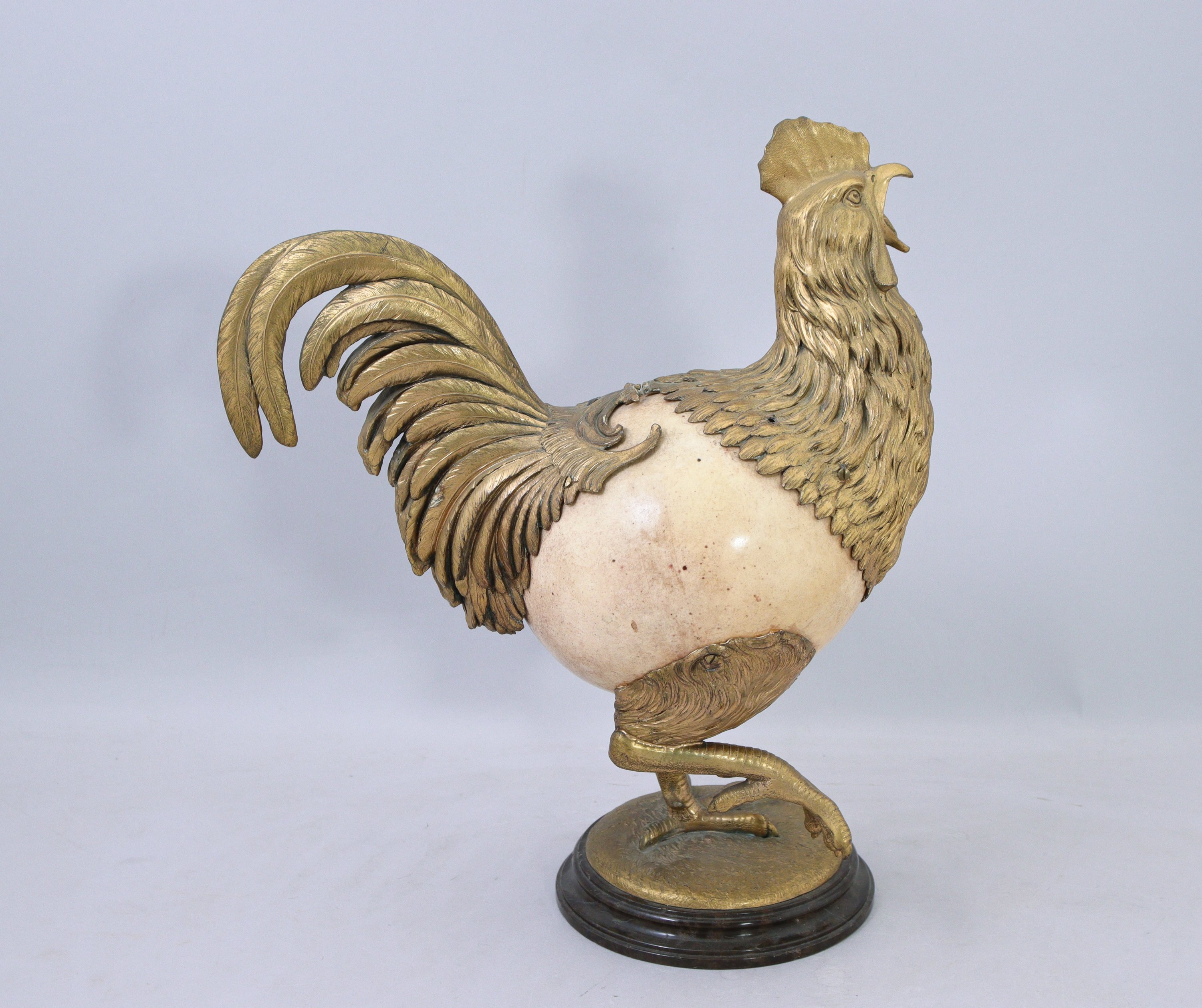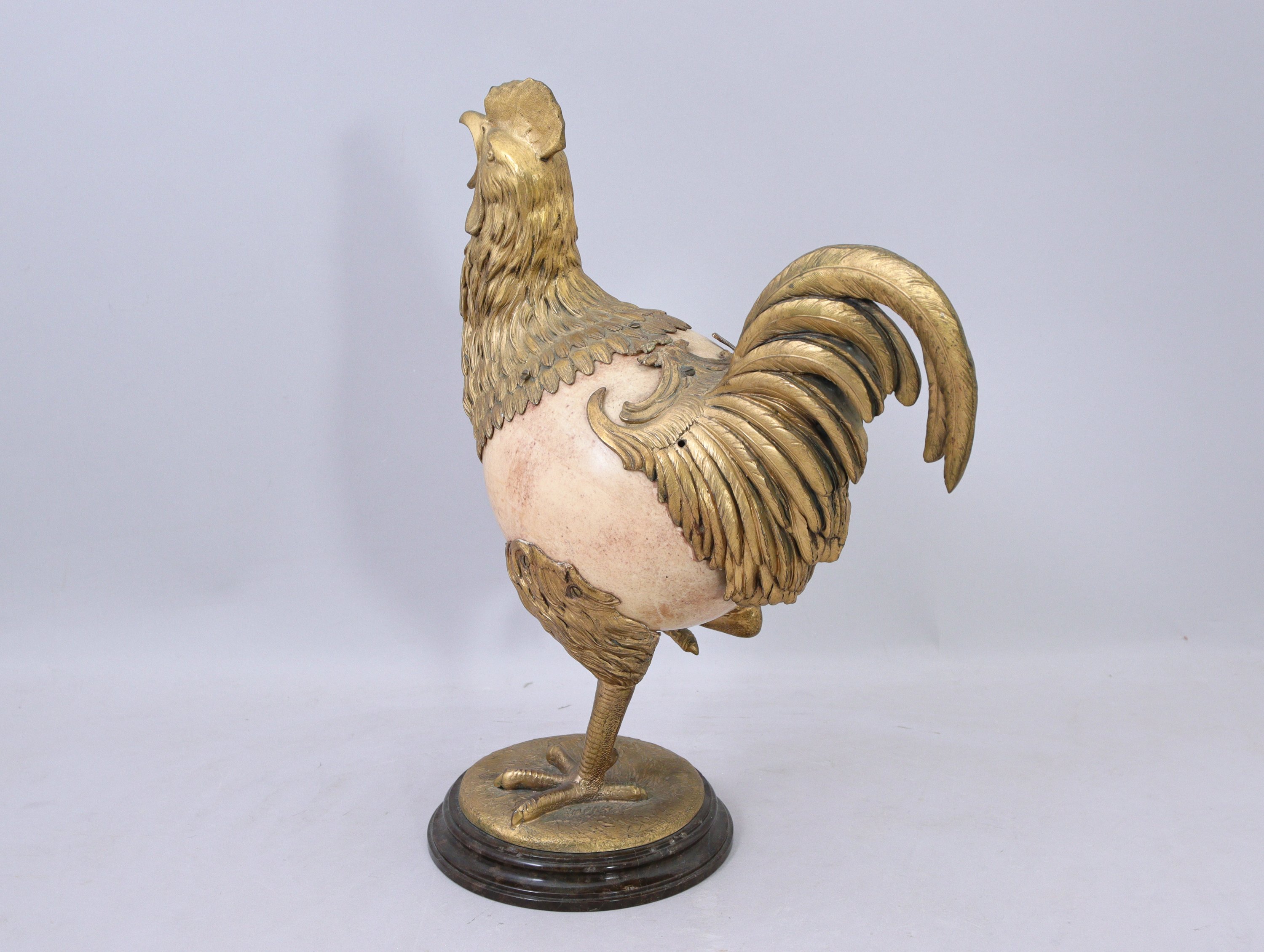 en bronze doré, ciselé et amati dont le corps est formé d'un oeuf d'autruche. Il repose sur une terrasse circulaire soutenue par un socle en marbre à doucine.