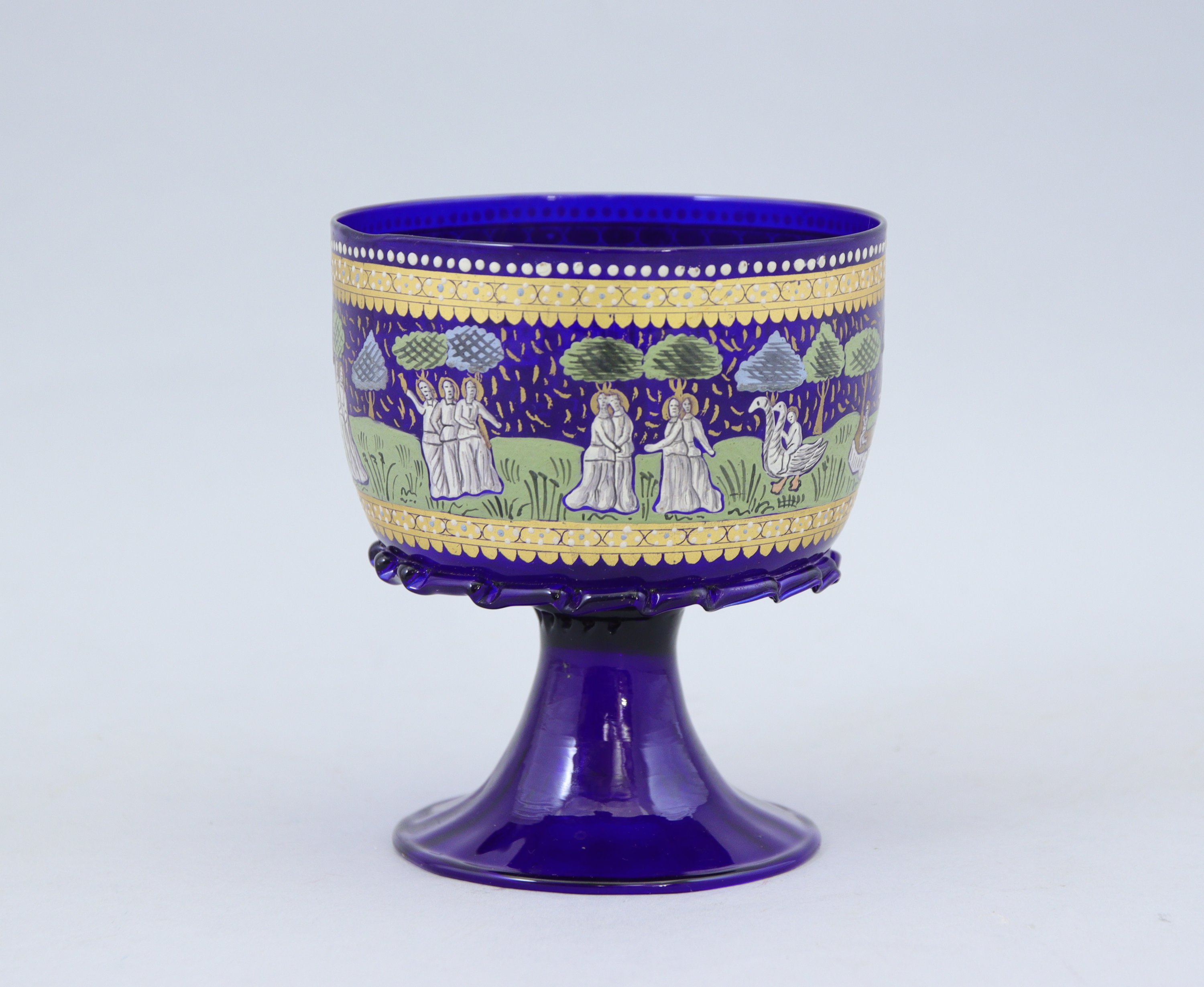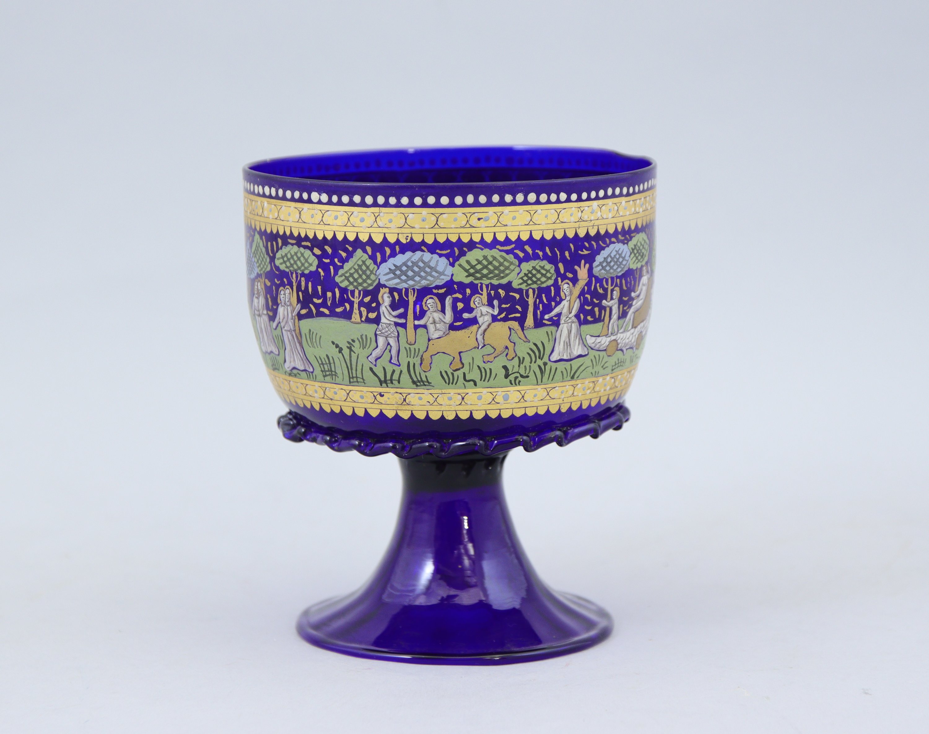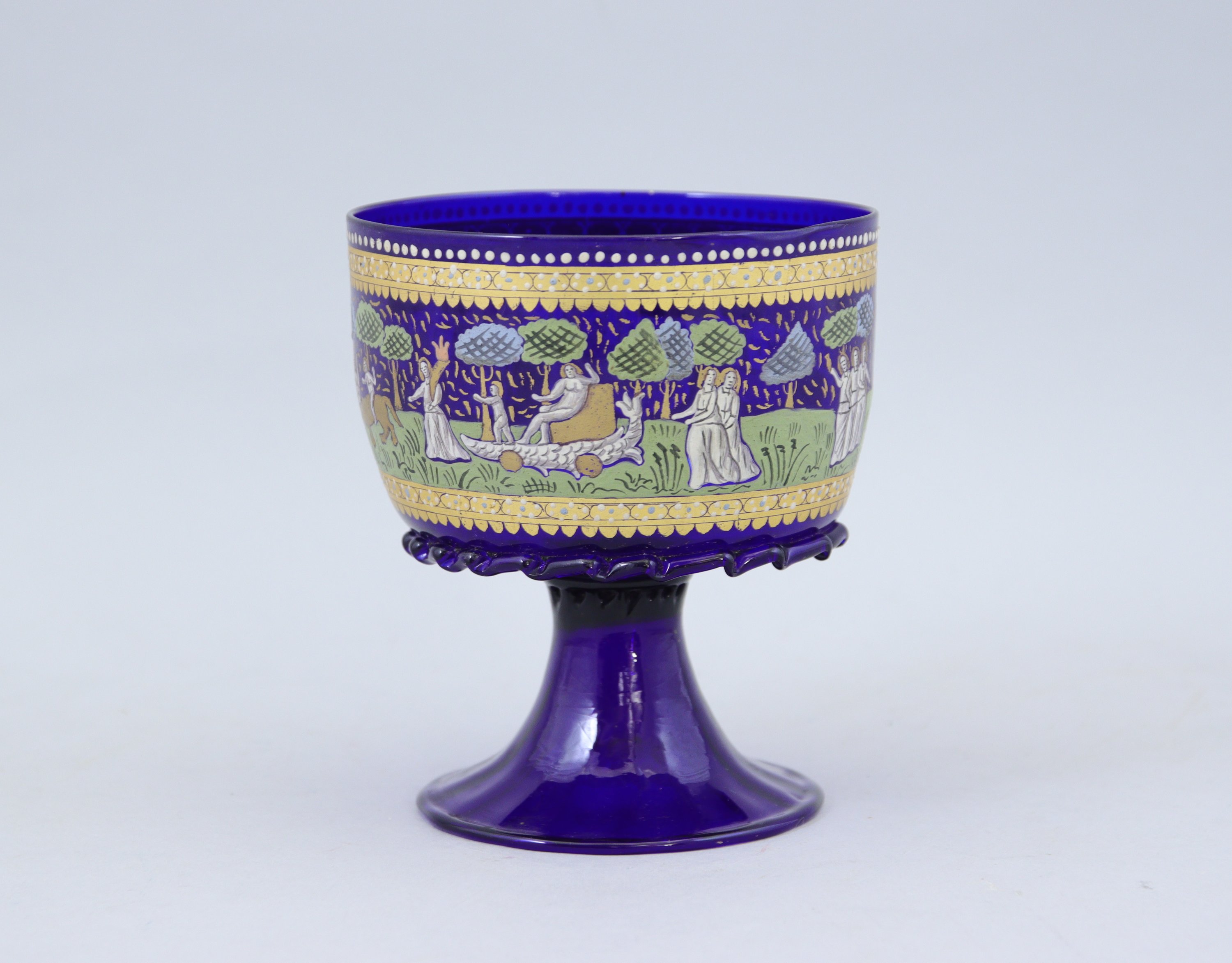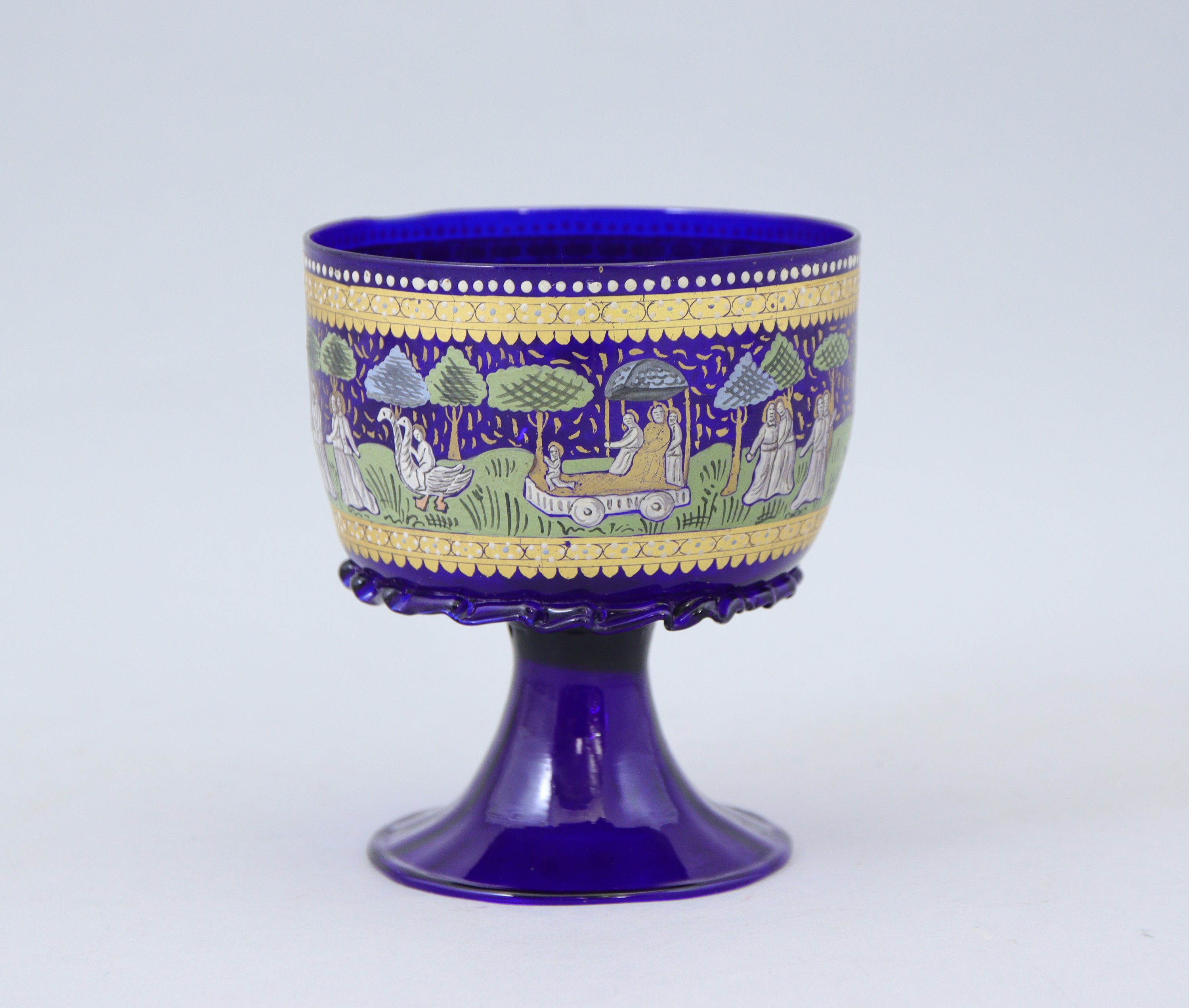 en verre bleu émaillé polychrome et rehauts d’or à décor de chars de triomphe et leurs cortèges.