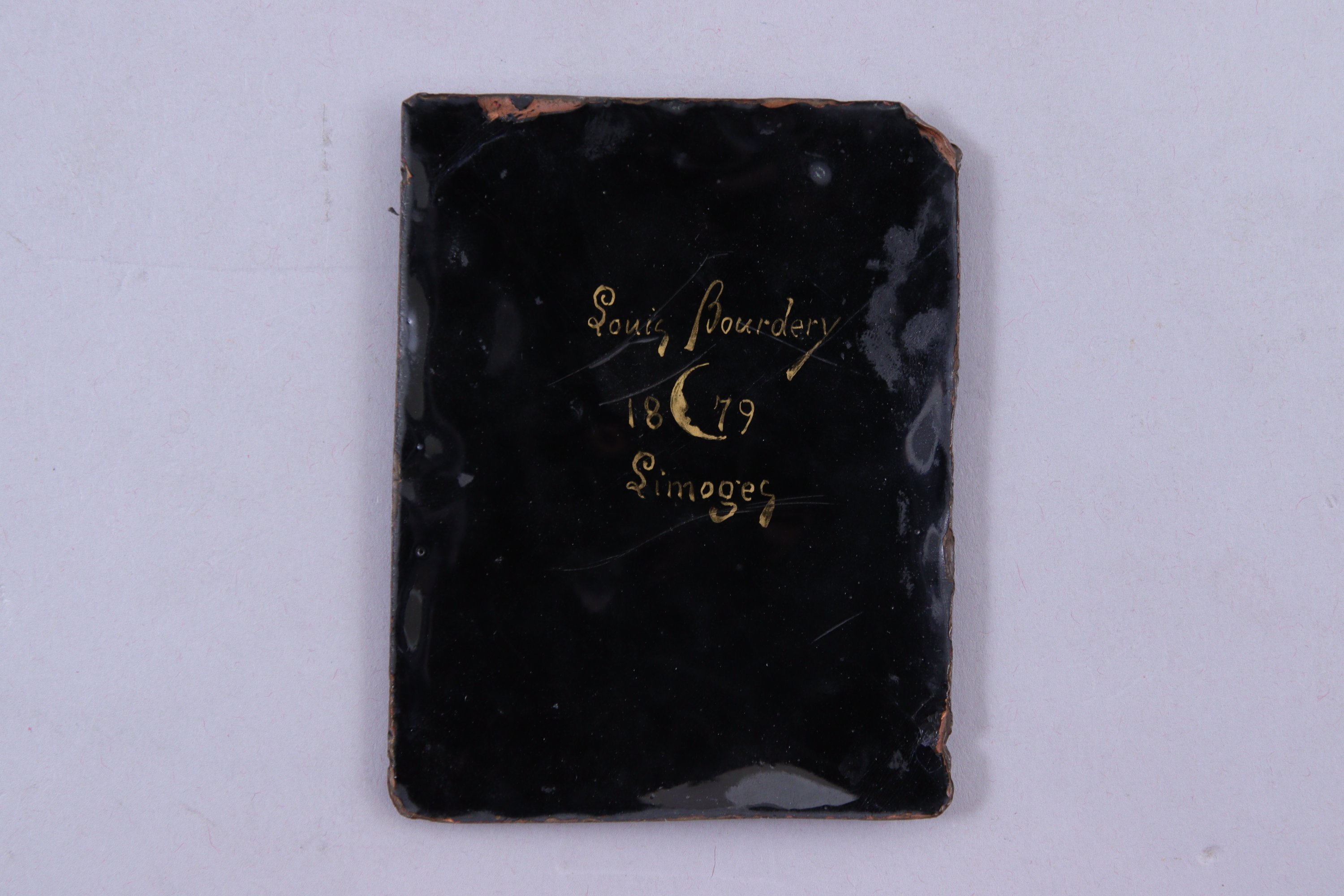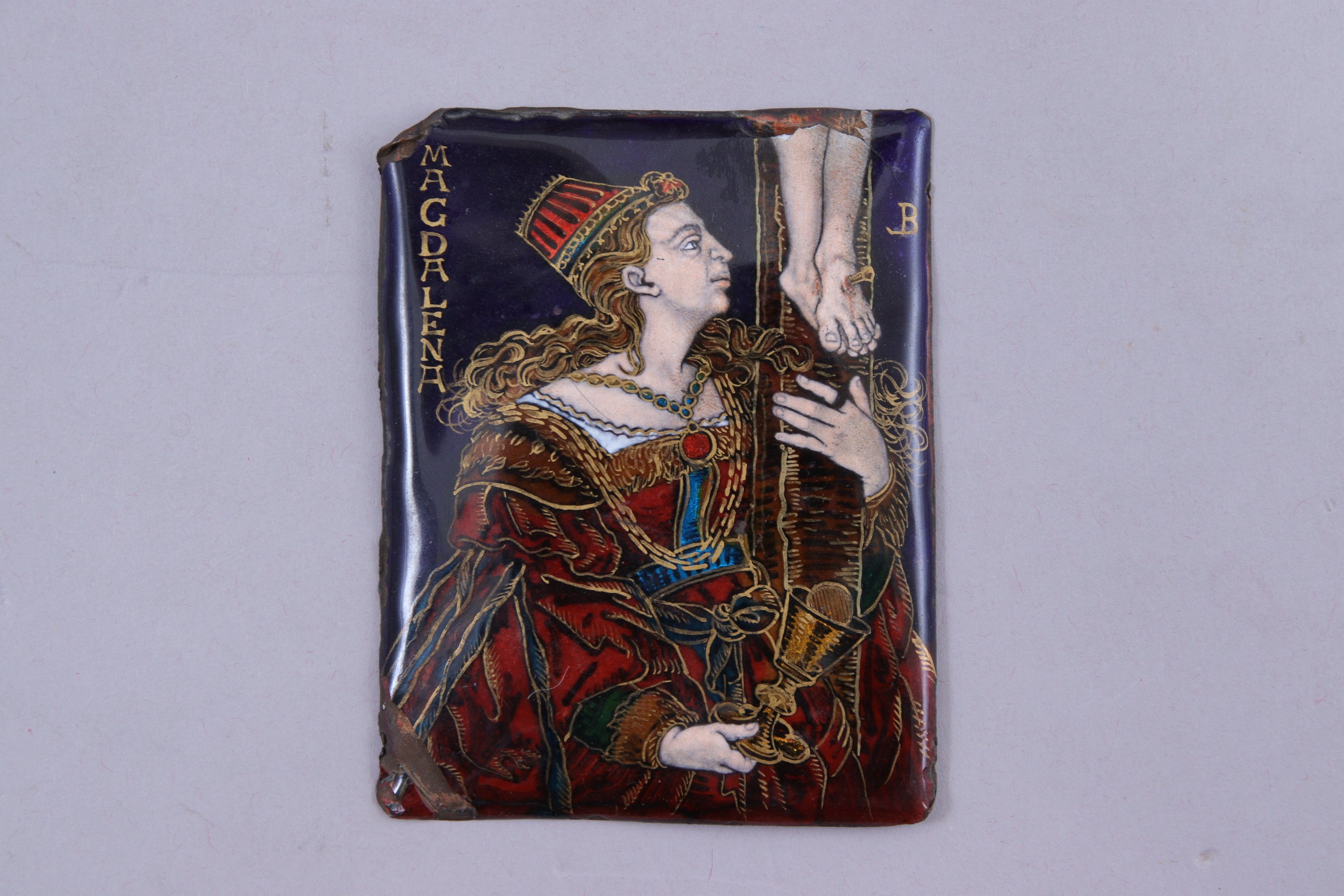 Plaque en émail de Limoges, titrée MAGDALENA et monogrammée "LB" sur la face avant.