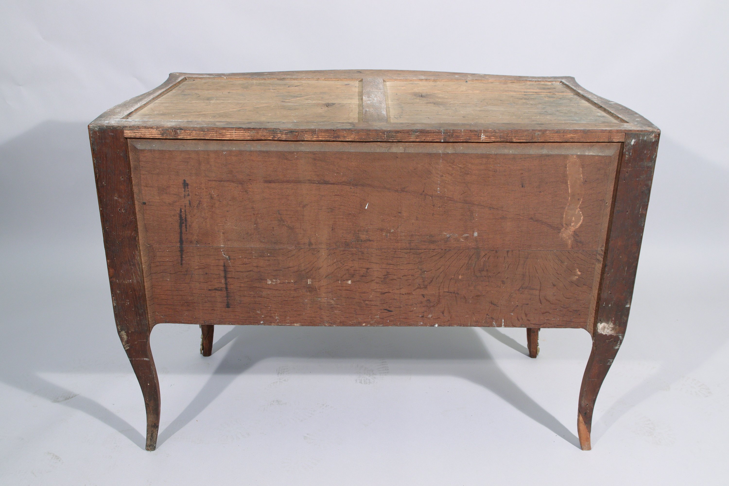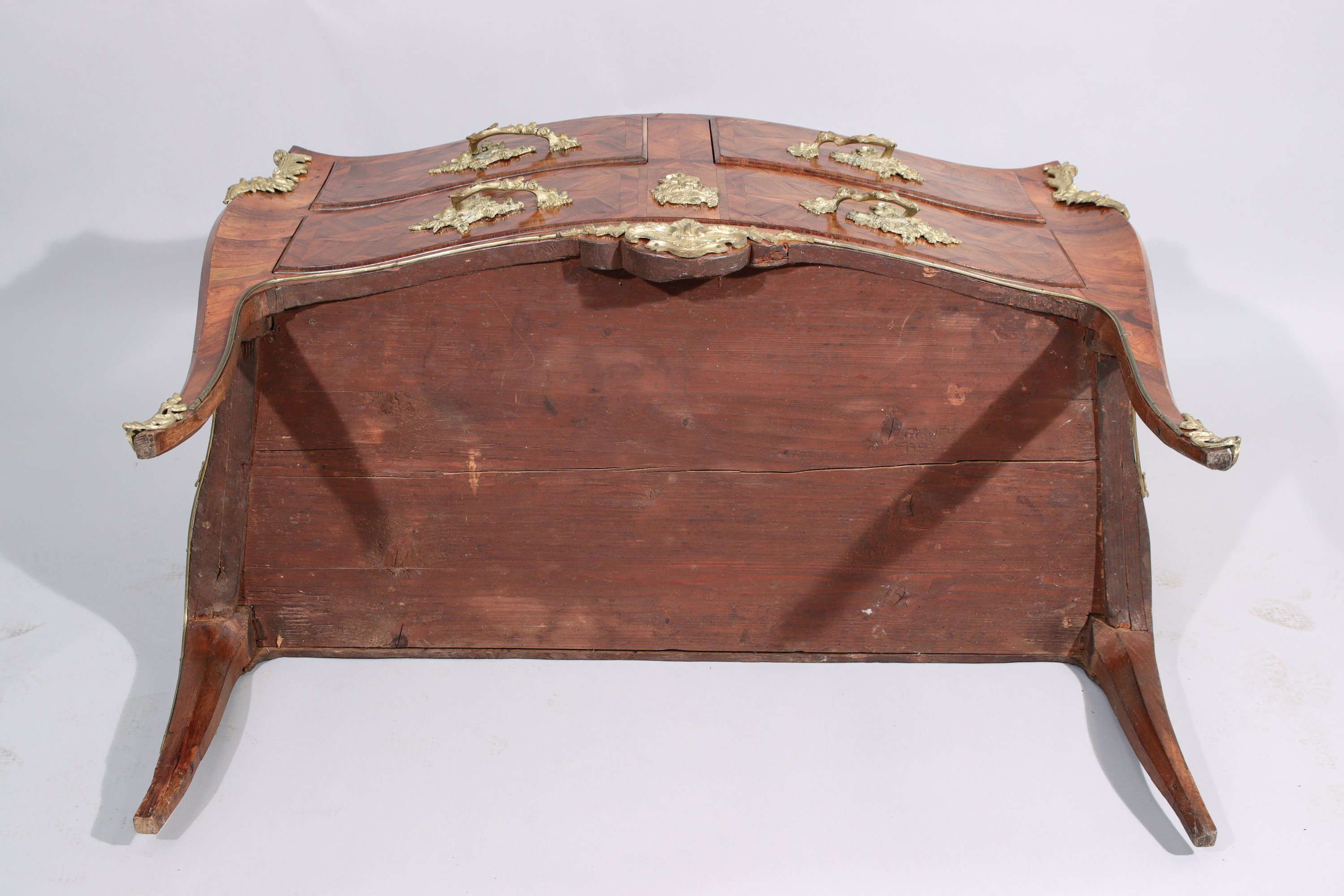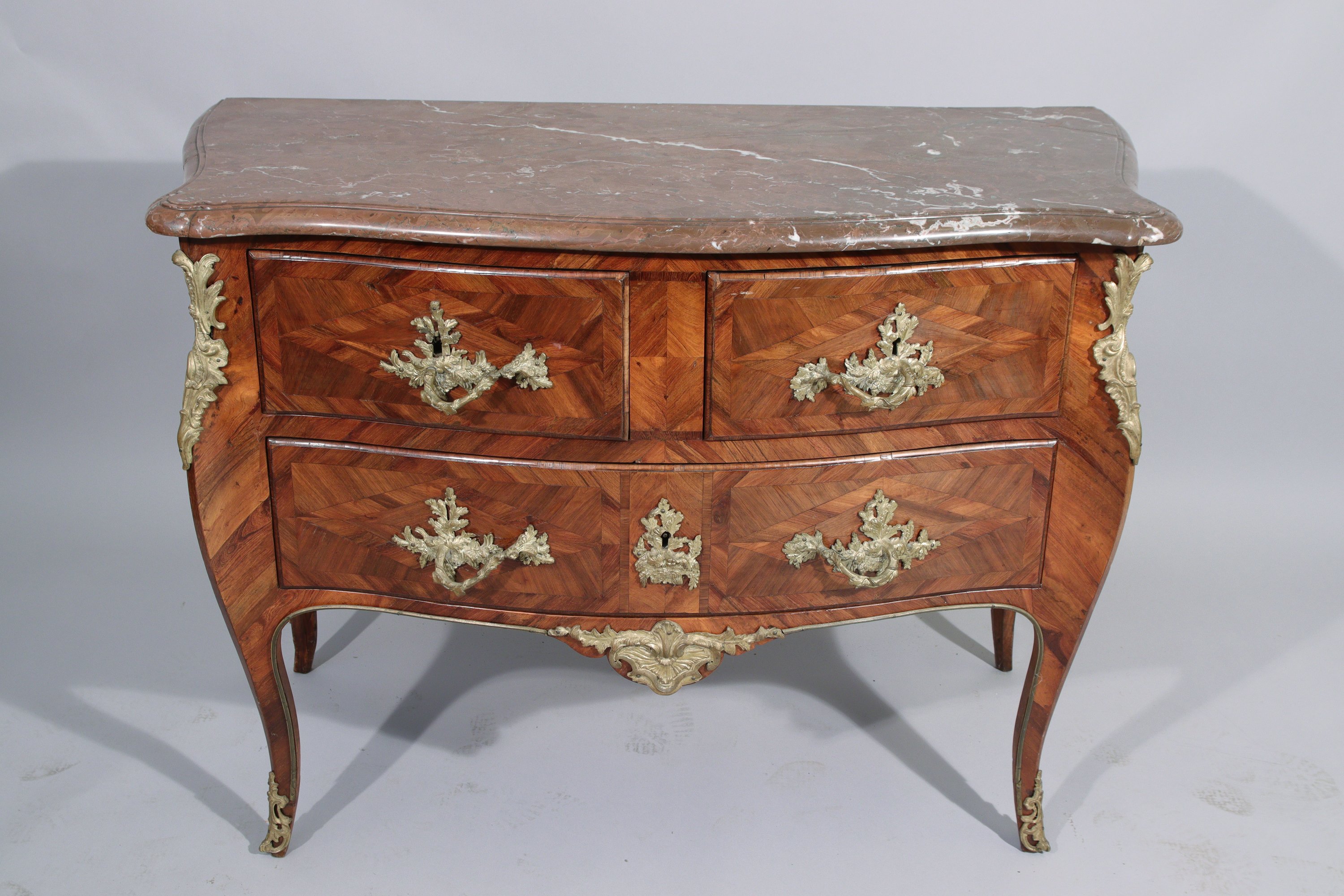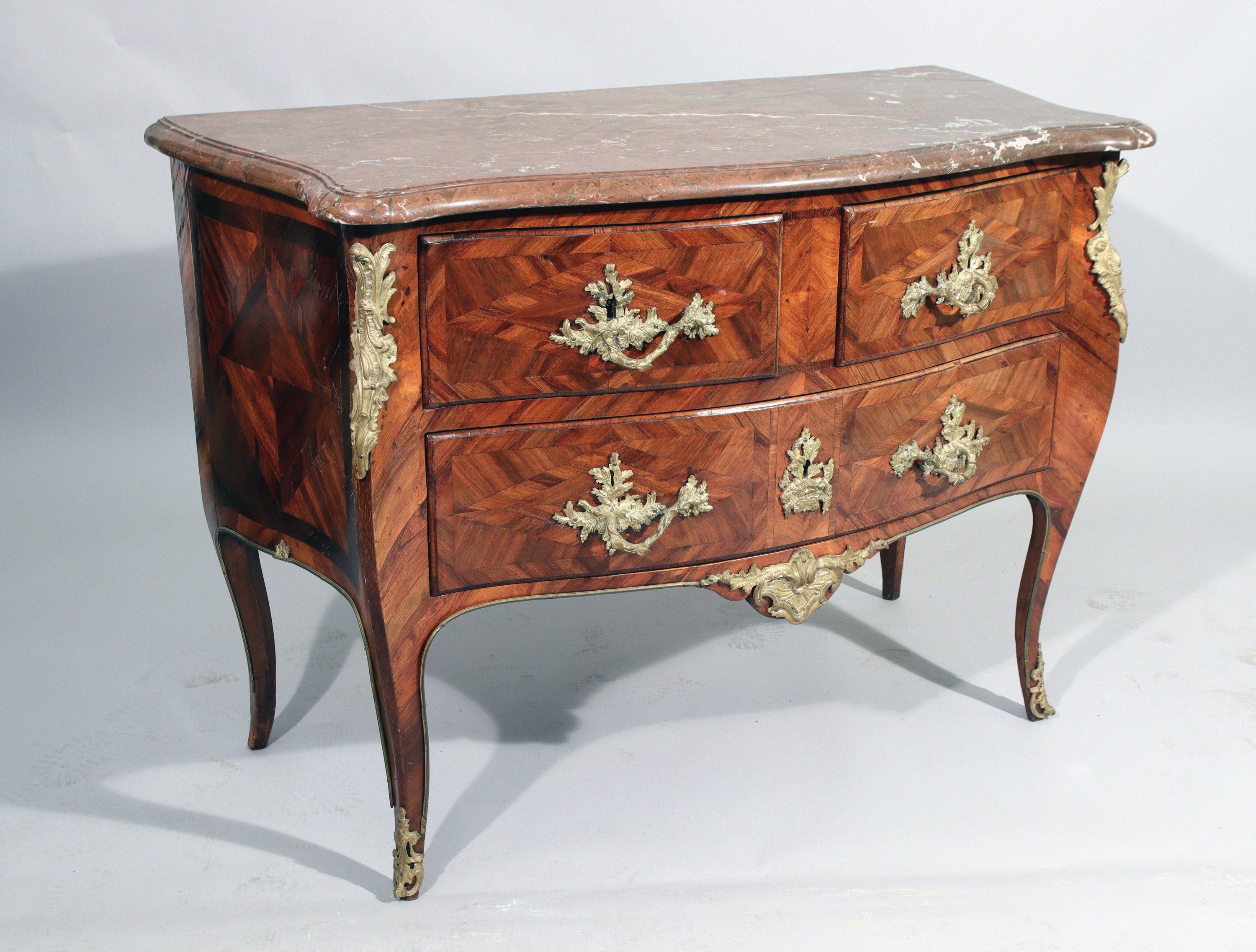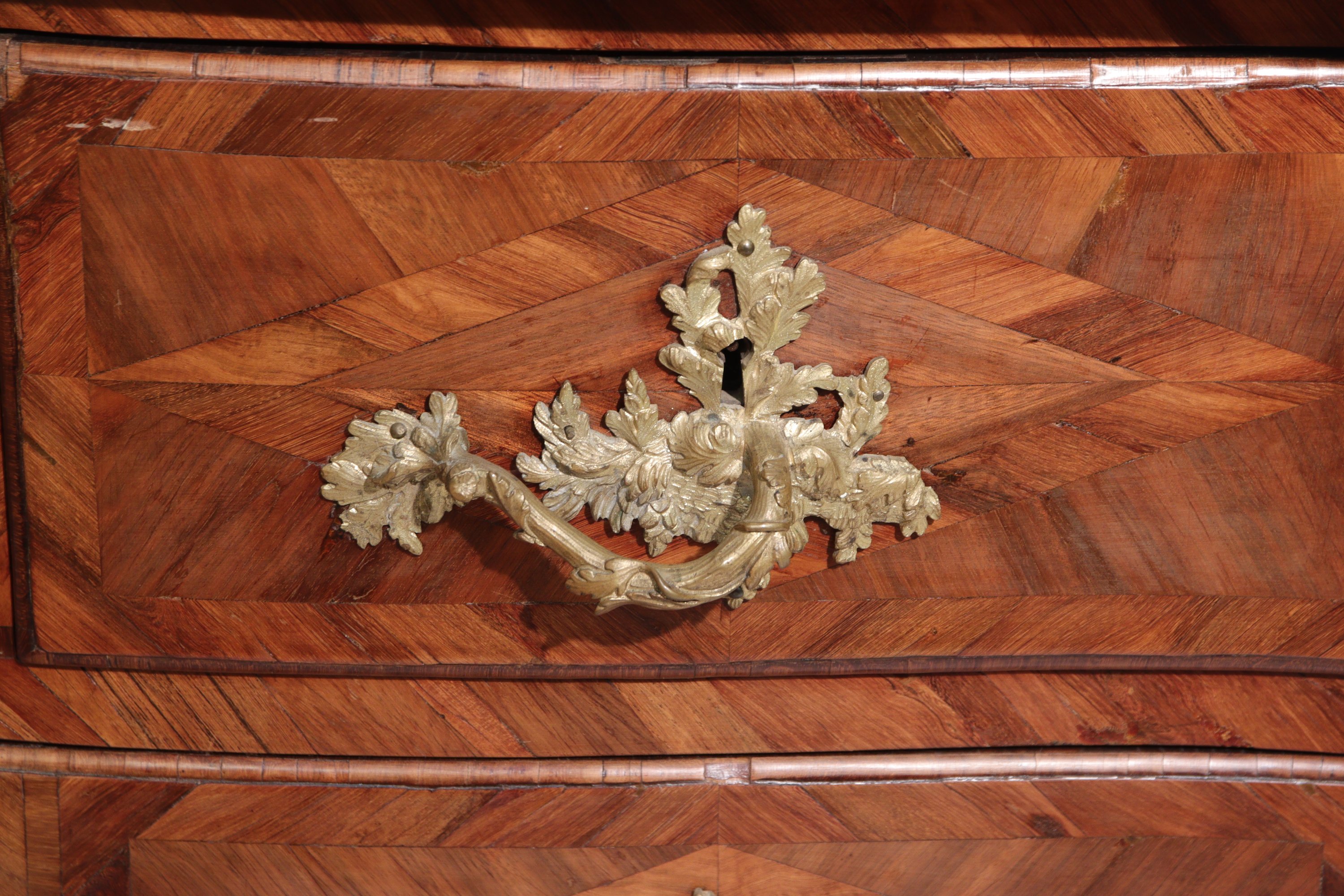 en marqueterie de bois de violette, la façade galbée ouvrant par trois tiroirs sur deux rangs décorés d'une marqueterie de losange. Les montants galbés se prolongent par quatre pieds courbés. Riche ornementation de bronze doré comme poignées de tirage fixes décorées de feuilles et prise en forme de tronc d'arbre simulé, chutes d'angle, sabots et tablier.