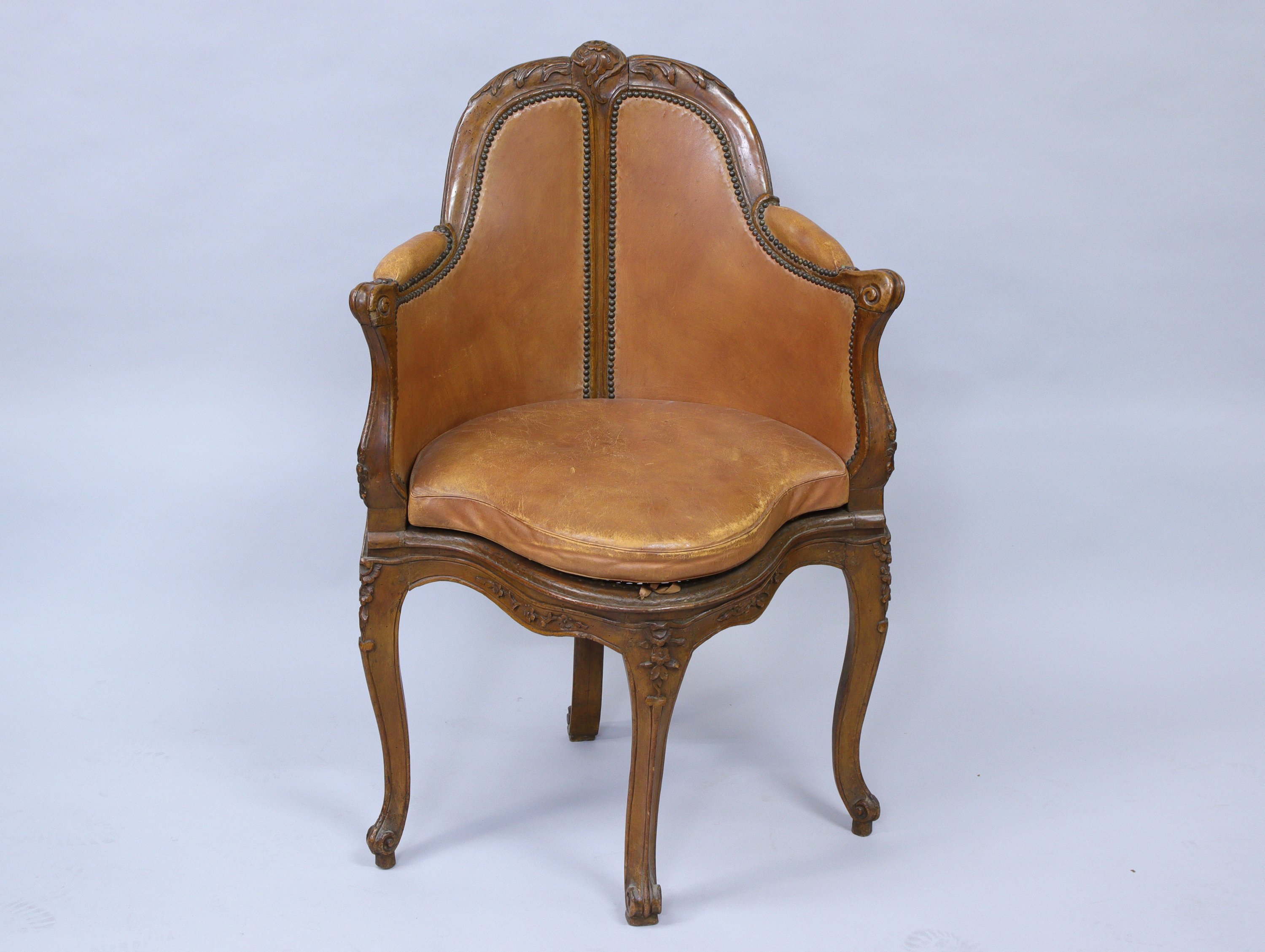de forme galbée, en bois mouluré et sculpté. Le dossier de forme gondole est décoré à l'amortissement de feuilles d'acanthe entourant un cartouche rocaille. Les accotoirs à manchettes reposent sur des consoles mouvementées. La ceinture à ressaut reprend le décor supérieur. Il repose sur quatre pieds cambrés terminés en enroulement.