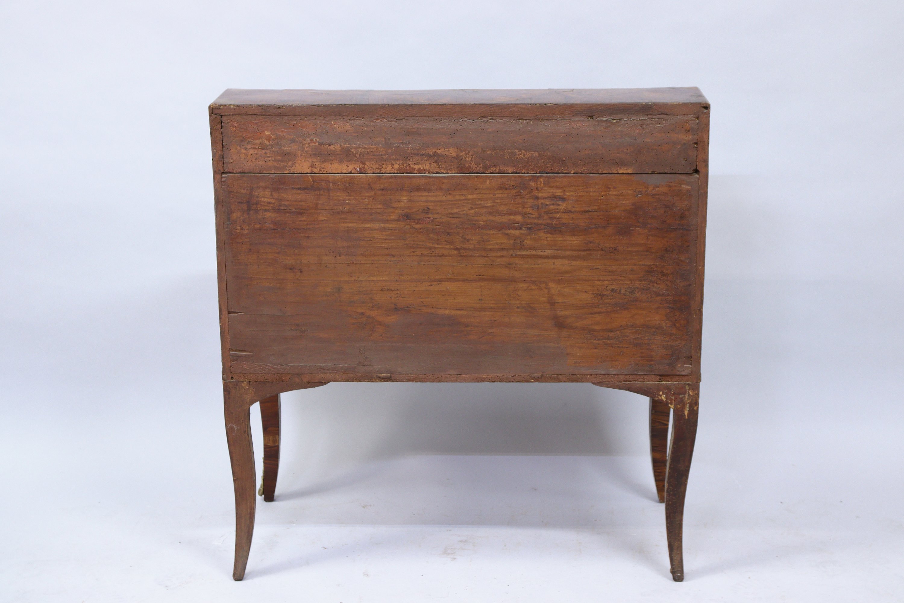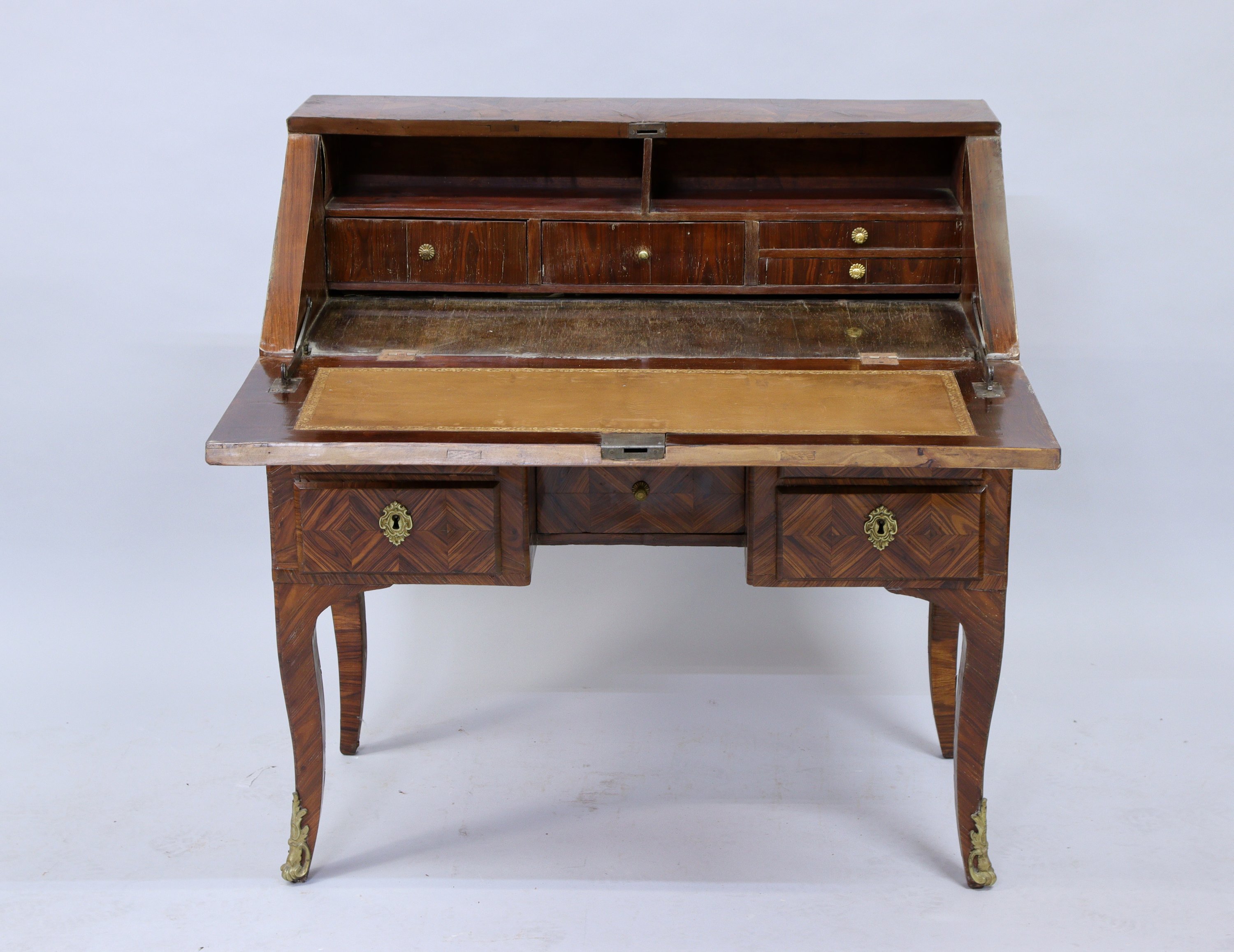en placage de palissandre, ouvrant par un abattant décoré d'une marqueterie de quatre cercles. L'intérieur comprend quatre tiroirs et deux compartiments. Le plateau couvert d'un cuir décoré au petit fer. La ceinture ouvre par quatre tiroirs sur deux rangs entourant deux tiroirs dans le retrait. Il repose sur quatre pieds cambrés.