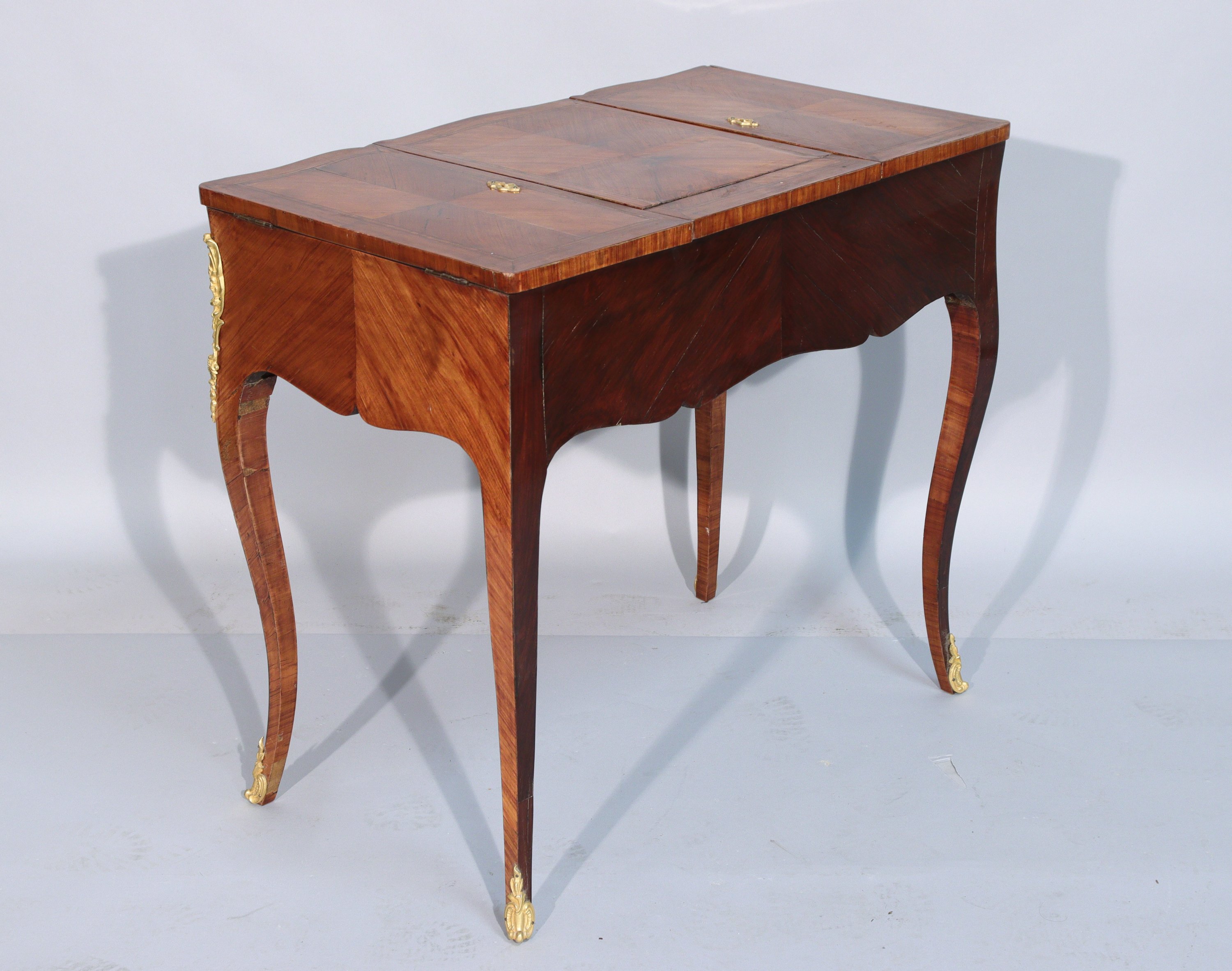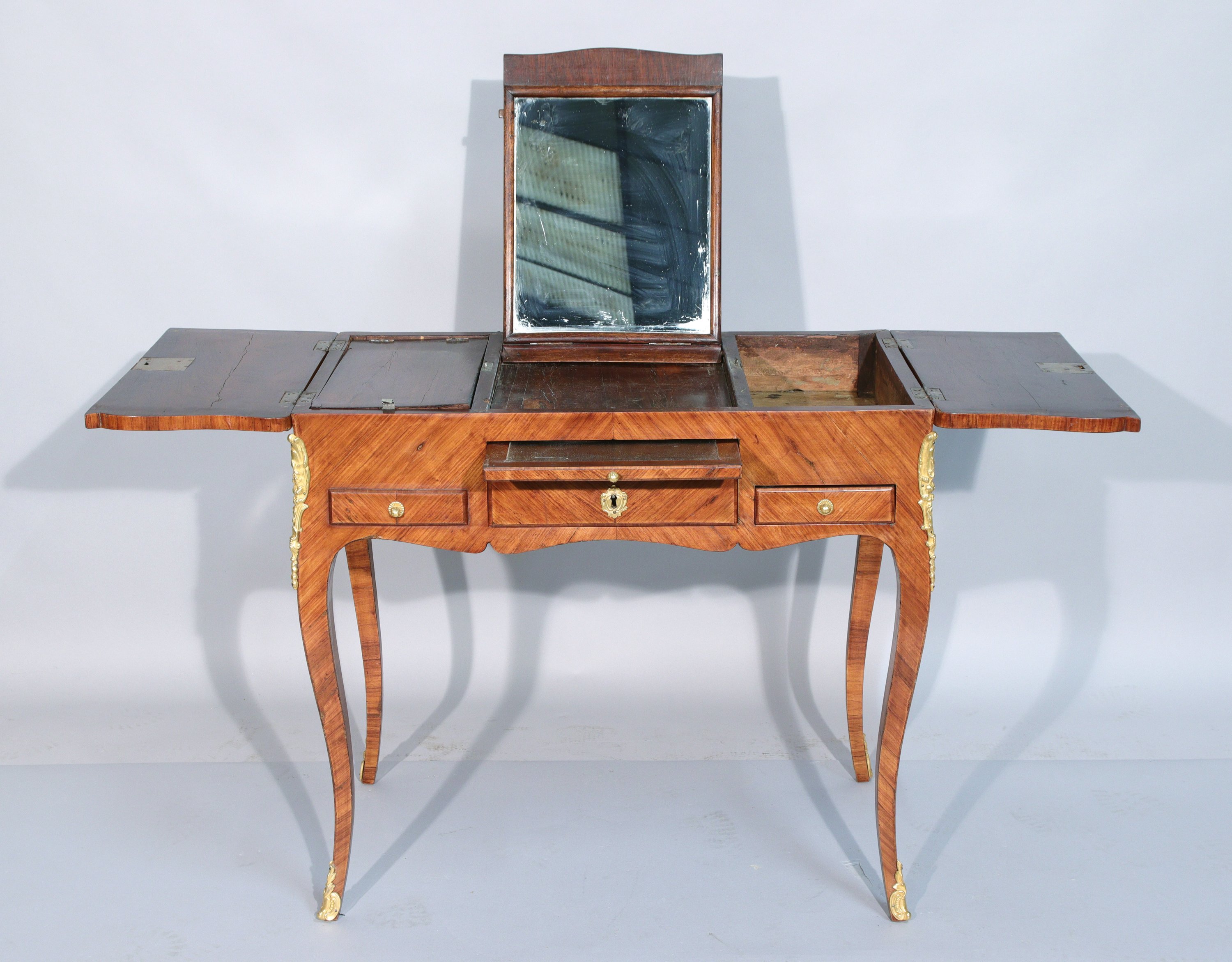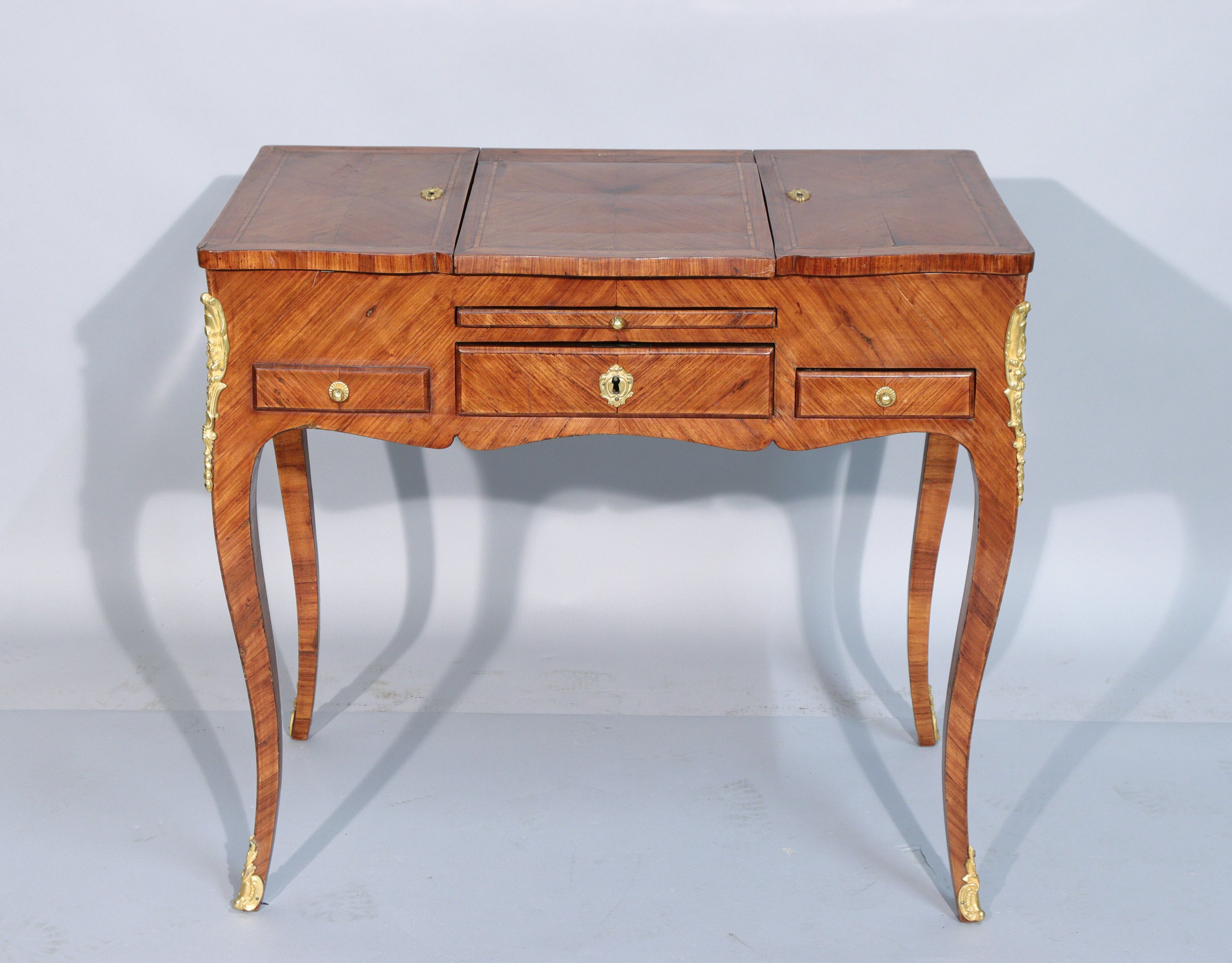 en marqueterie de bois de rose et frisage en X entouré de filet, le plateau s'ouvrant par deux volets, la partie centrale découvrant un miroir, la ceinture composée de trois tiroirs et une tablette garnie d'un cuir noir. Elle repose sur quatre pieds cambrés.