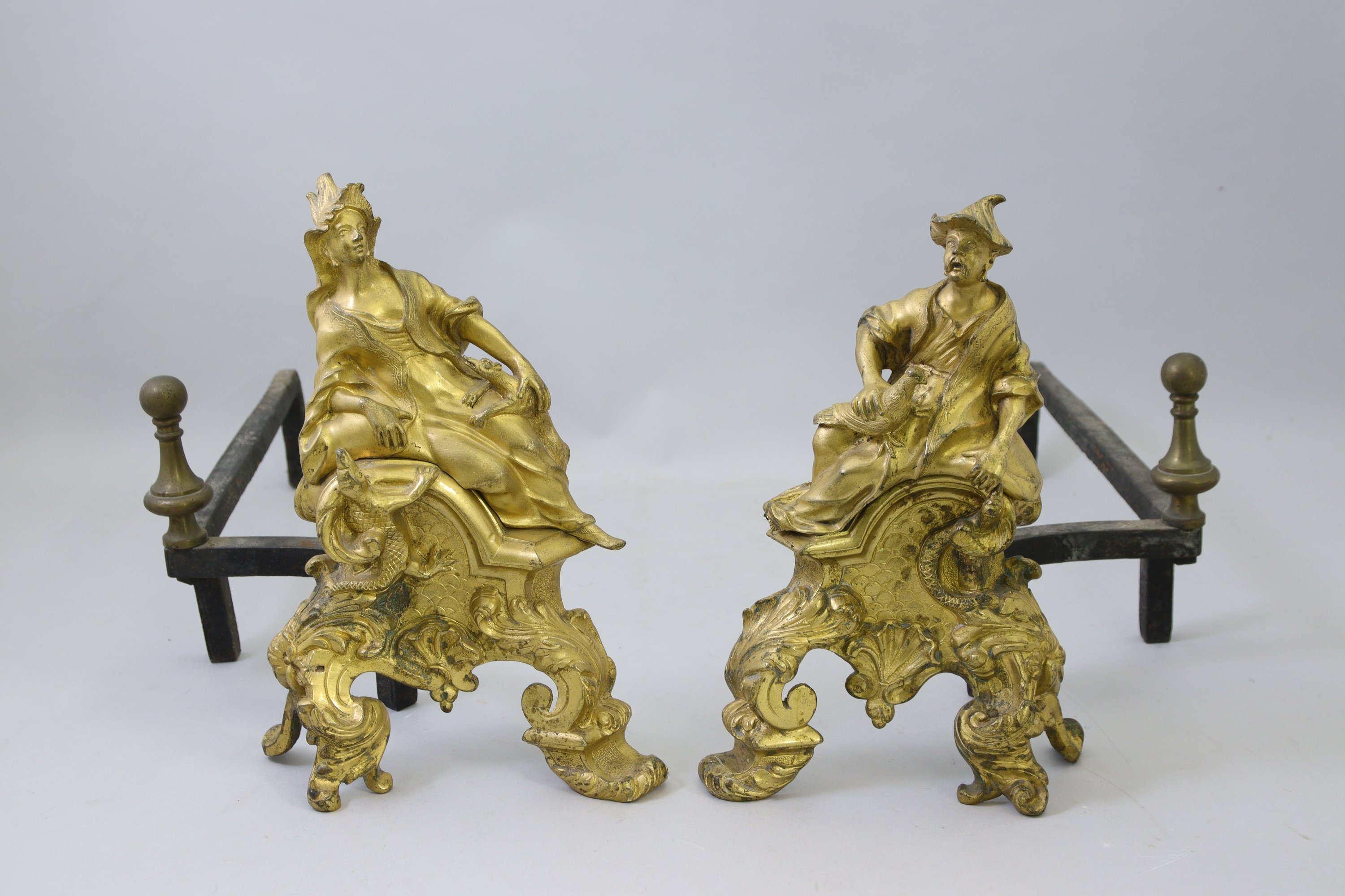 en bronze doré, ciselé, bruni et amati. L'homme et la femme sont coiffés de chapeaux. Lui tient dans sa main un oiseau, elle est entourée d'un reptile et un pangolin. La base est décorée de motifs imitant l'écaille et comprenant trois pieds mouvementés richement ornés de feuilles d'acanthe et coquilles. Les fers sont décorés de toupie.