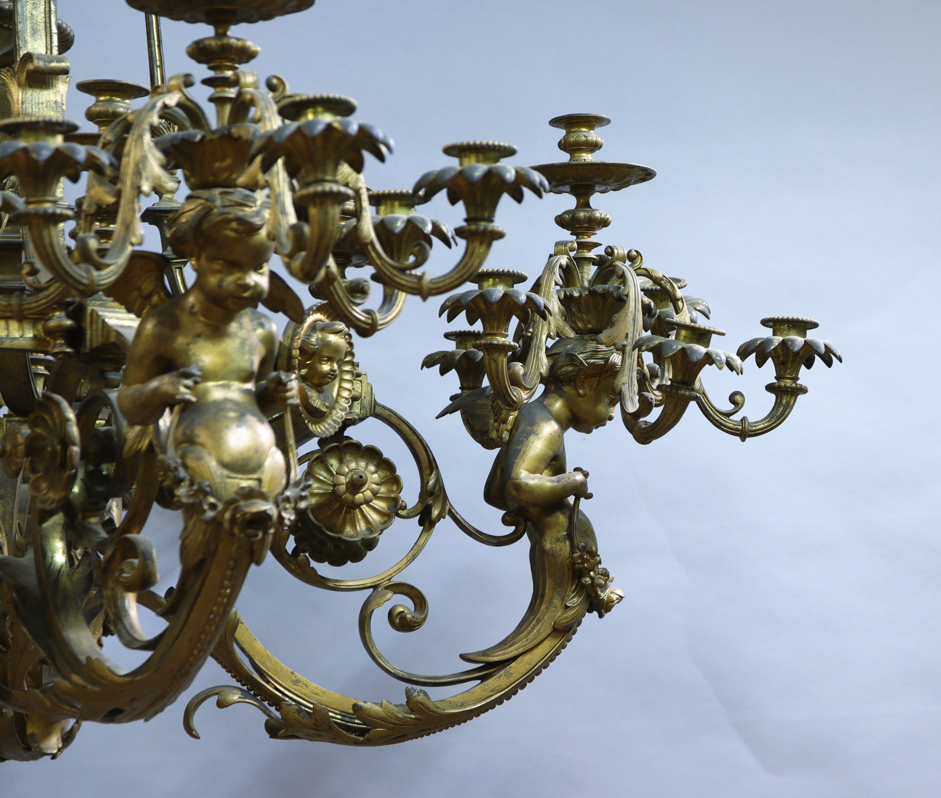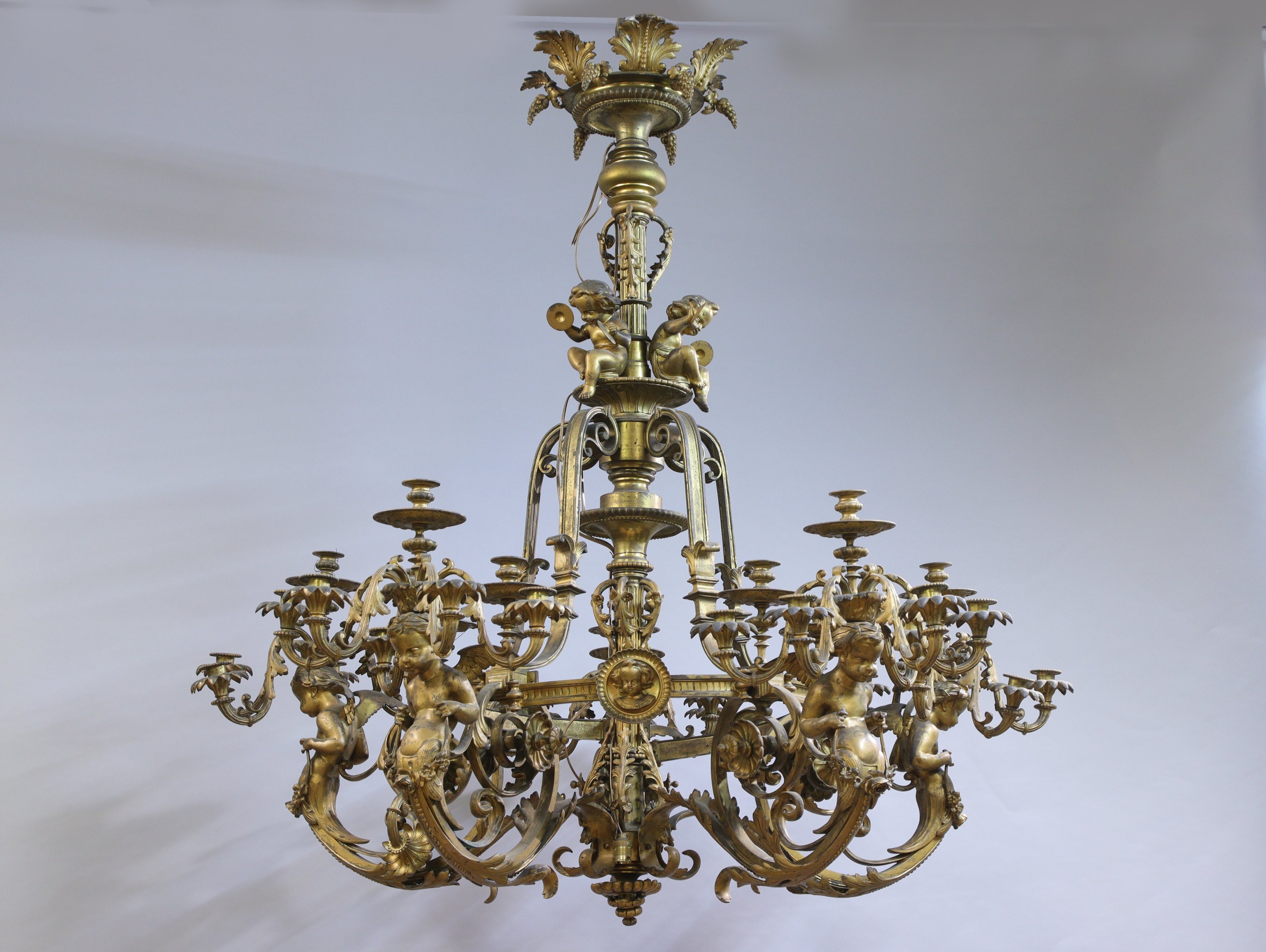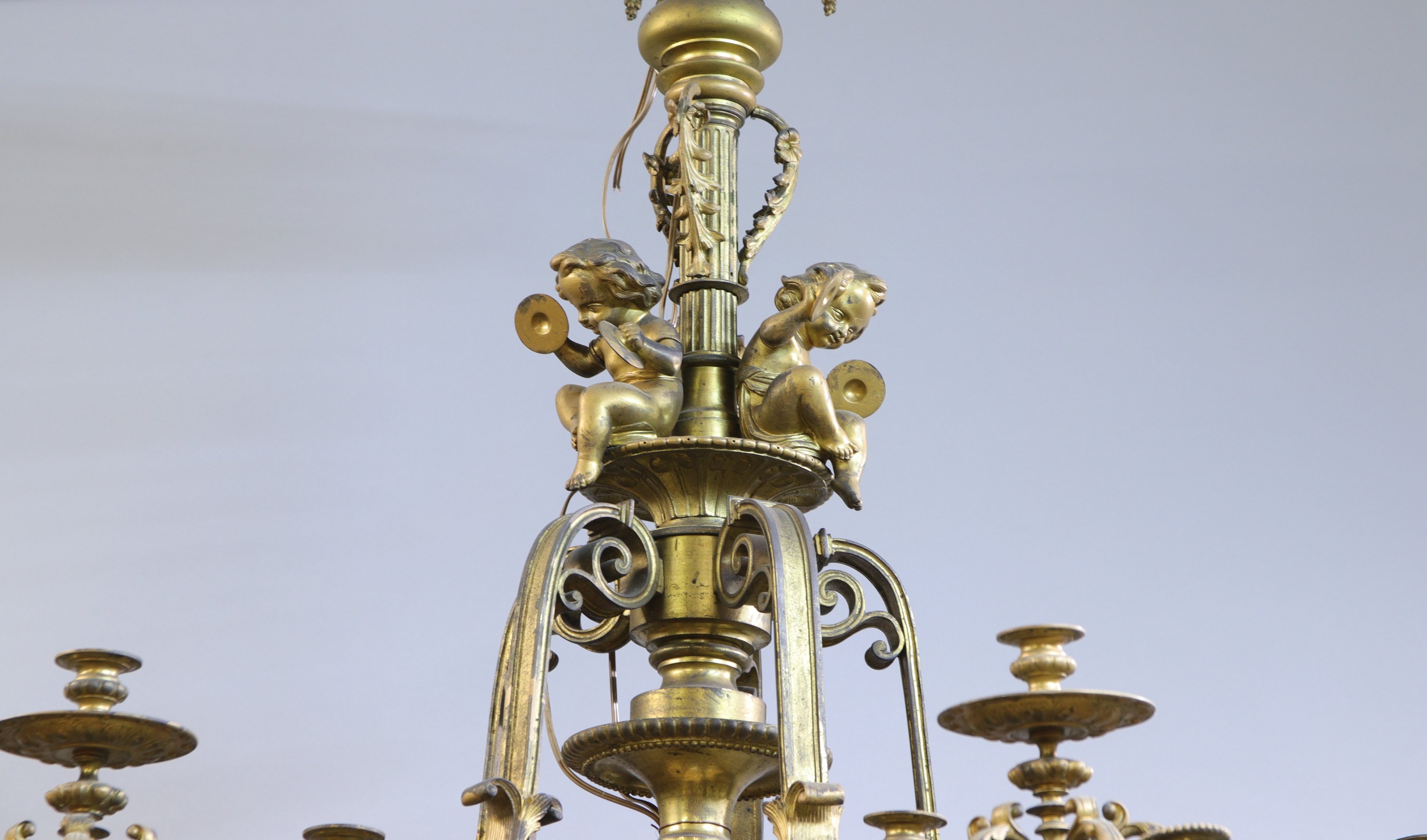 Les lustres à décor de joueurs de cymbales, flûtes, trompettes existent depuis le XVIIème siècle. Le château de Versailles conserve lun des premiers exemplaires dit « aux joueurs de trompette ». Ces lustres à décor denfants musiciens deviennent dès lors les modèles les plus luxueux. Et cela perdure de manière constante avec le style Louis XVI. Parmi les grands tenants de ce répertoire ornemental, citons Pierre Gouthière, dont le lustre réalisé pour le cabinet doré du château de Versailles présente trois enfants jouant de la trompe autour du fût central. Notre lustre, réalisé durant la seconde moitié du XIXe siècle, s'inspire de ces productions baroques et néo-classiques des XVIIème et XVIIIème siècles. Il témoigne de ce spectaculaire Second Empire par le foisonnement de son luxueux décor éclectique de joueurs de cymbales.