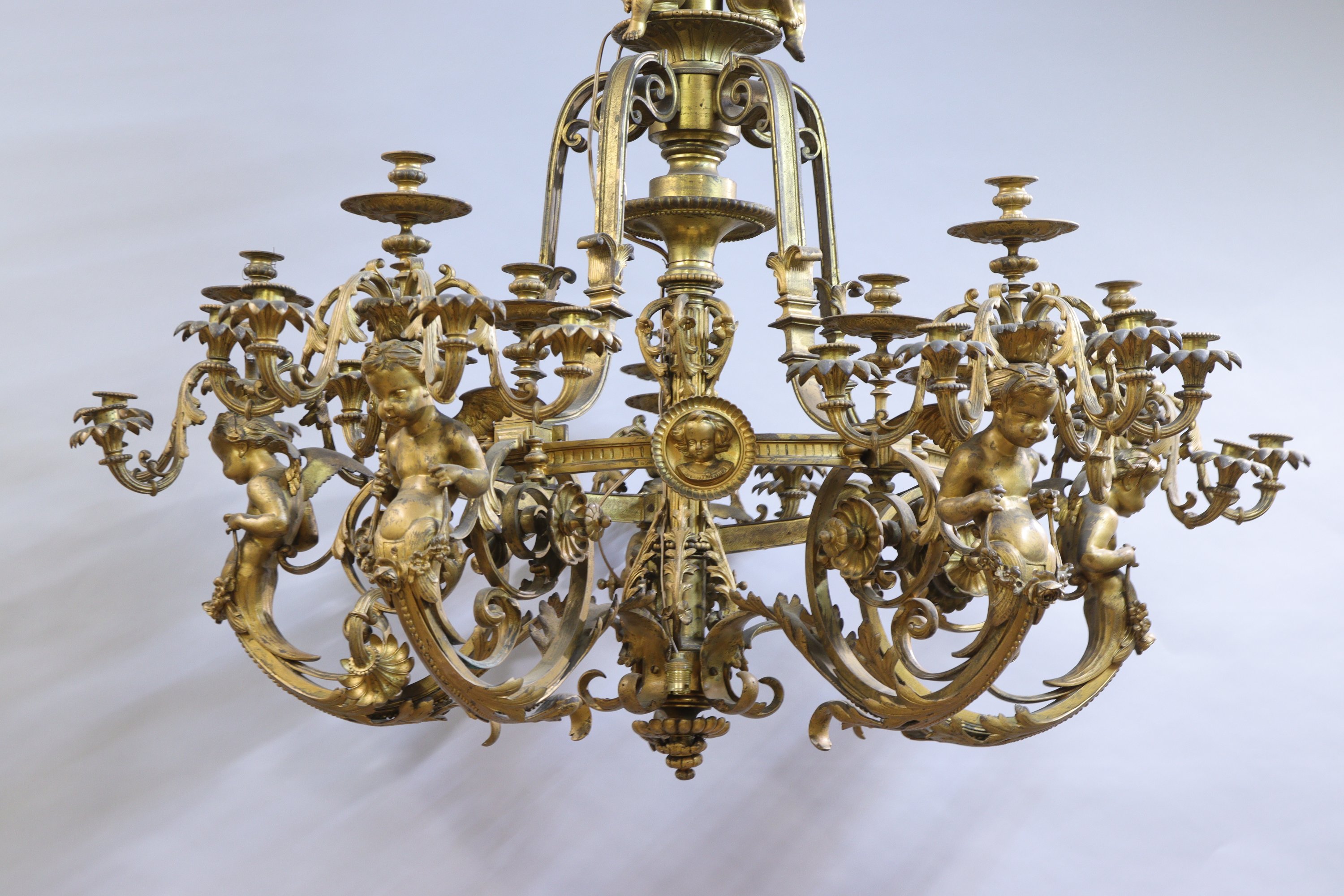 en bronze doré, ciselé et amati à 35 lumières. La petite couronne est décorée de grappes de raisin en alternance de feuilles d'acanthe. Trois putti aux cymbales entourent la colonne cannelée supportant cinq bras de lumière en enroulements terminés par des angelots tenant chacun une guirlande de fleurs. Cinq médaillons aux portraits d'enfants rythment la couronne centrale.