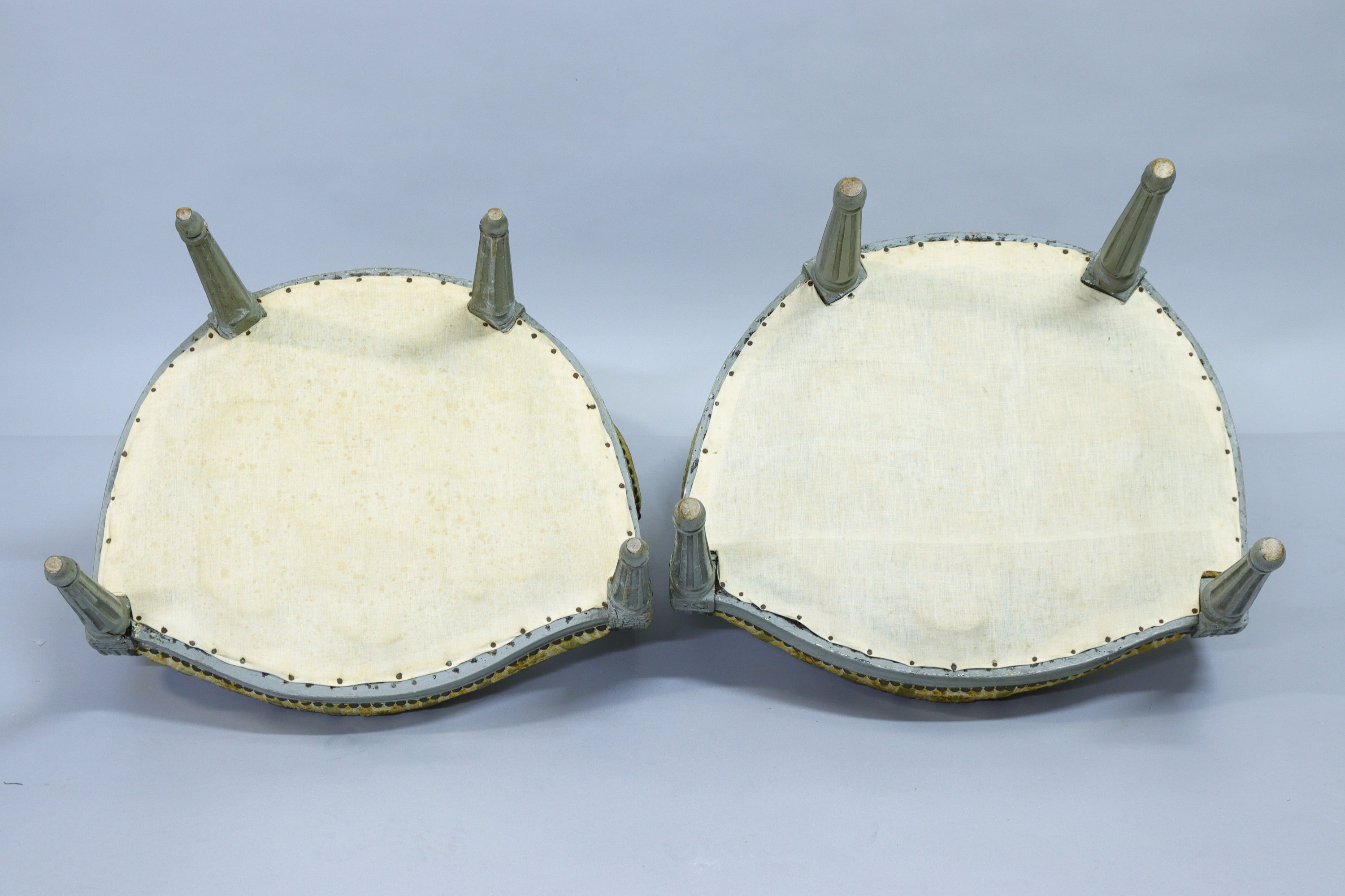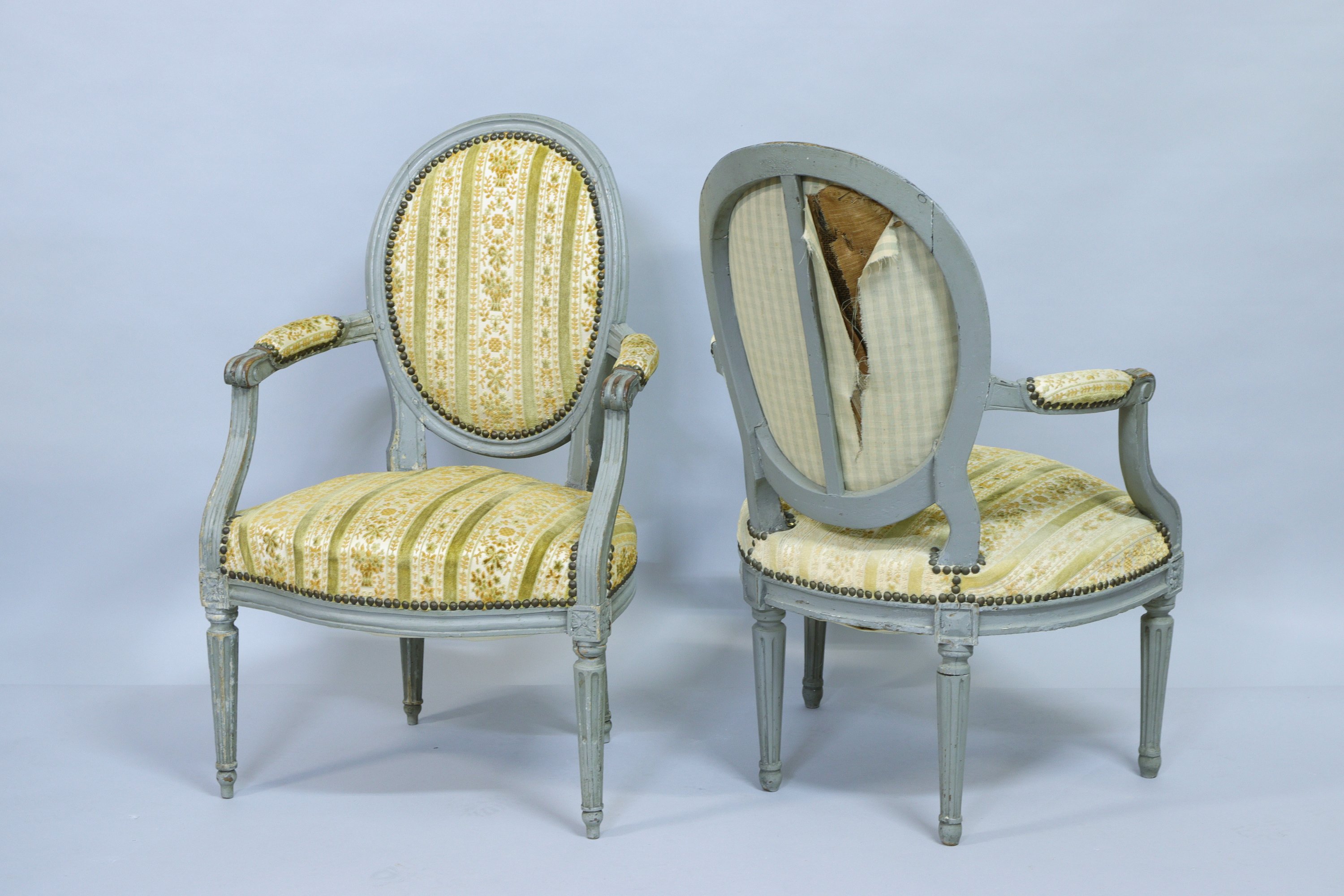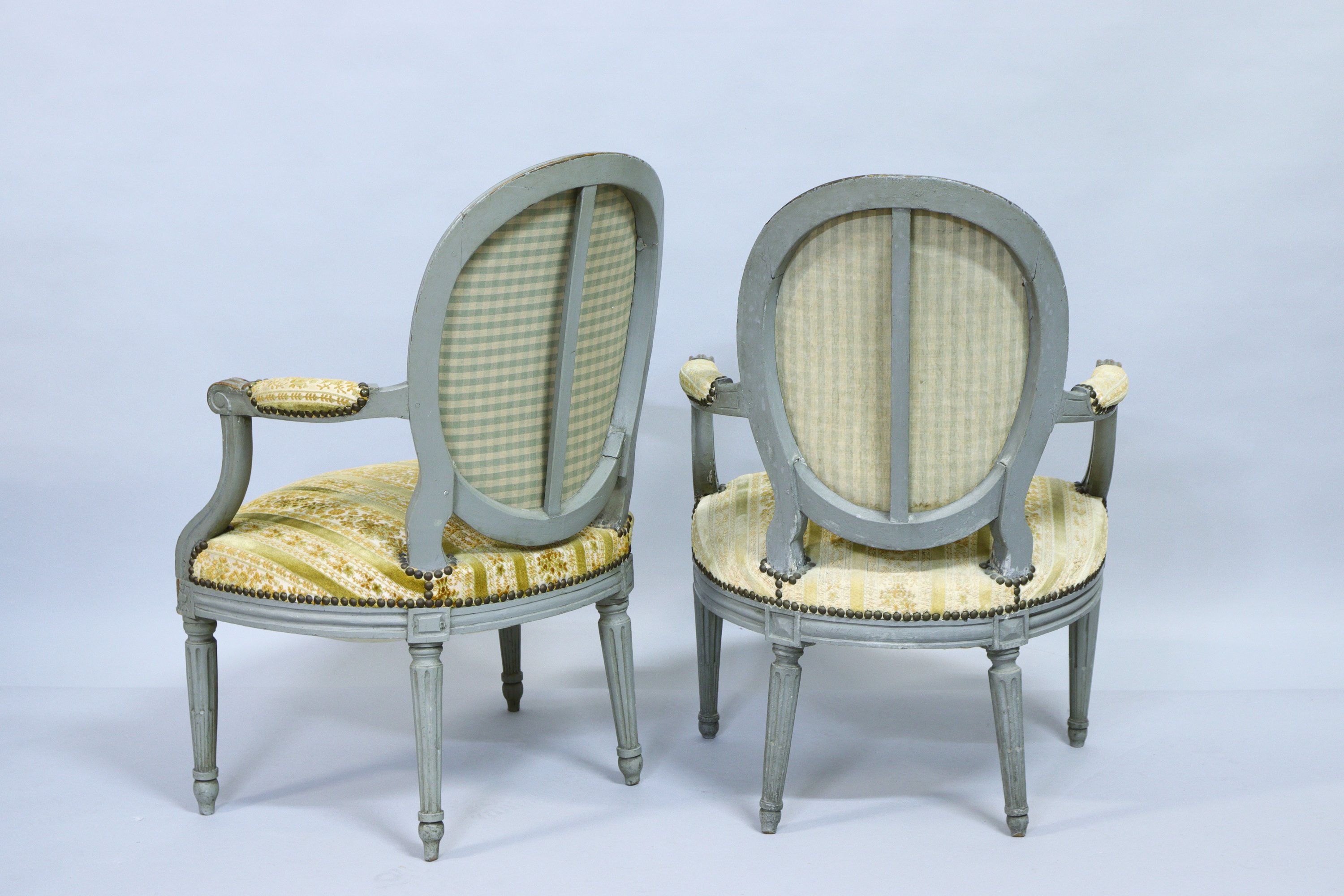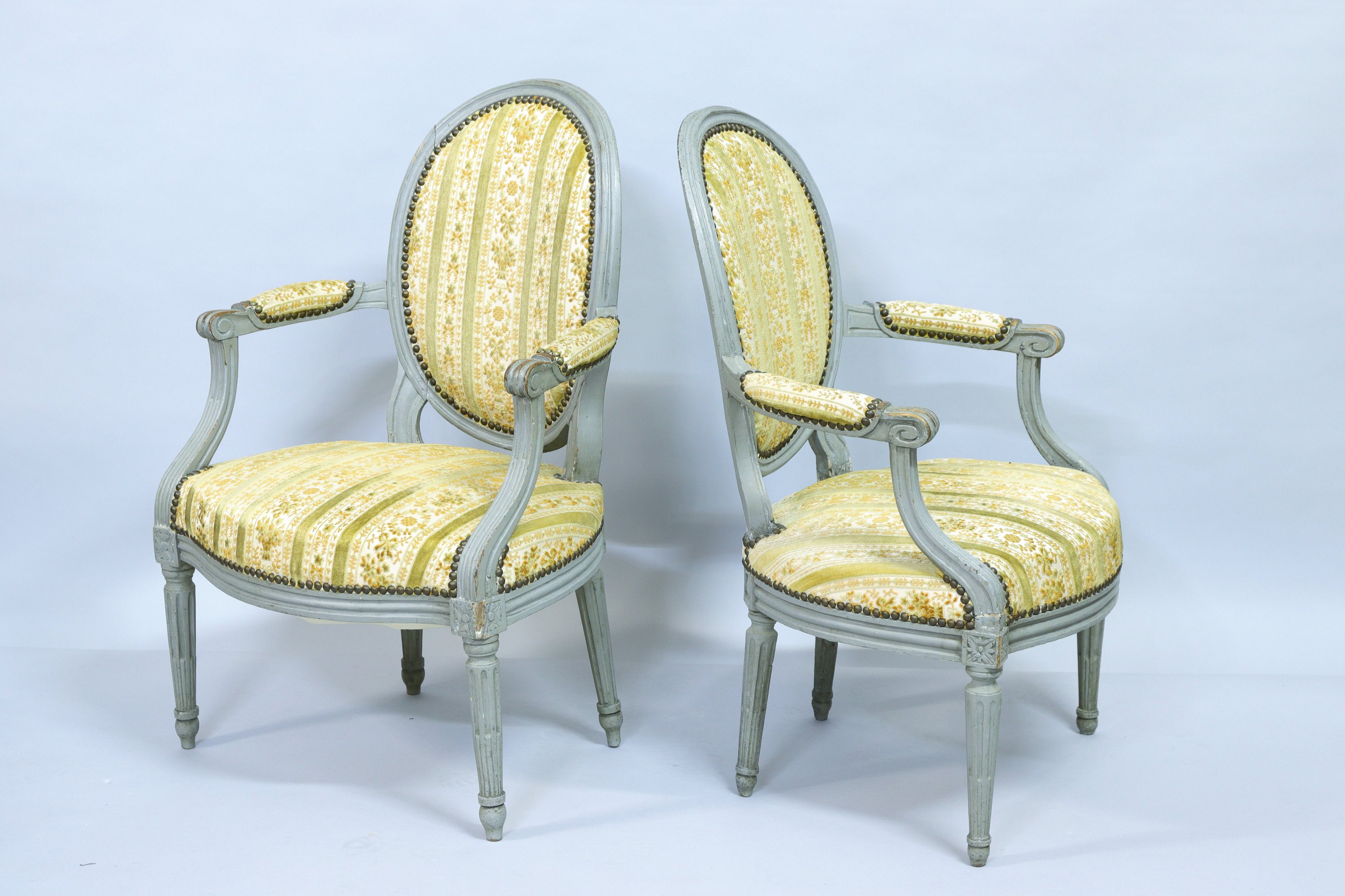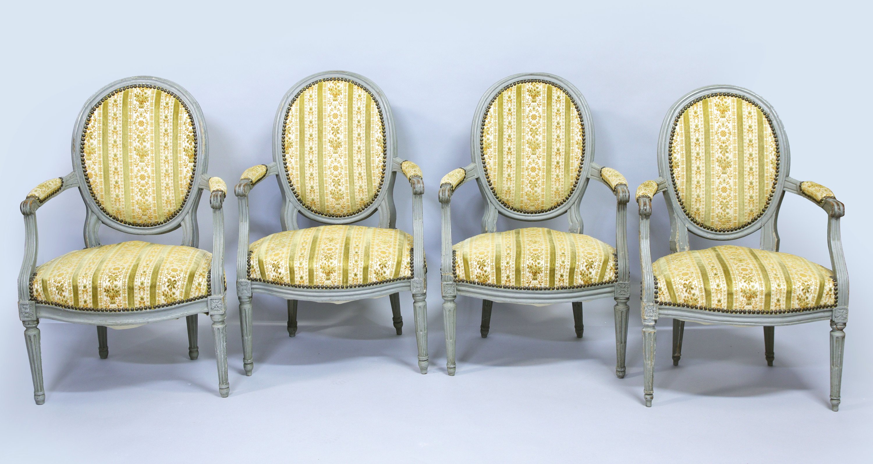 en hêtre mouluré, sculpté et laqué gris. Les accotoirs à manchettes reposent sur des supports en console cannelés, les dès de raccordement ornés de fleurettes. Quatre pieds fuselés, cannelés et rudentés.