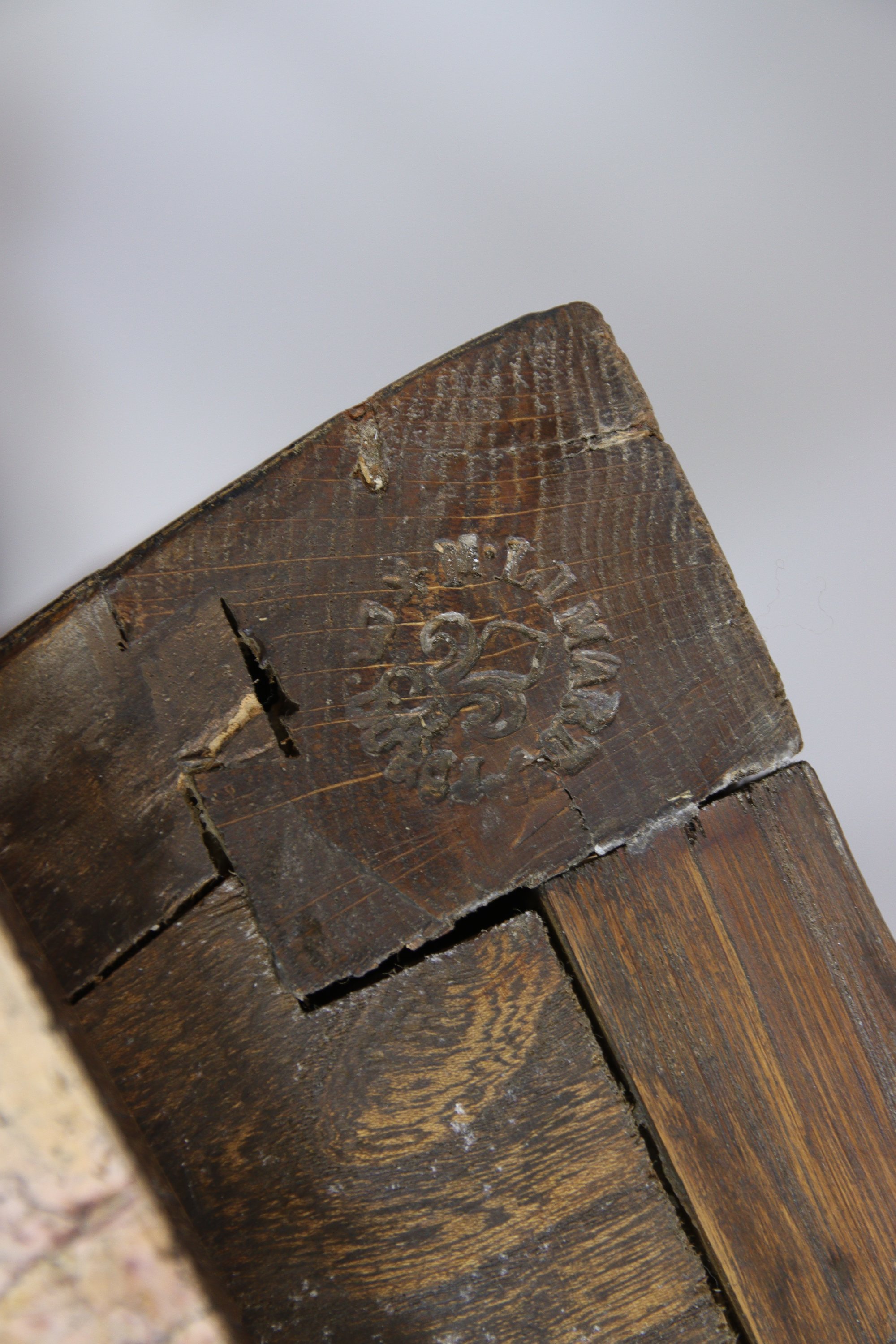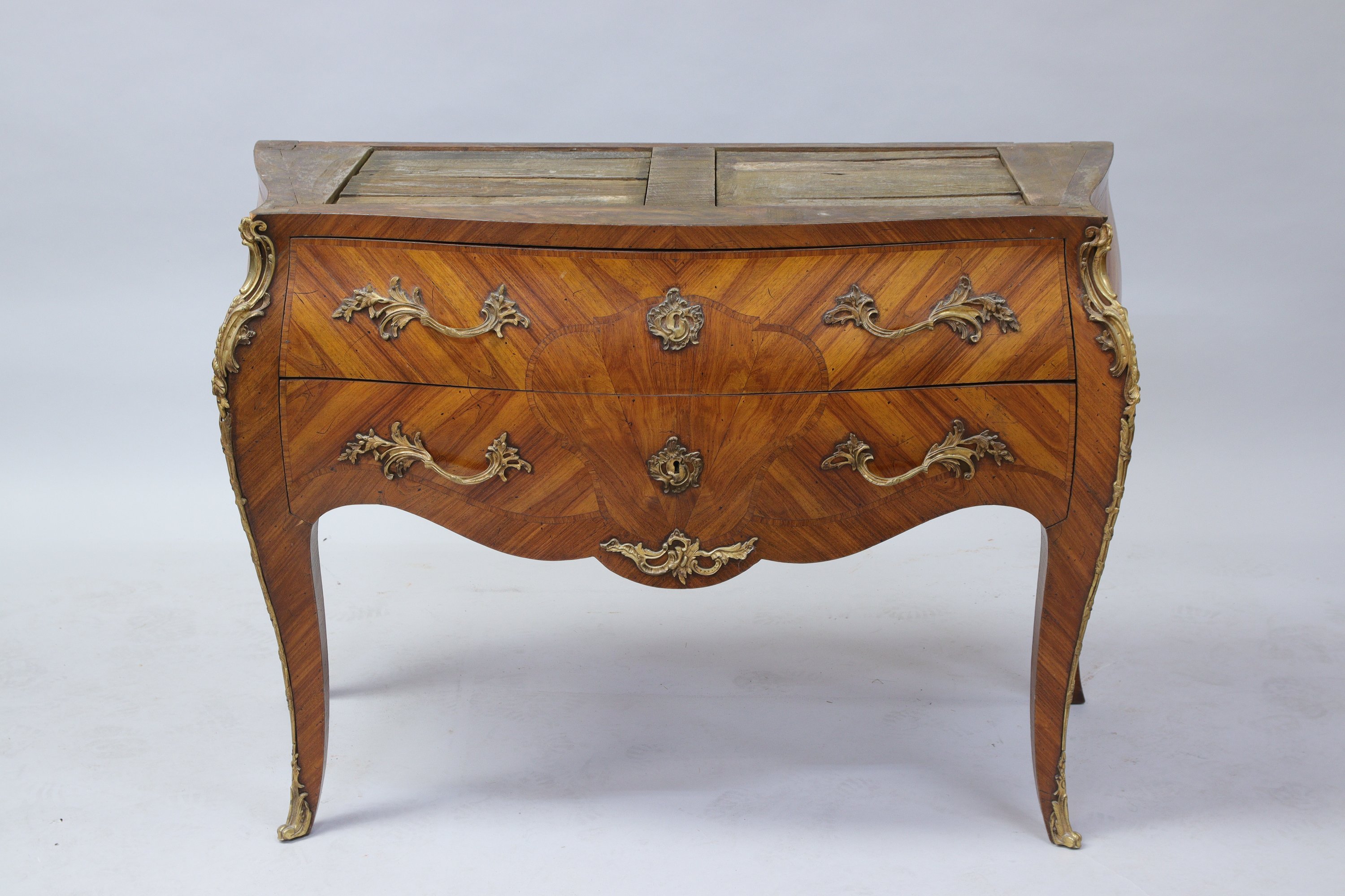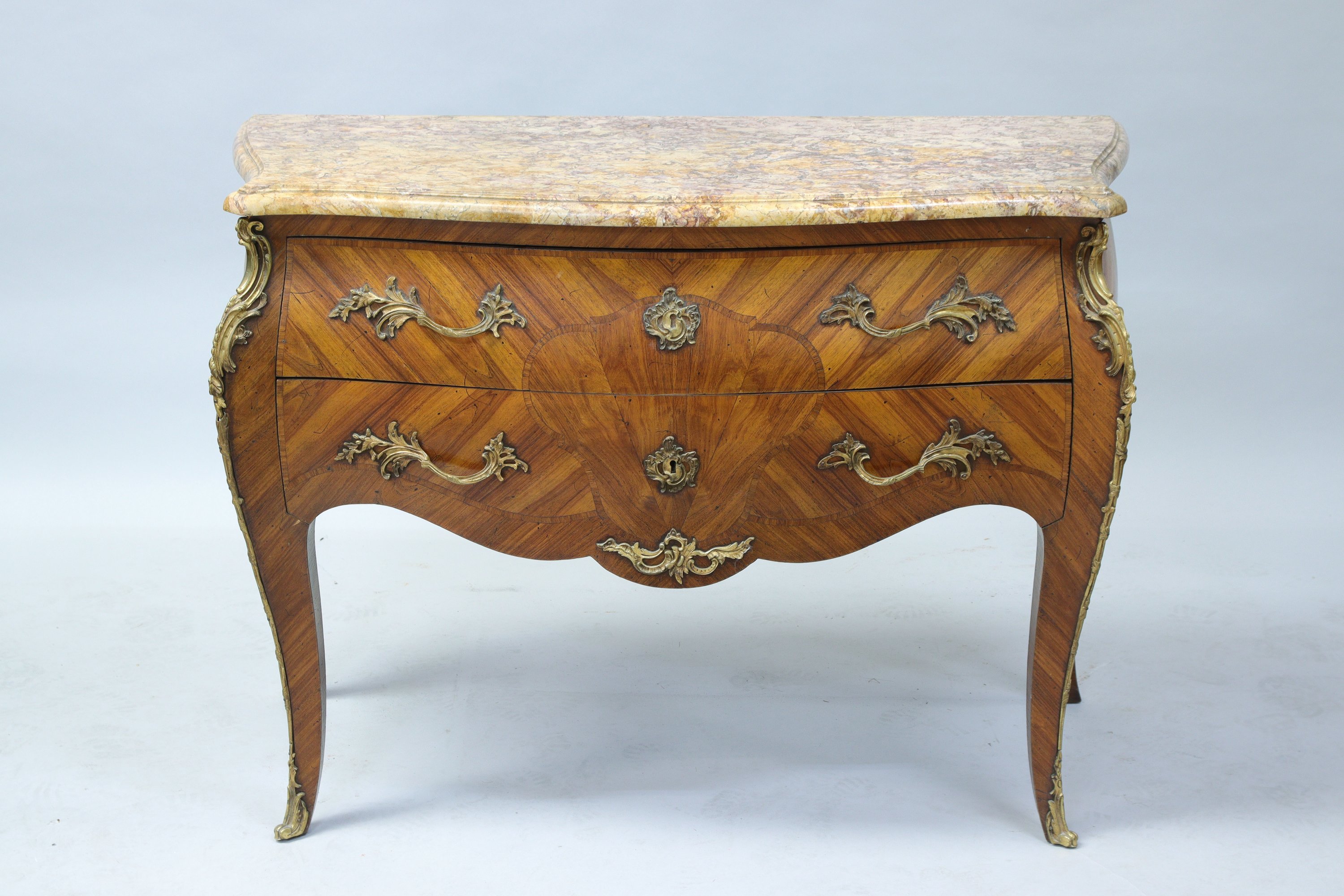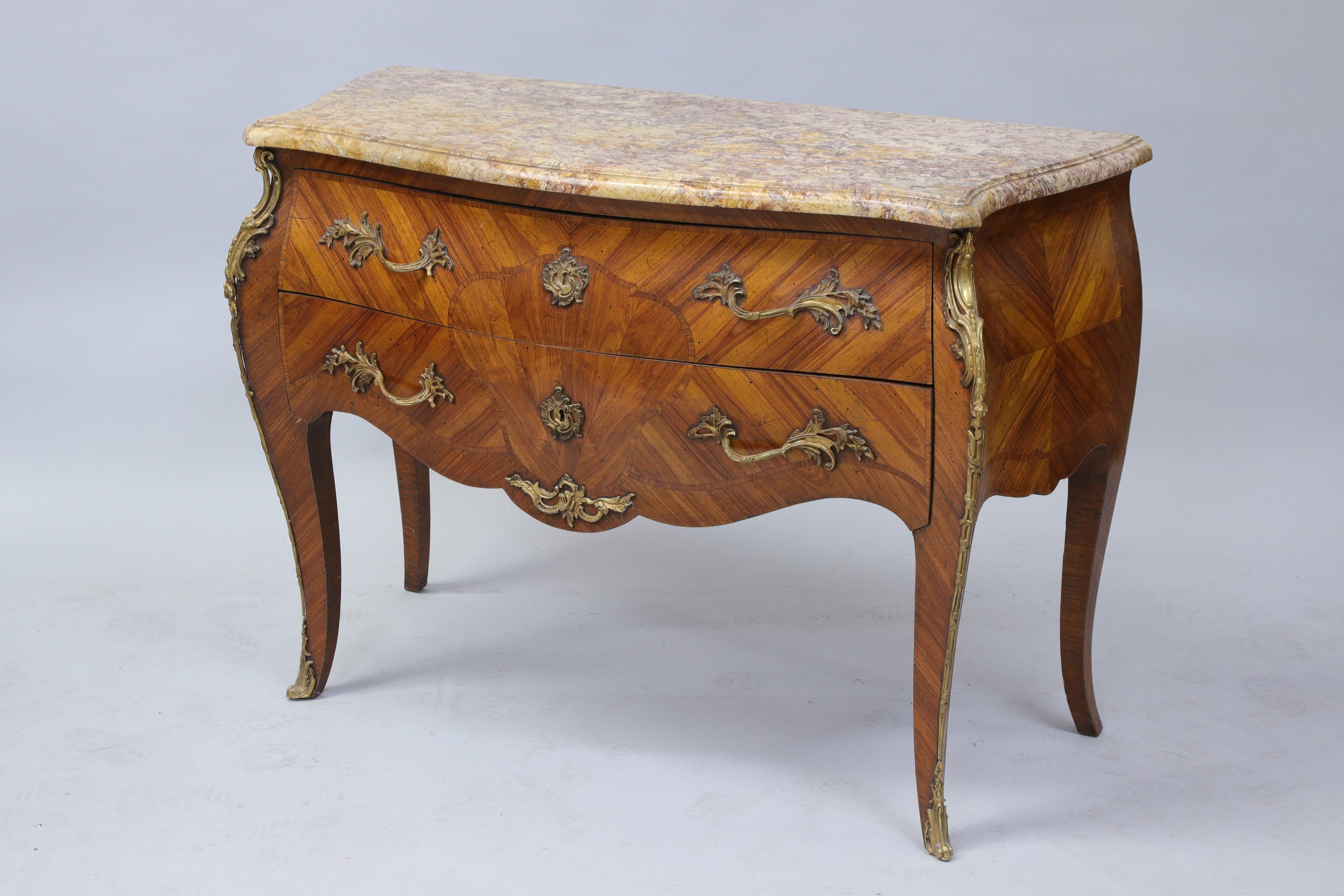 en placage de bois de rose ouvrant en façade par deux tiroirs sans traverse. La façade galbée est décorée d'une marqueterie dite "coeur en éventail" et de frisage. Les montants à côtes pincées se prolongent par quatre pieds courbés. Riche ornementation de bronzes dorés dans lesprit rocaille à motifs de coquilles et d'éléments feuillagés: poignées, entrées de serrure et sabots. Marbre brèche Brocatelle.