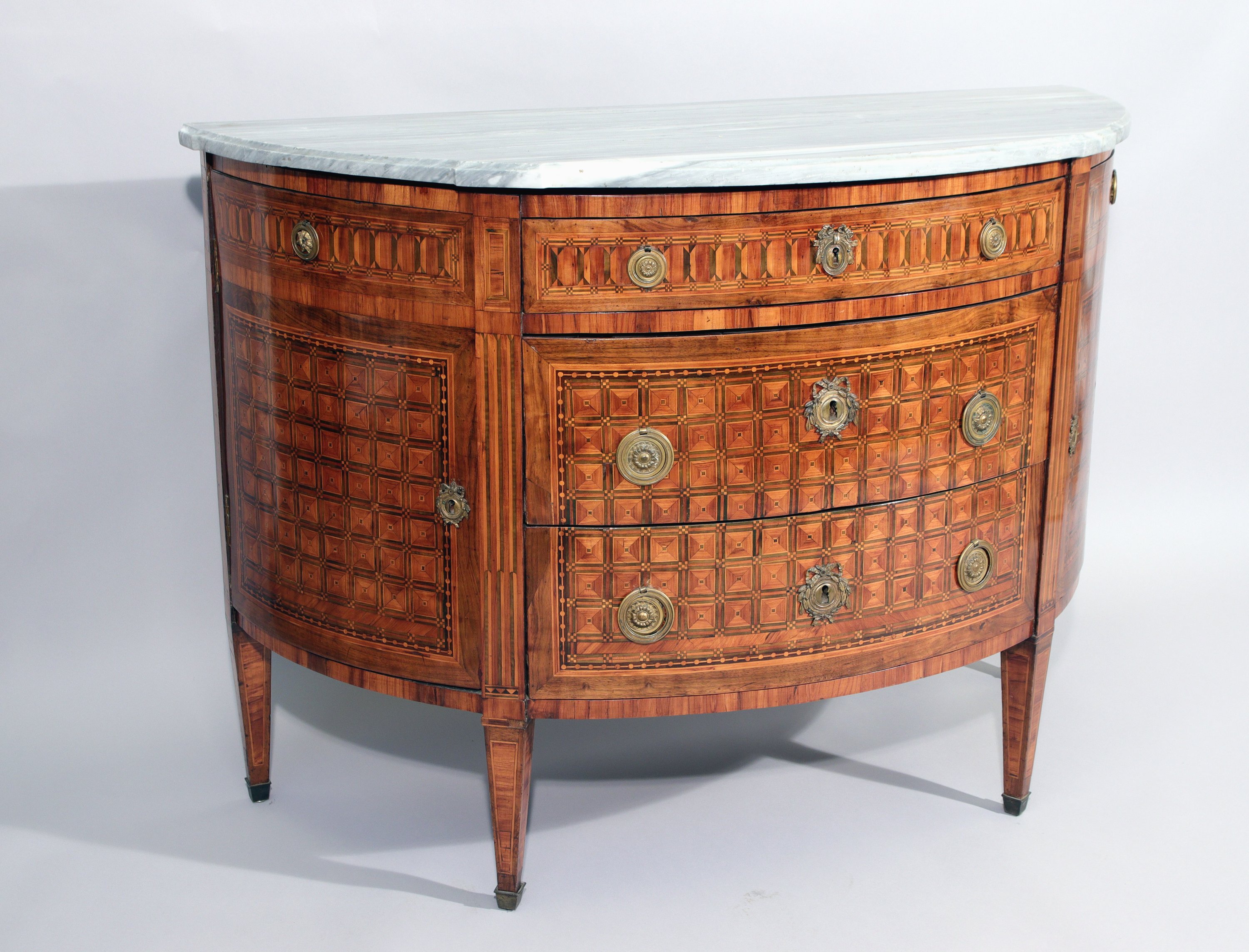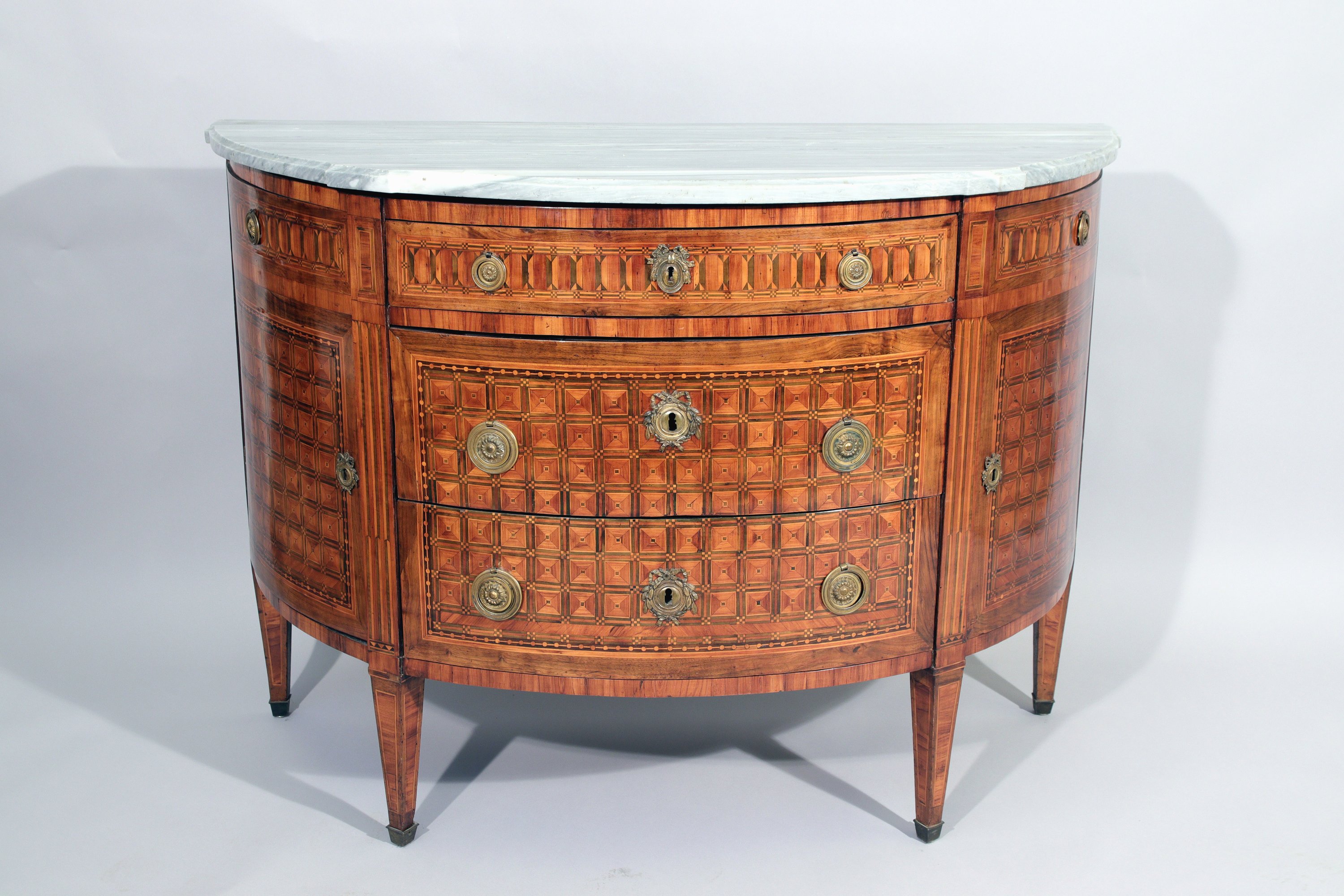 en placage de bois de rose et bois teinté ouvrant par deux vantaux latéraux encadrant un tiroir en ceinture et deux tiroirs sans traverse décorés d'une marqueterie de carrés entourés de rangs de perles. Les montants à cannelures simulées. Riches ornementations de bronze doré sur les poignées et les serrures. Elle repose sur quatre pieds gaines.
