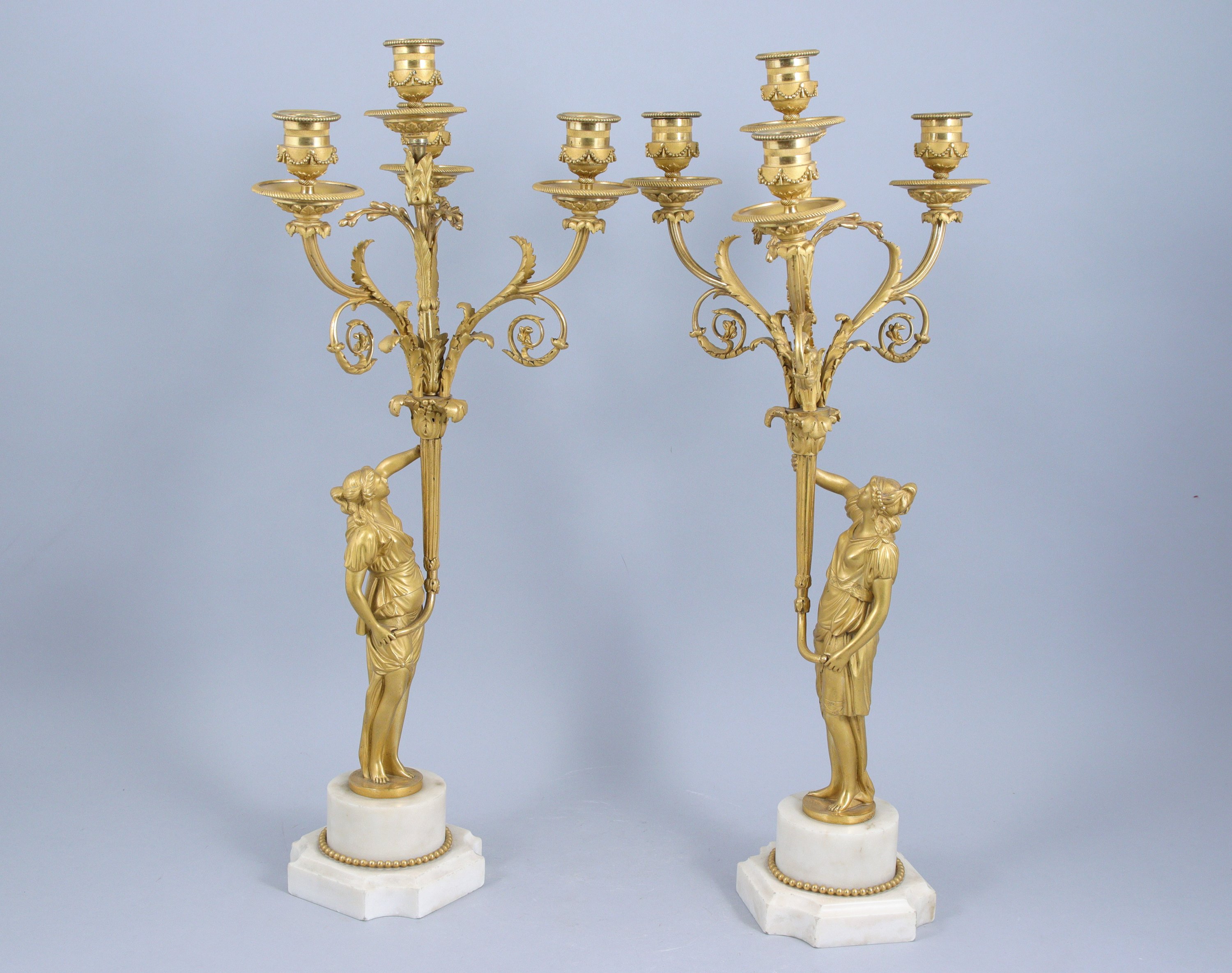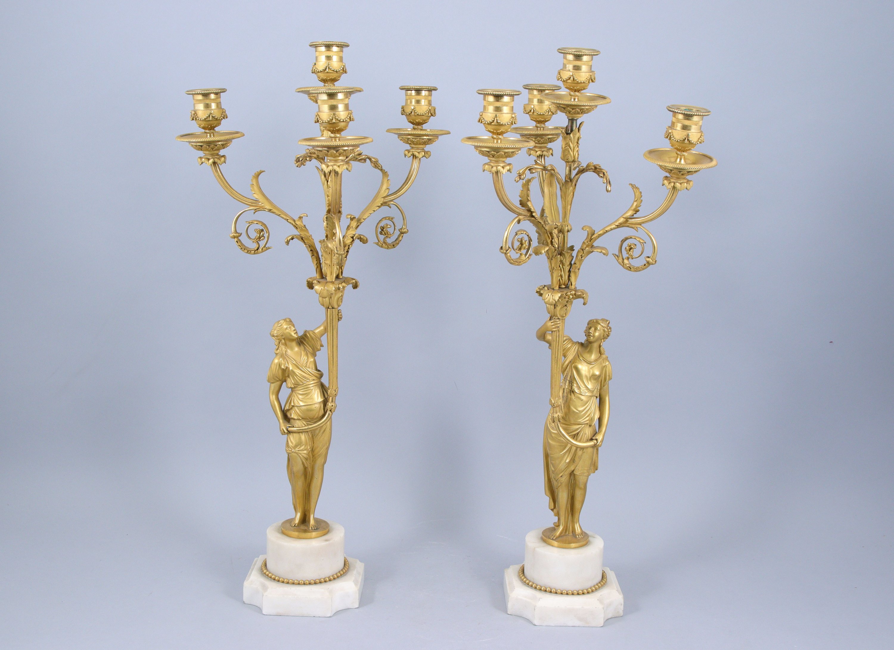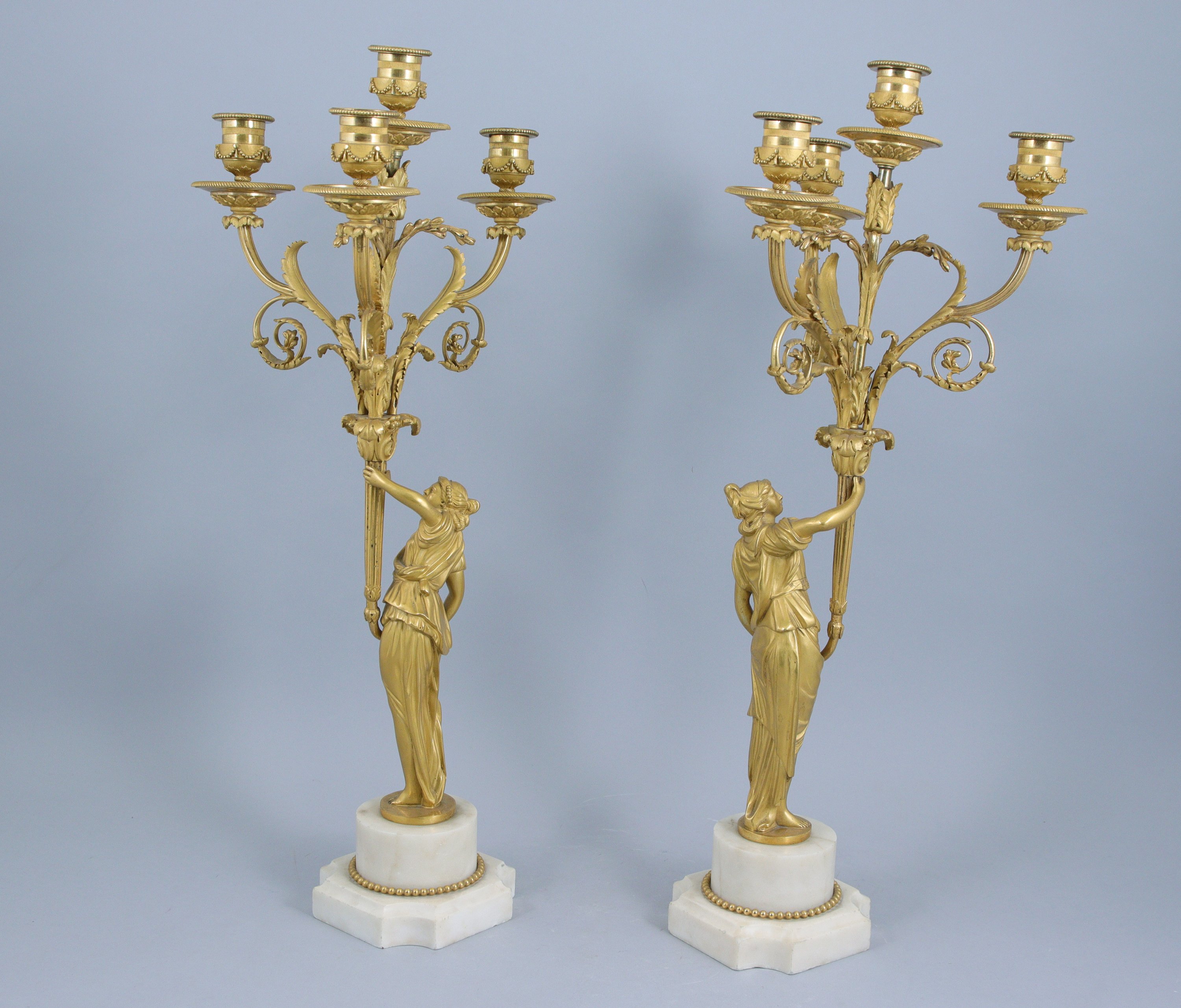 en bronze doré et ciselé, à quatre lumières à décor de feuilles d'acanthe et enroulements. Ils sont soutenus par une tige centrale en forme de flambeaux cannelés tenus par deux femmes en contraposto vêtues à l'antique et reposant sur une demi-colonne entourée d'une frise de perles. Les bases de forme carrée aux angles rentrés sont décorés d'une doucine.