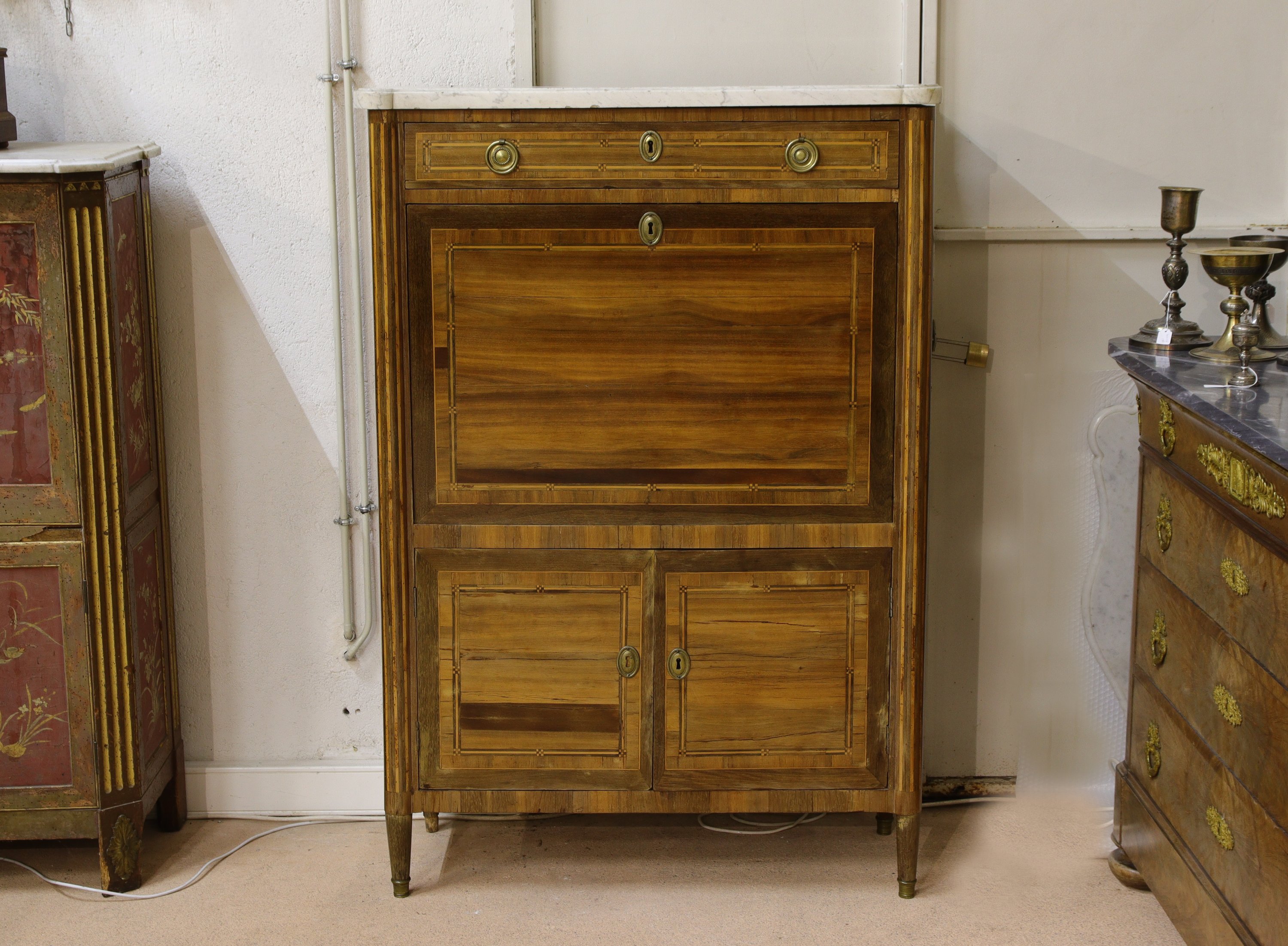 en bois de placage ouvrant par un tiroir surmontant un abattant découvrant six tiroirs sur deux rangs et quatre casiers, deux vantaux en partie inférieure. Riche décor de filets et marqueterie, les côtés à décor de table. Deux demi-colonnes en façade se prolongeant sur des pieds fuselés.