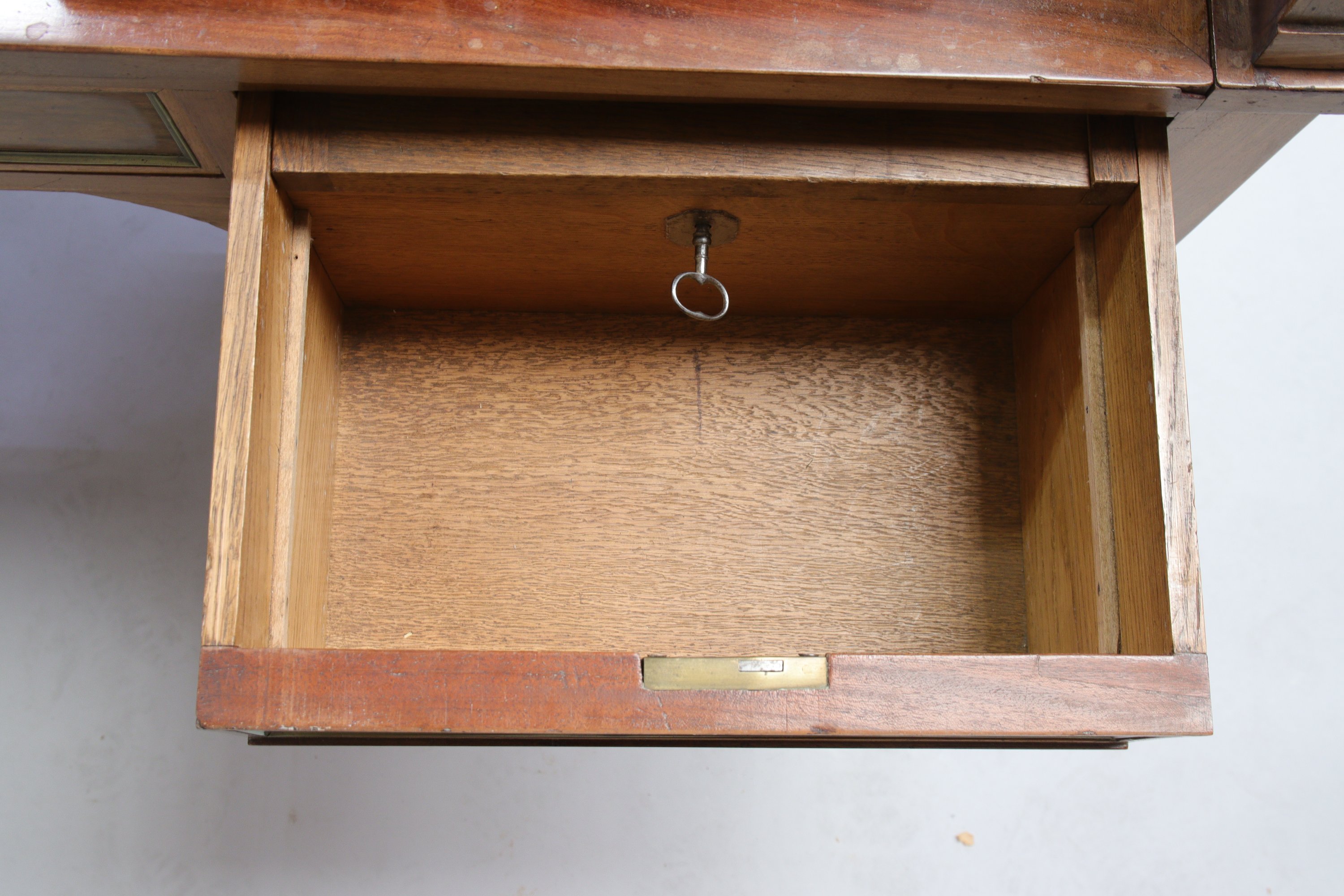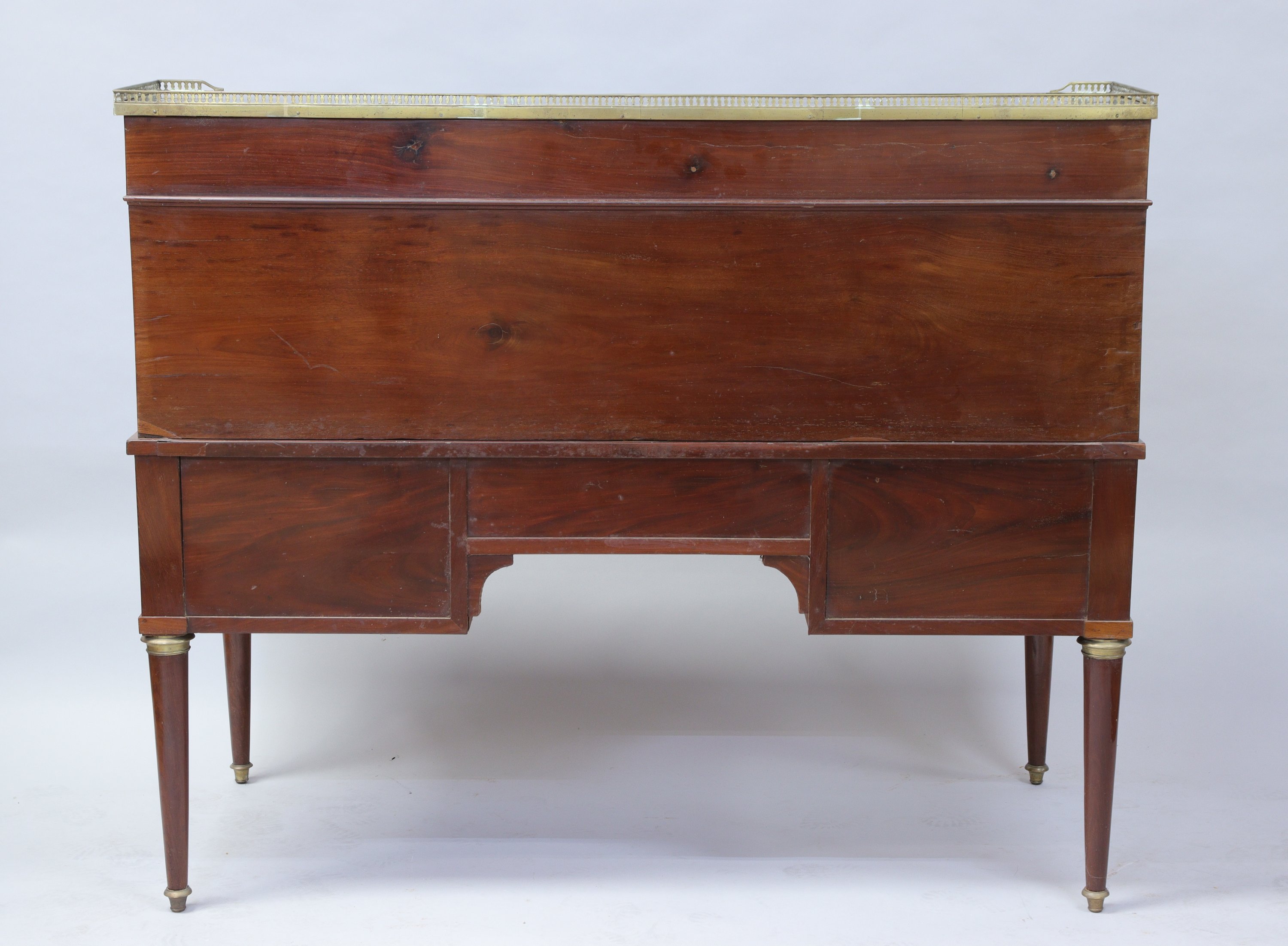 en acajou et placage d'acajou toutes faces. Il ouvre par trois tiroirs en gradin, un cylindre découvrant un plateau à tirage garni d'un cuir noir et trois tiroirs sous trois compartiments. La ceinture se compose d'un tiroir central, deux tiroirs à gauche et un tiroir à droite comportant un secret à clé. Une tirette de chaque côté garnie de cuir noir. Il repose sur quatre pieds fuselés. Dessus de marbre gris. Ornementation de laiton dont galerie ajourée, entrées de serrure, poignées fixe et sabots. Serrures à trèfle.