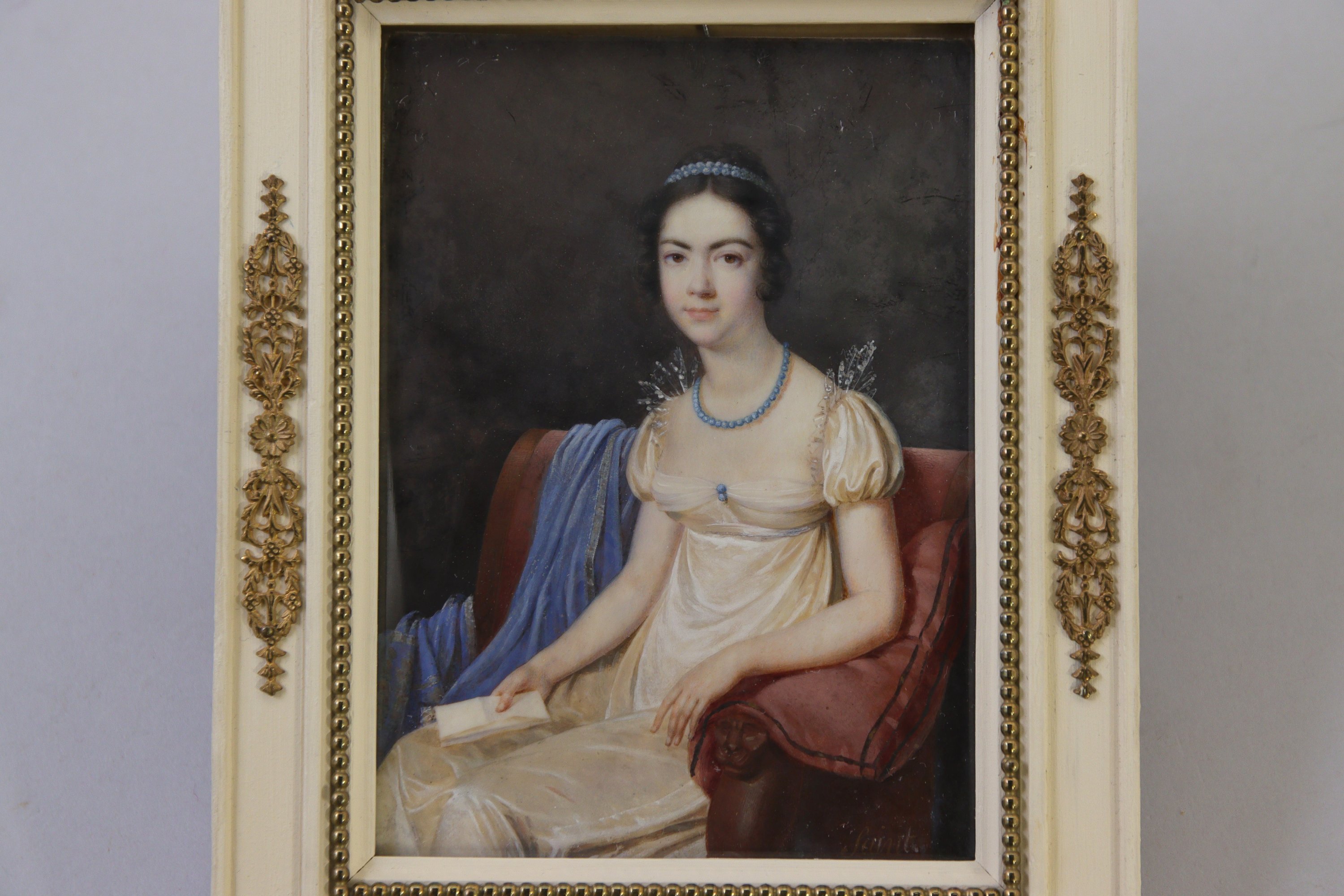 Daniel Saint (1778-1847) Dame à la lettreMiniature signée en bas...
