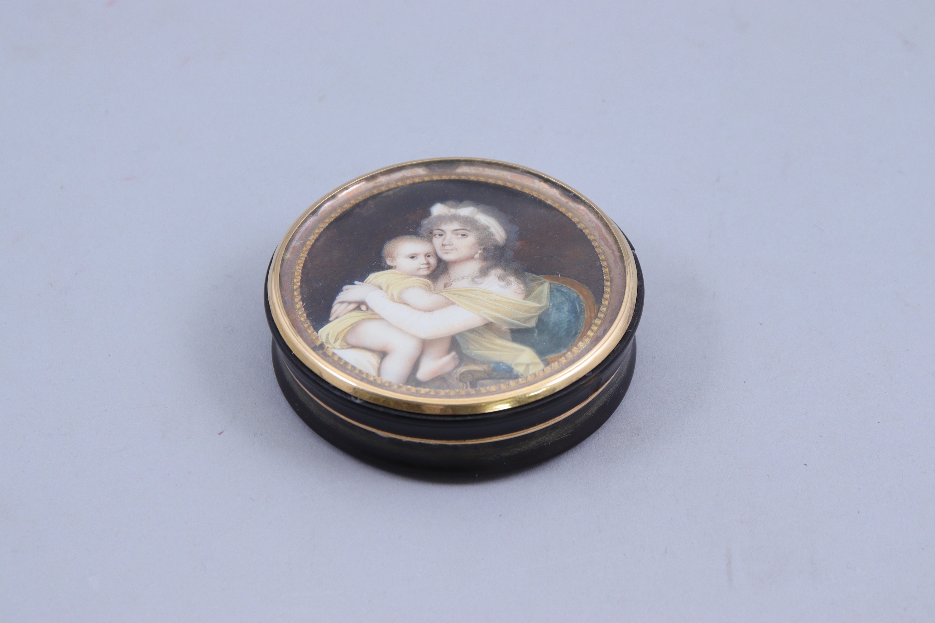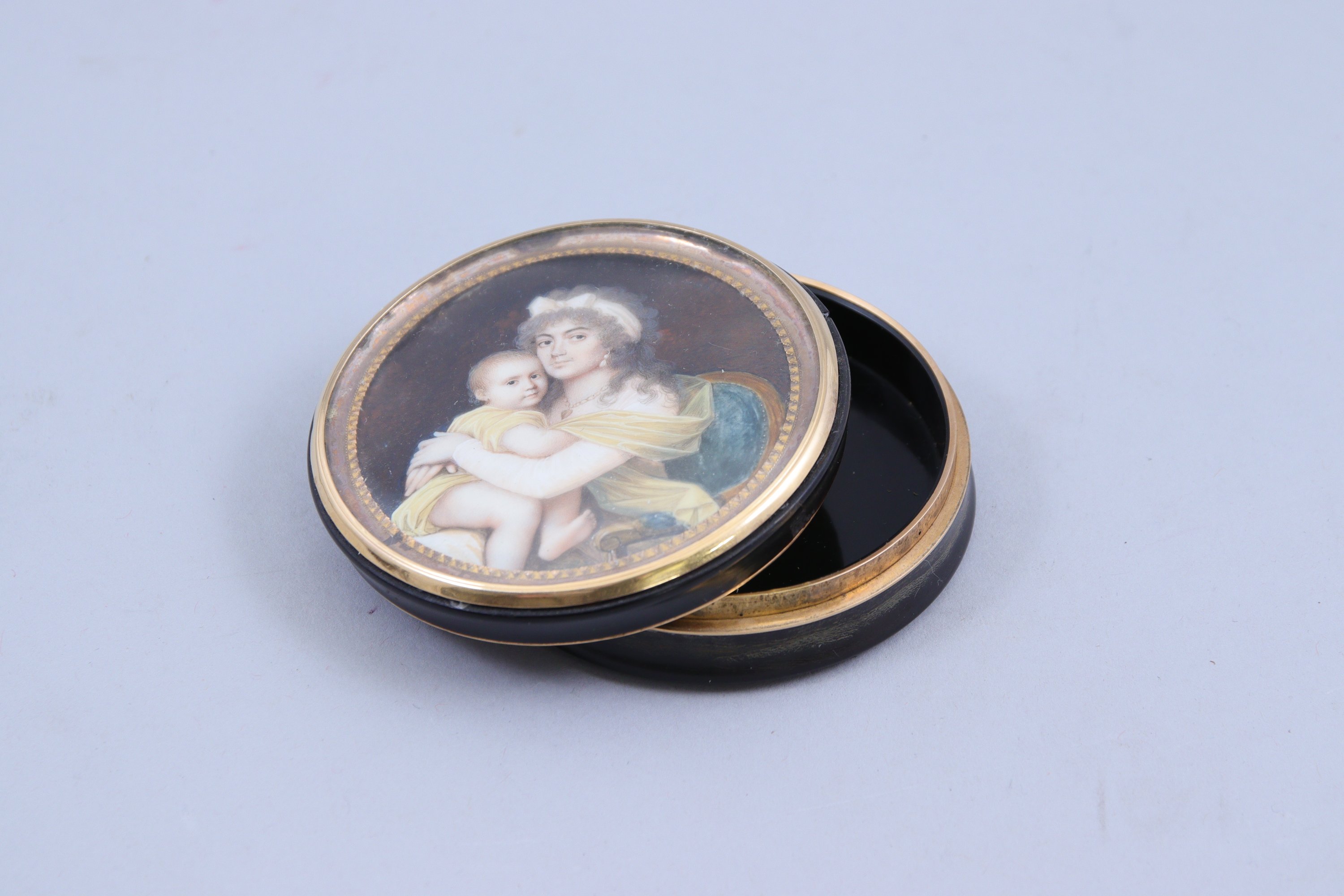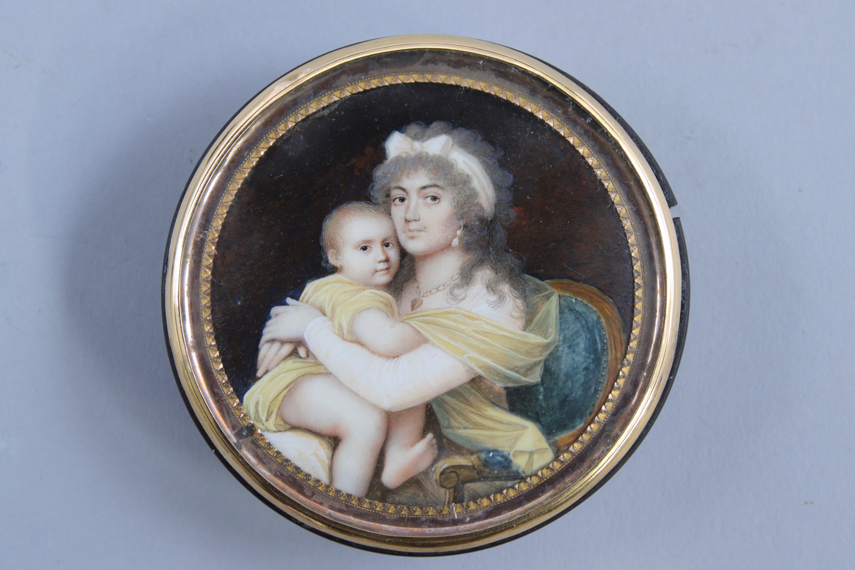 en écaille et cerclage en or jaune 750 millièmes (18k). Le couvercle présente en son centre une miniature figurant une mère assise sur un fauteuil, tenant son enfant dans les bras.