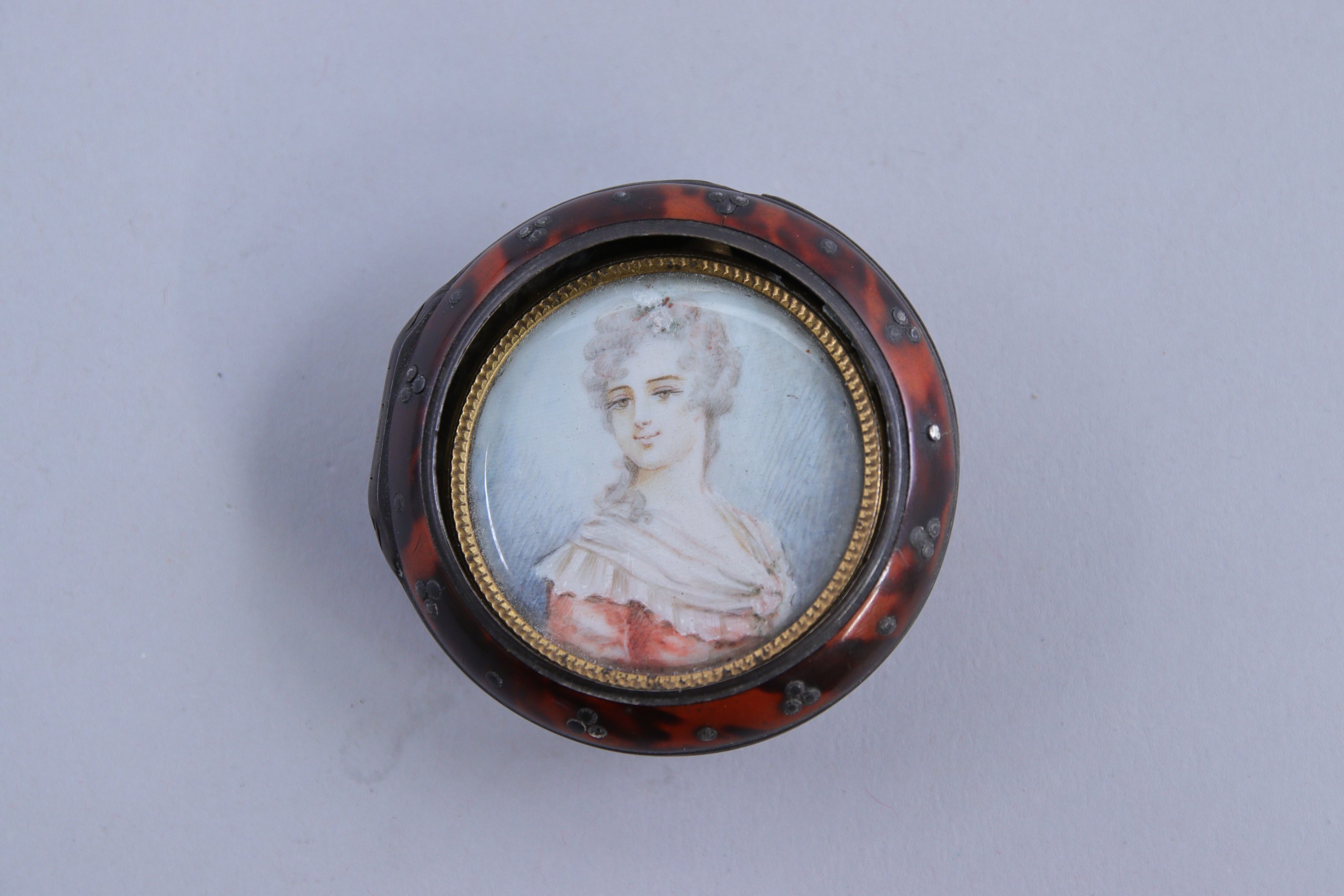 Joint: Boite en écaille réhaussée de points d'argent. Le couvercle à décor d'une miniature figurant un portrait de femme de trois quart entouré d'une frise à motifs godronnés en laiton. L'intérieur concave est habillé d'un satin vert. XIXe siècle. Poids brut: 45 gr. Haut. 2,3, Diam. 5,7 cm (miniature à refixer, petits accidents et manques).