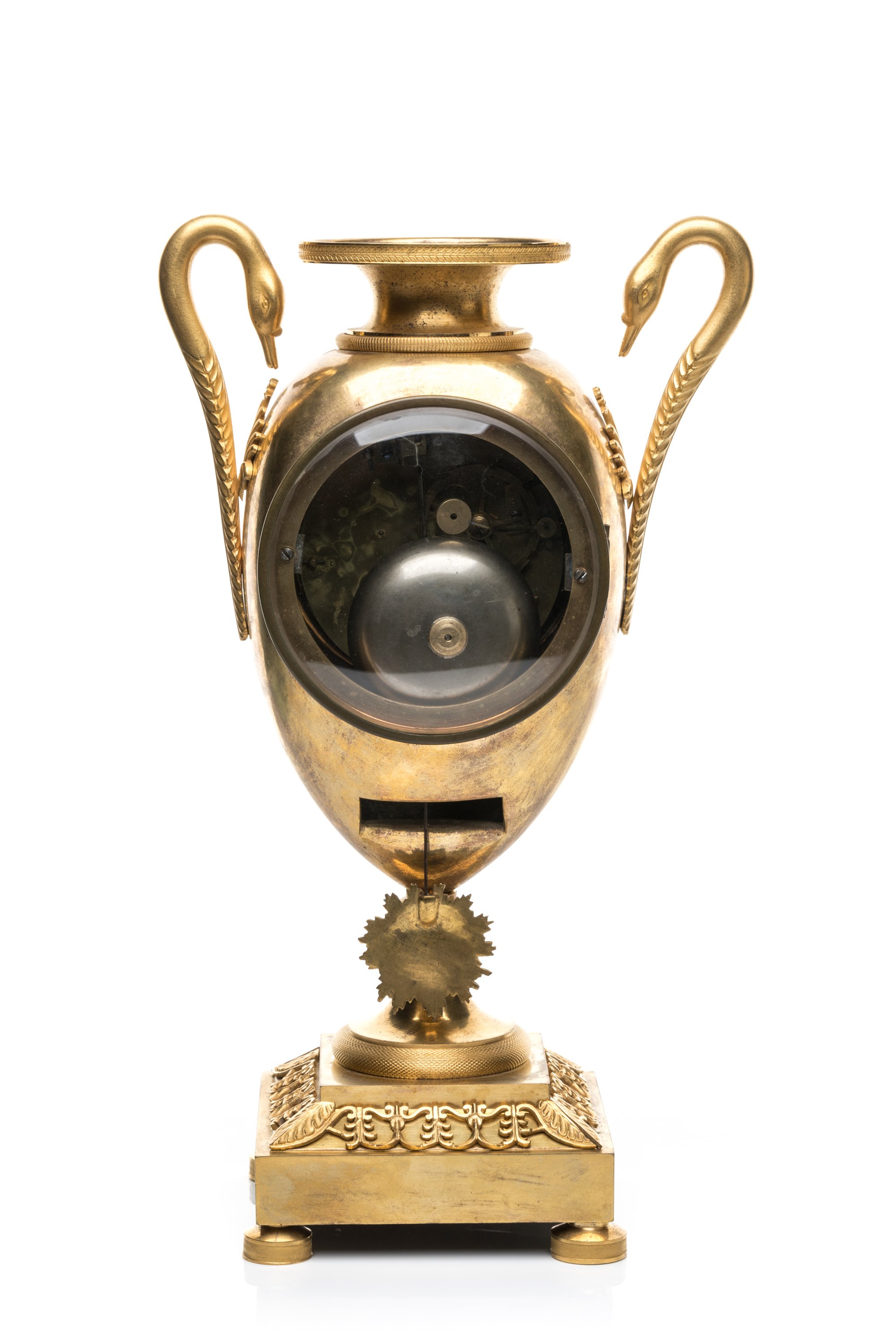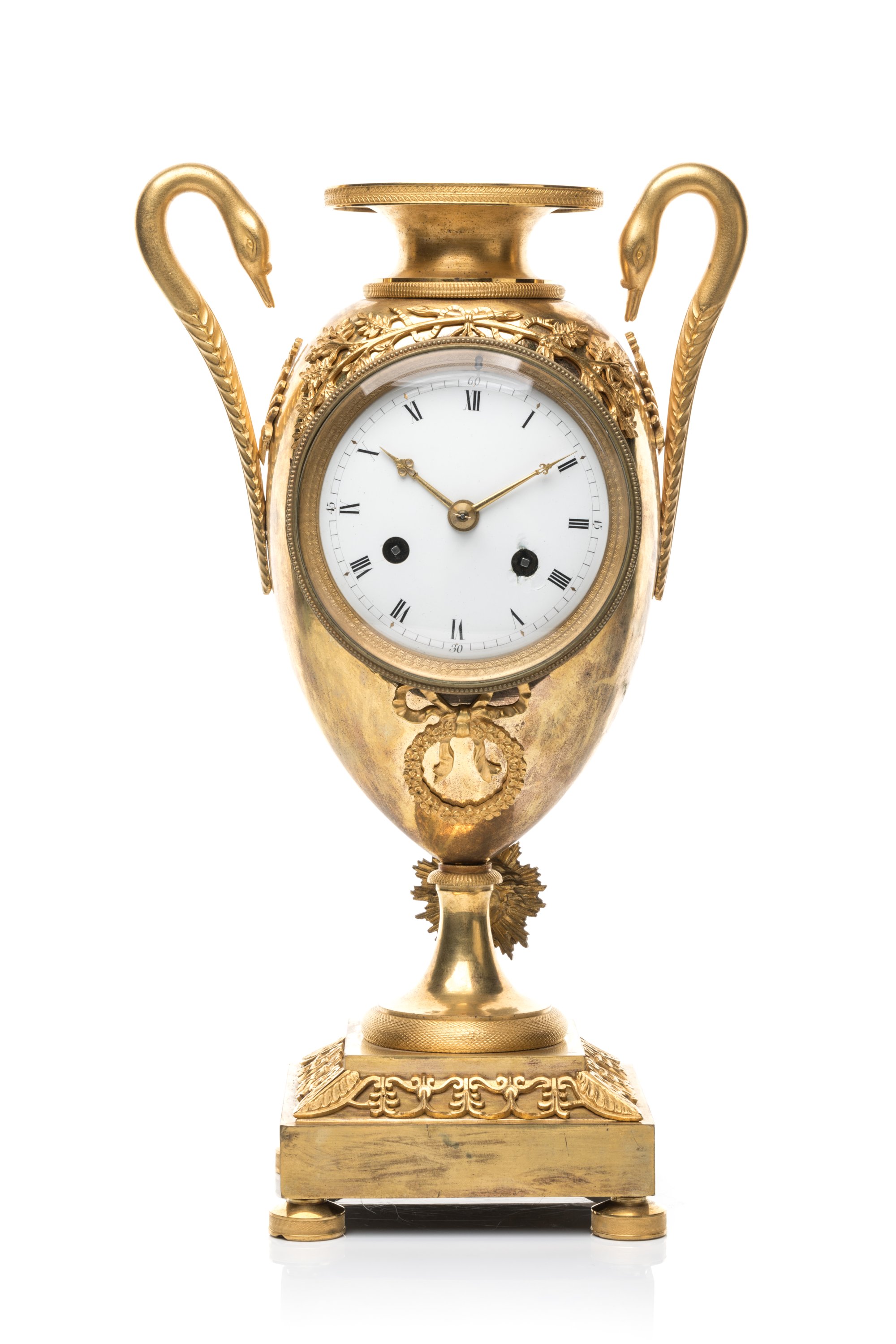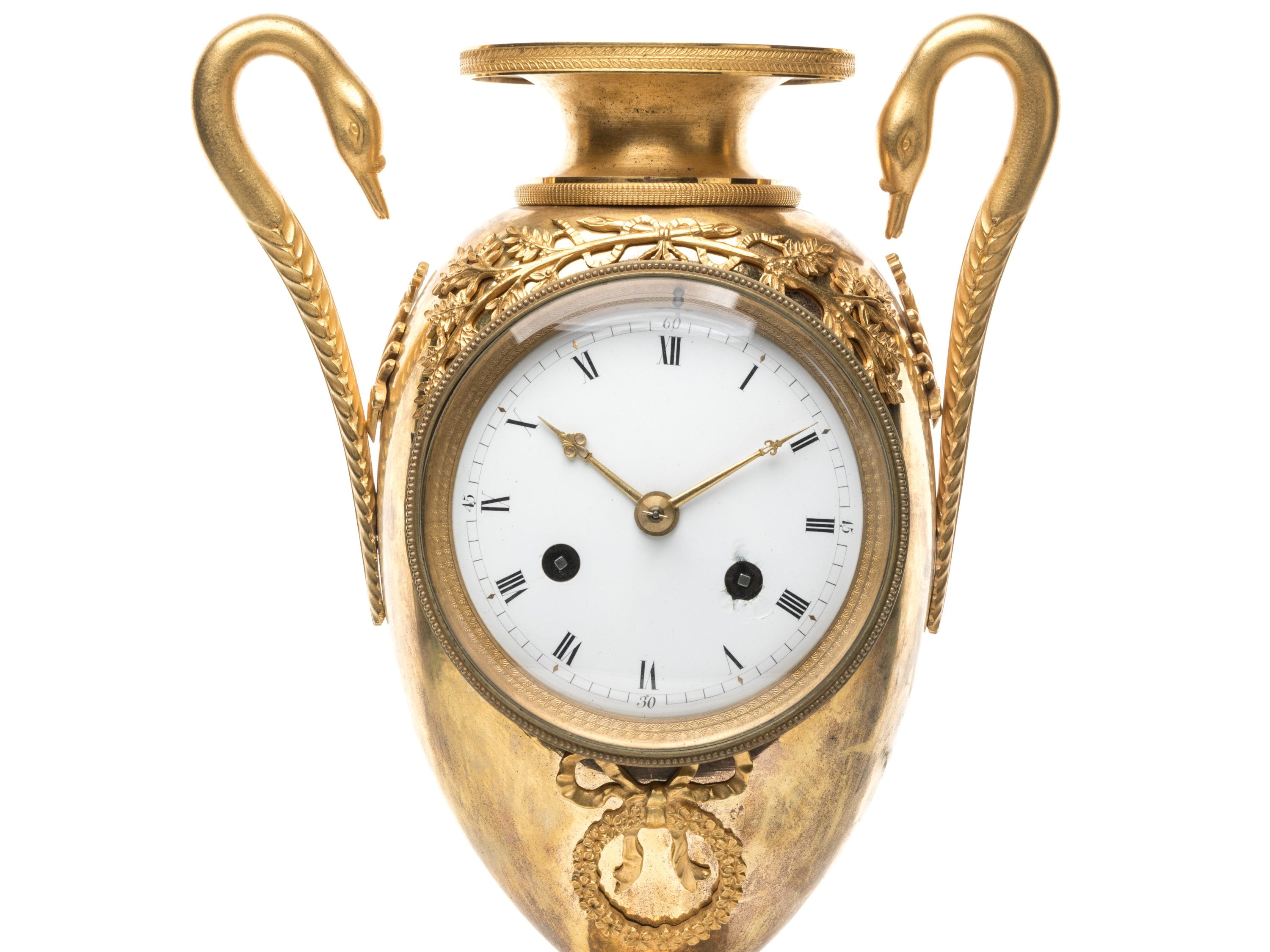 en bronze doré ornée de deux cols de cygnes entourant le cadran émaillé. Heures en chiffres romains, chemin de fer pour les minutes. Le piédouche repose sur une base quadrangulaire terminée par quatre petits pieds en forme de disque. Ornementation de palmes, feuilles de laurier et frises antiques.