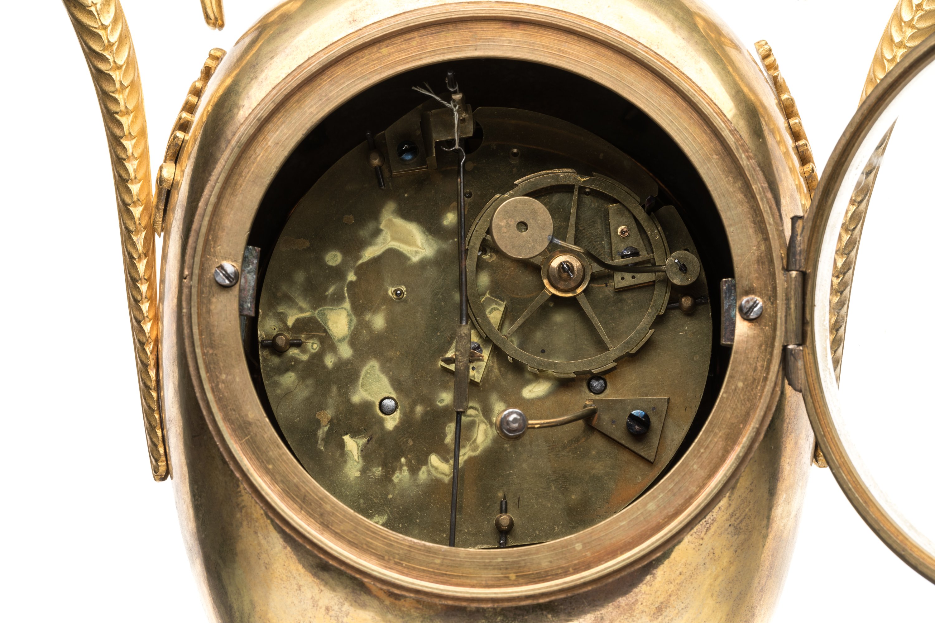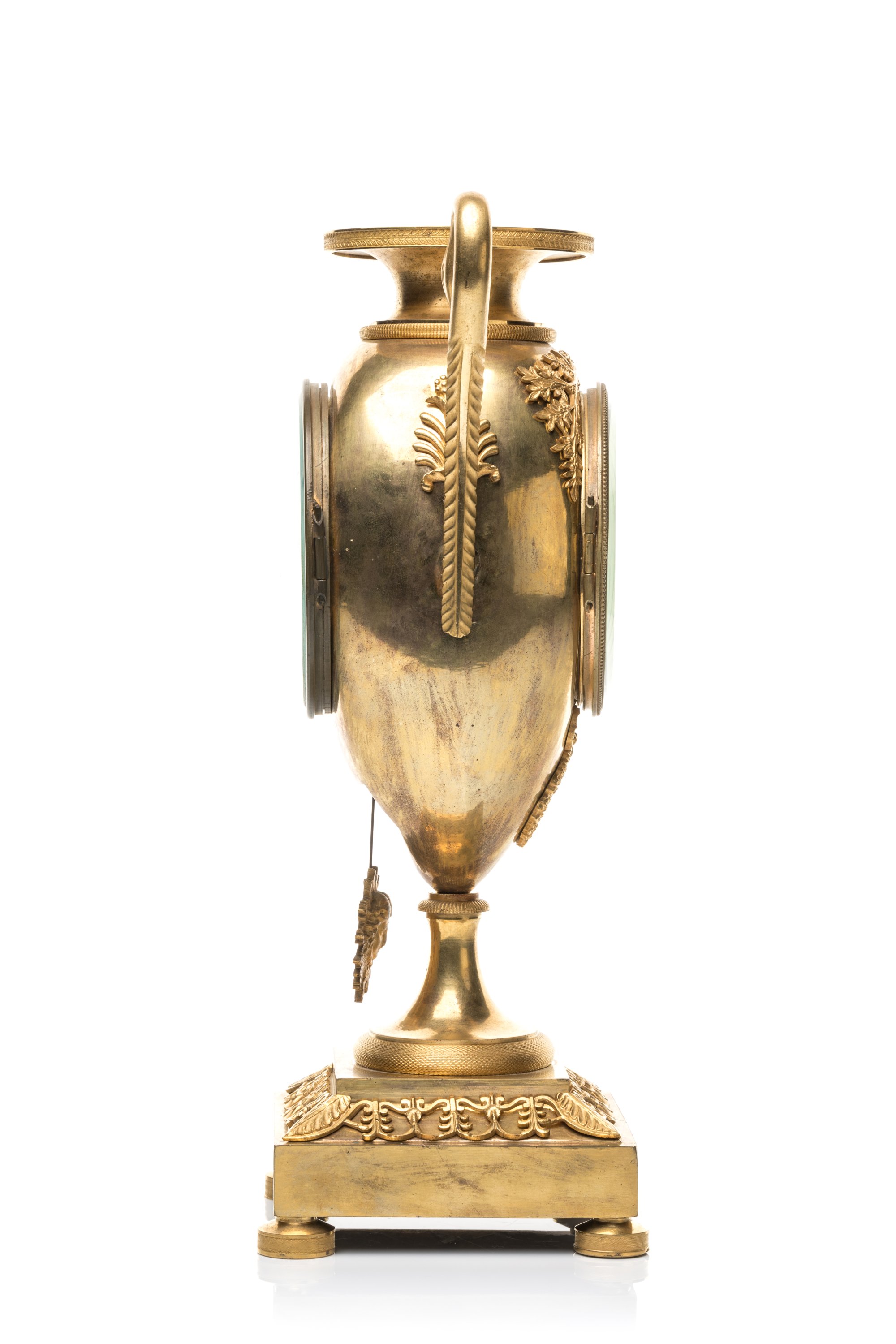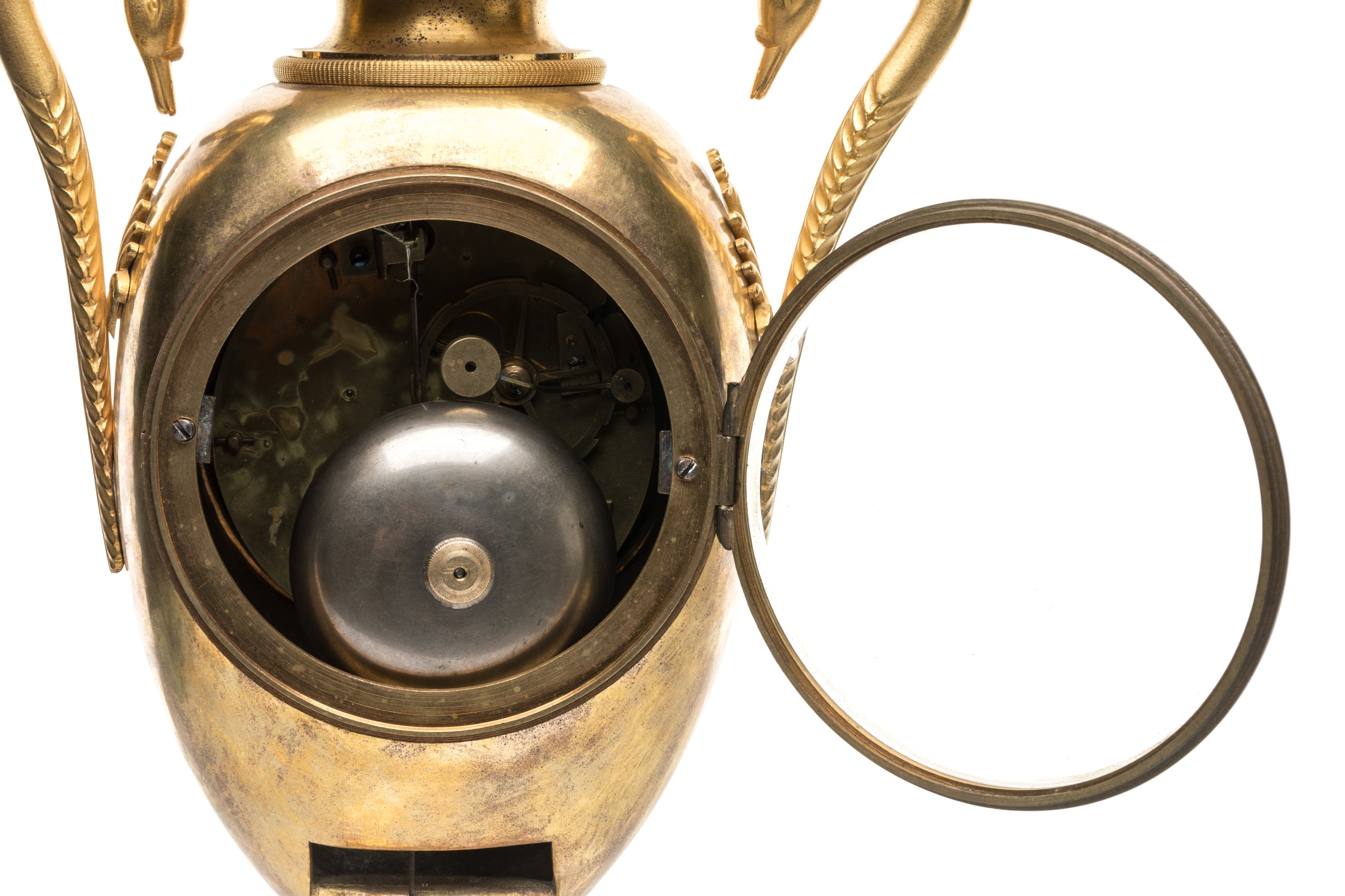 en bronze doré ornée de deux cols de cygnes entourant le cadran émaillé. Heures en chiffres romains, chemin de fer pour les minutes. Le piédouche repose sur une base quadrangulaire terminée par quatre petits pieds en forme de disque. Ornementation de palmes, feuilles de laurier et frises antiques.