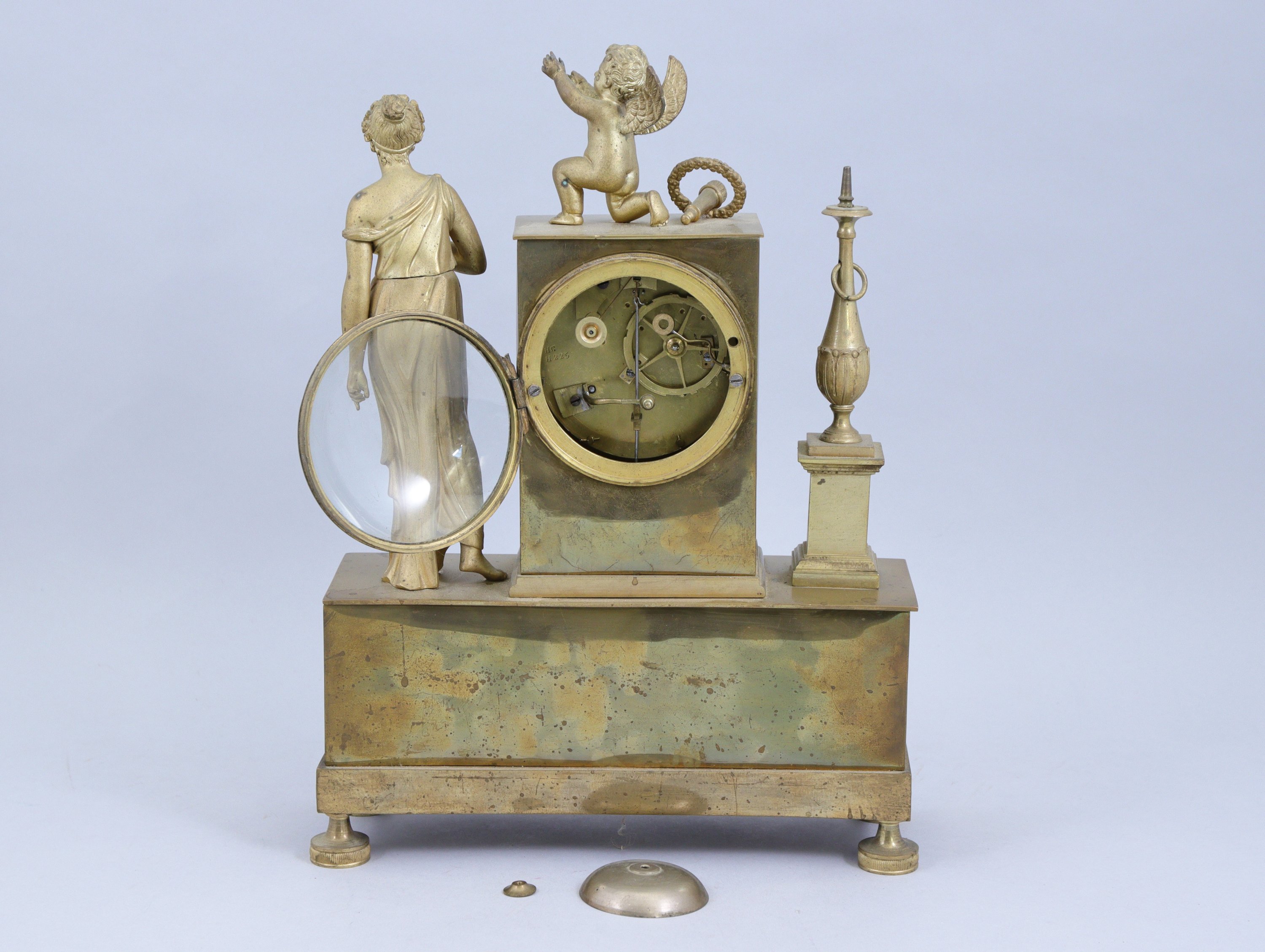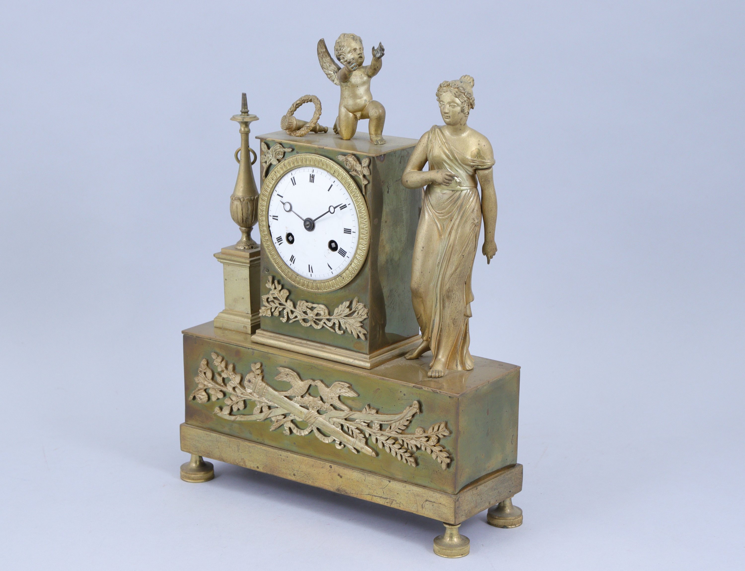 en bronze doré. Le cadran émaillé blanc est entouré de roses. Il indique les heures en chiffres romains et les minutes par un chemin de fer. Psychée pointant du doigt, l'Amour lui tendant les bras à côté d'un carquois et d'une couronne fleurie. A gauche, une colonne balustre reposant sur un piédestal. La base présente une applique à décor de deux tourterelles s'embrassant sur un carquois dans un entourage de branches d'olivier et rosier. Quatre pieds patins.