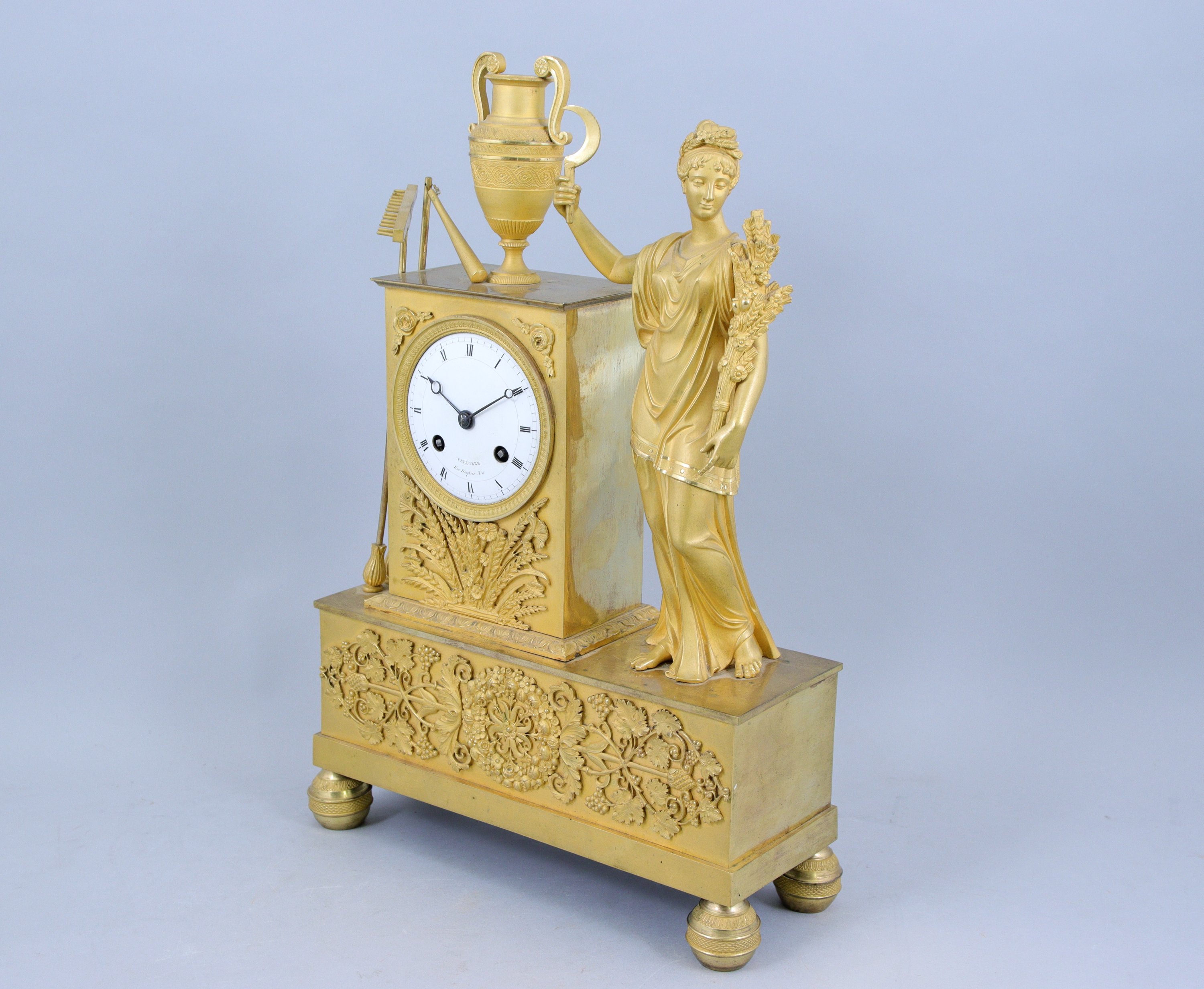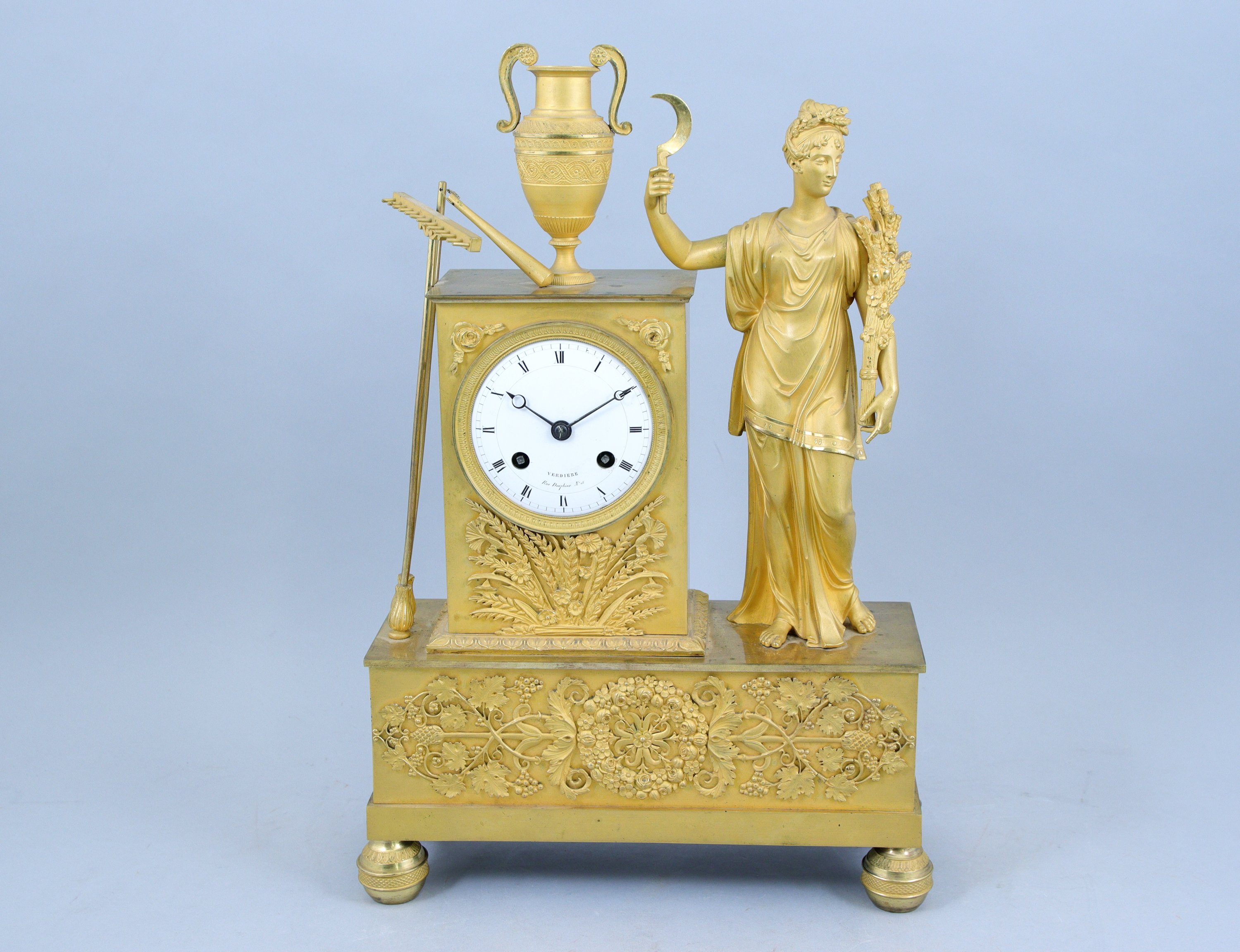 en bronze doré. Le cadran émaillé blanc signé "VERDIERE rue Dauphine n°15" est inscrit dans une borne et indique les heures en chiffres romains, les minutes par un chemin de fer. Il est surmonté d'un vase grec et entouré d'un râteau et d'un fléau. À côté, Cérès tient dans une main une faucille et dans l'autre une botte de blé et de fleurs des champs, symbole d'abondance. L'ensemble repose sur une base rectangulaire ornée en façade d'une couronne de fleurs, pampres de vignes et thyrses. Quatre pieds à décor de frises.