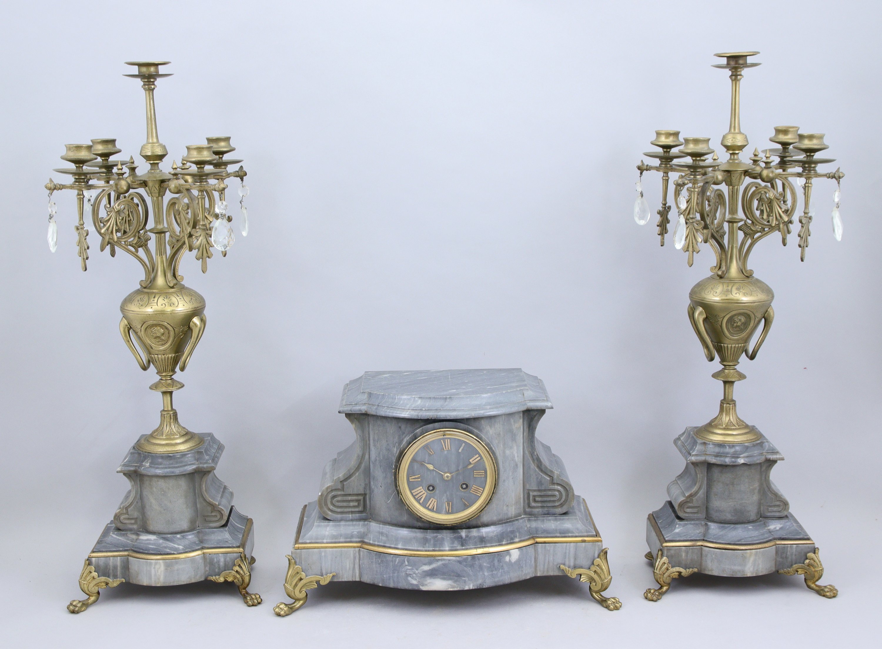 en bronze comprenant une paire de candélabres et une pendule en marbre dit "bleu Turquin" surmontée d'une sculpture en bronze représentant une femme et un enfant aux instruments de musique.