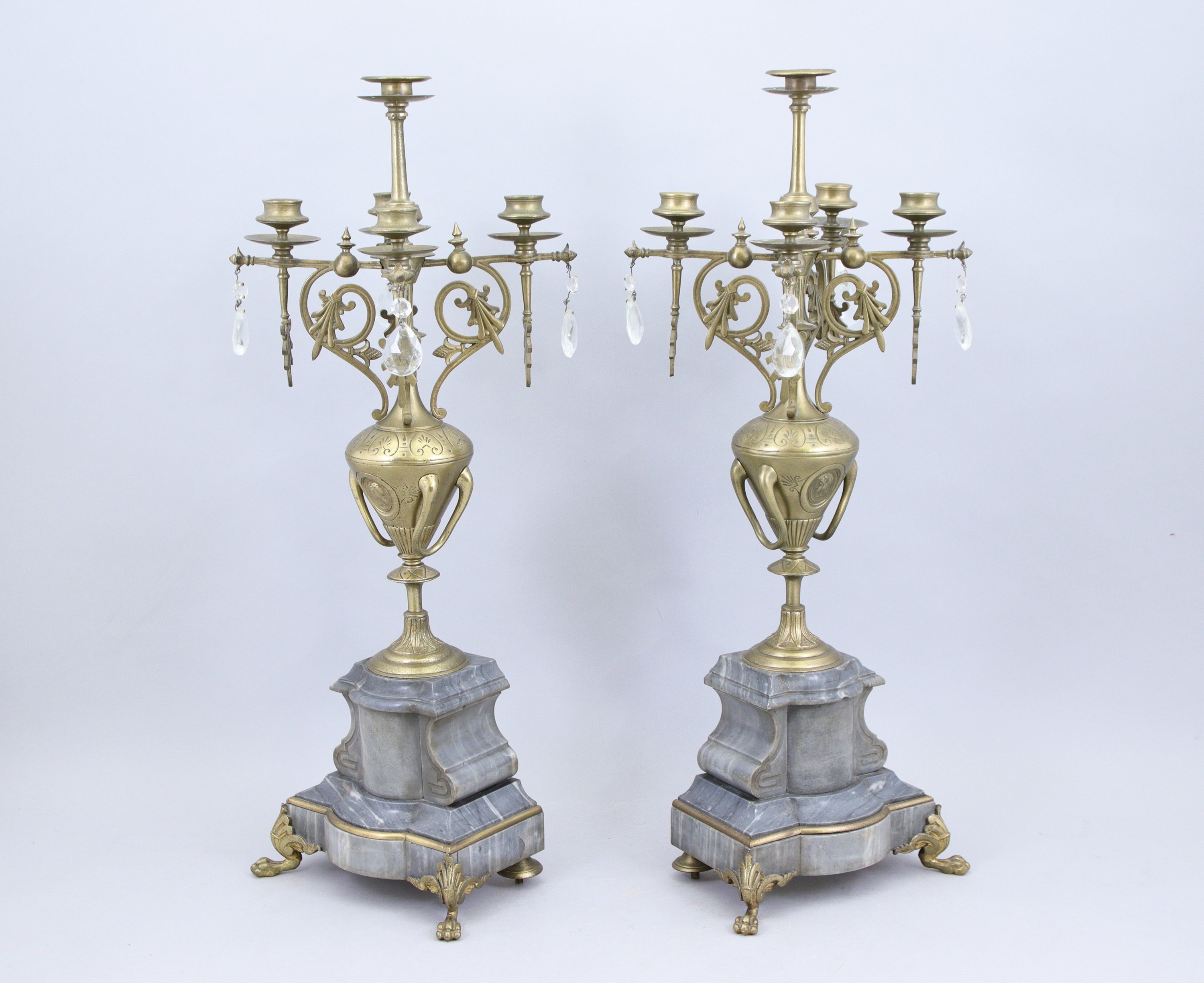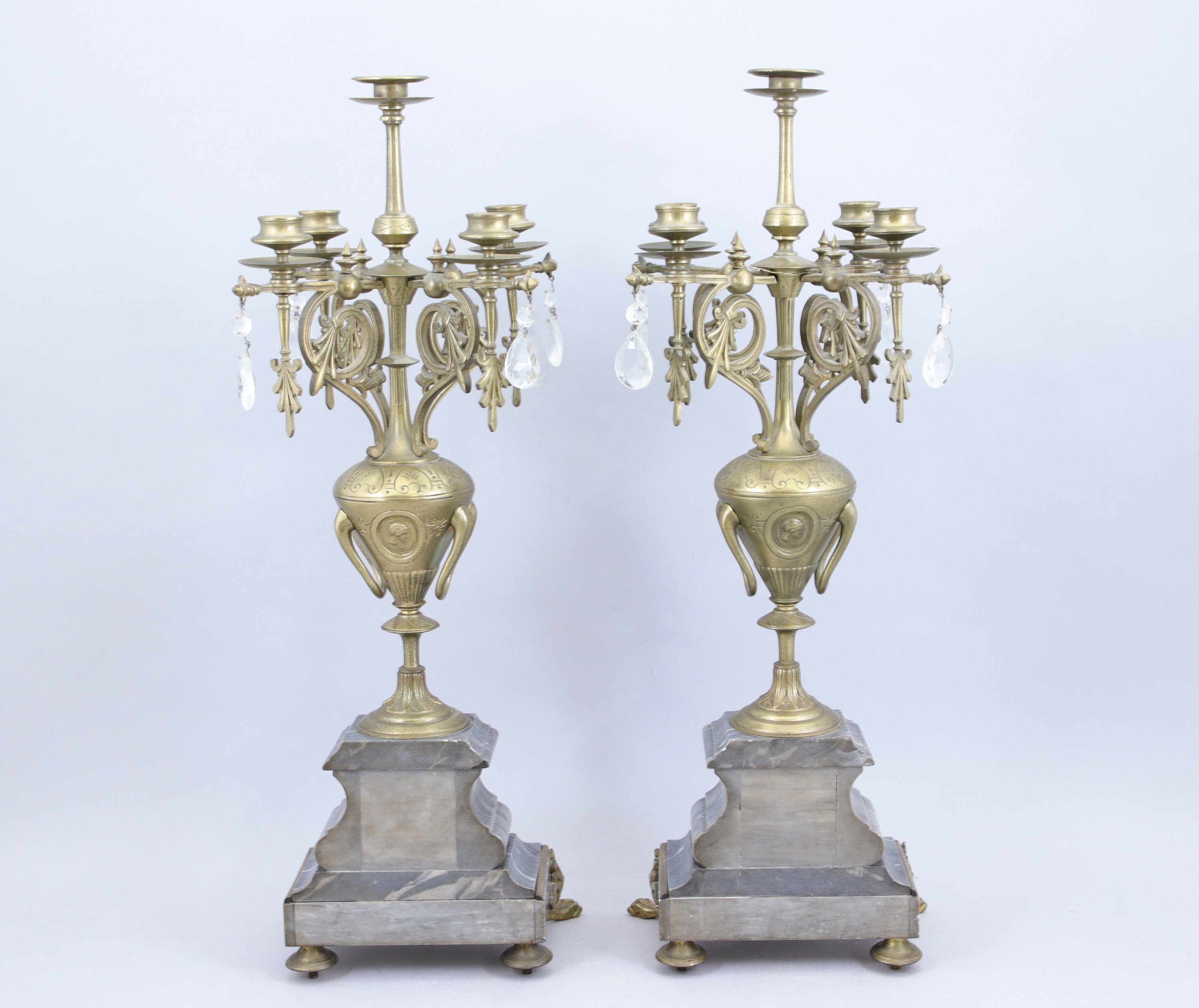 Les candélabres à cinq bras de lumière reproduisant des motifs de palmettes, pommes de pin et enroulements se terminent par des torches à l'antique portant les bobèches. L'extrémité des bras est rehaussée par des pampilles. Le fût imite un vase à l'antique orné d'un buste de femme coiffée d'un bonnet phrygien inscrit dans un médaillon.Base en deux parties en marbre bleu Turquin. Le piétement en bronze imite des pattes de lion.