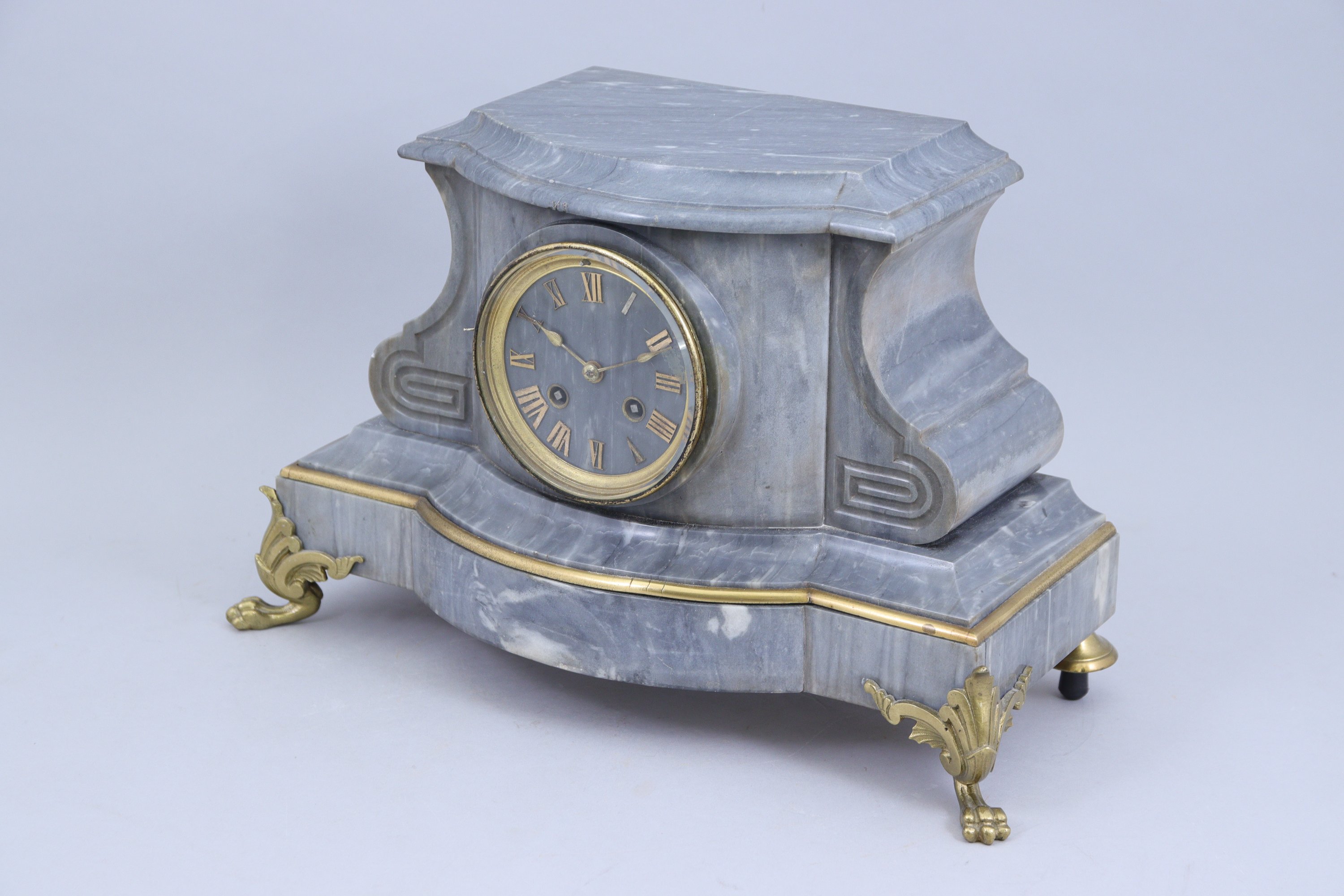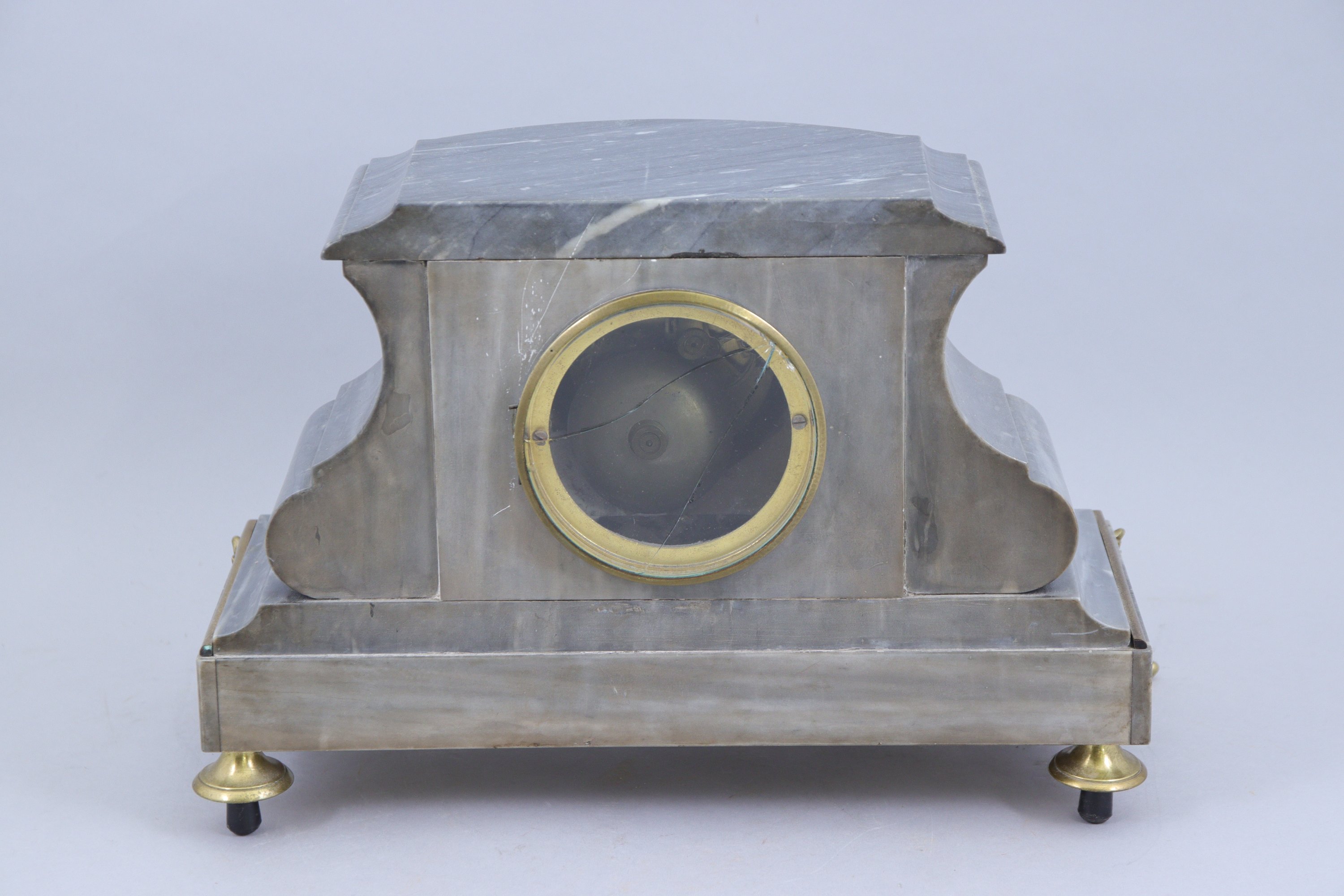 La pendule en marbre présente un cadran indiquant les heures en chiffres arabes en bronze. La sculpture représente une femme vêtue à l'antique accompagnée d'un enfant, tous deux portant une lyre, un tambourin et des castagnettes. Base ovale.