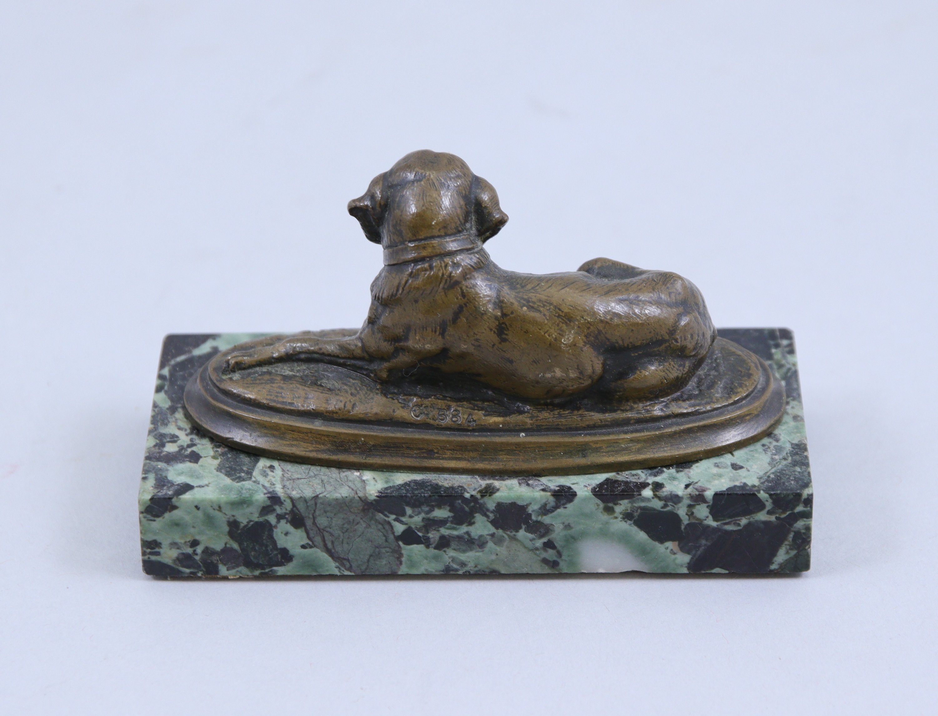 Joint: D'après Édouard Paul Delabrière (1829-1912). Chien couché. Bronze à patine brune signé sur la terrasse. Long. 9,5 cm.