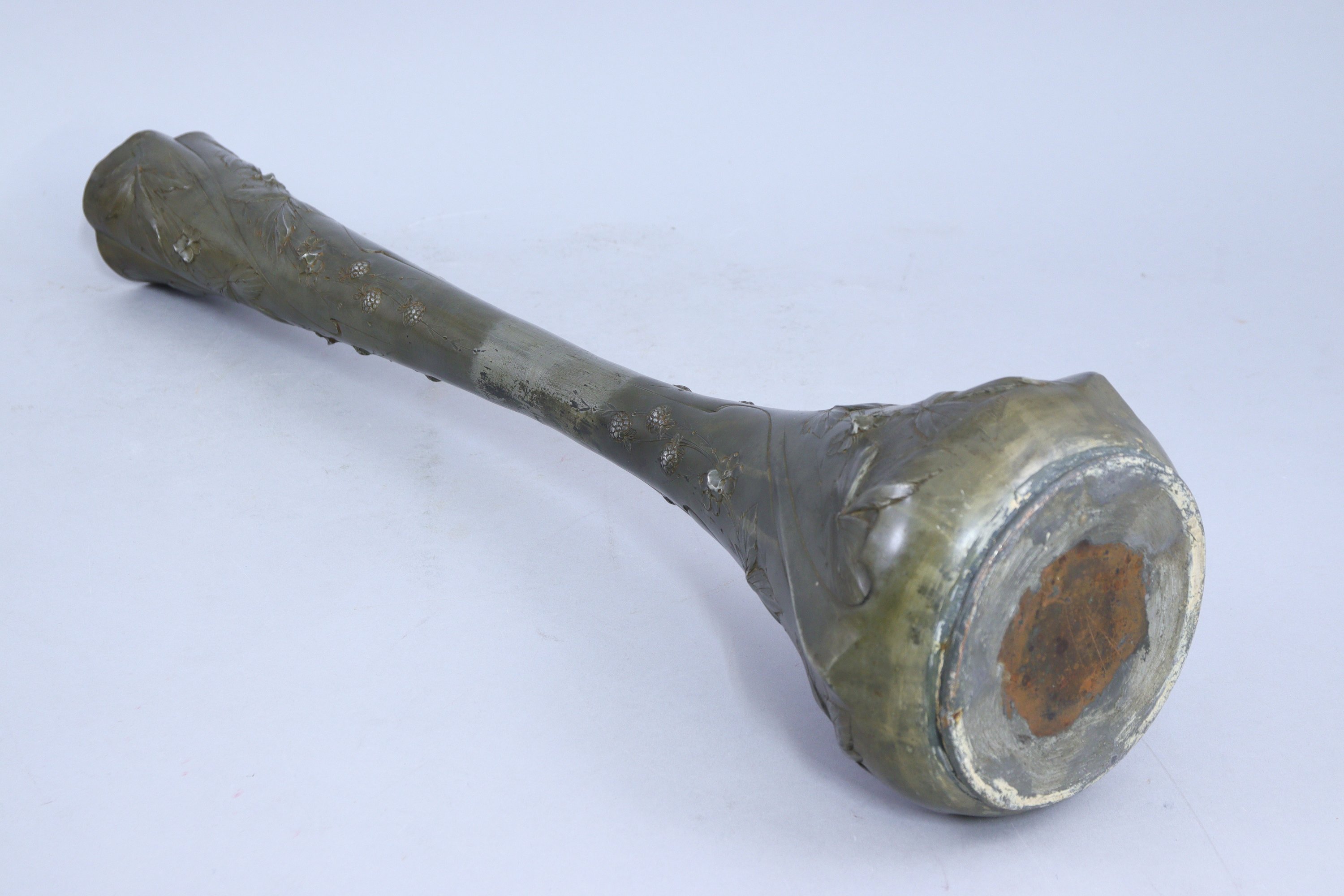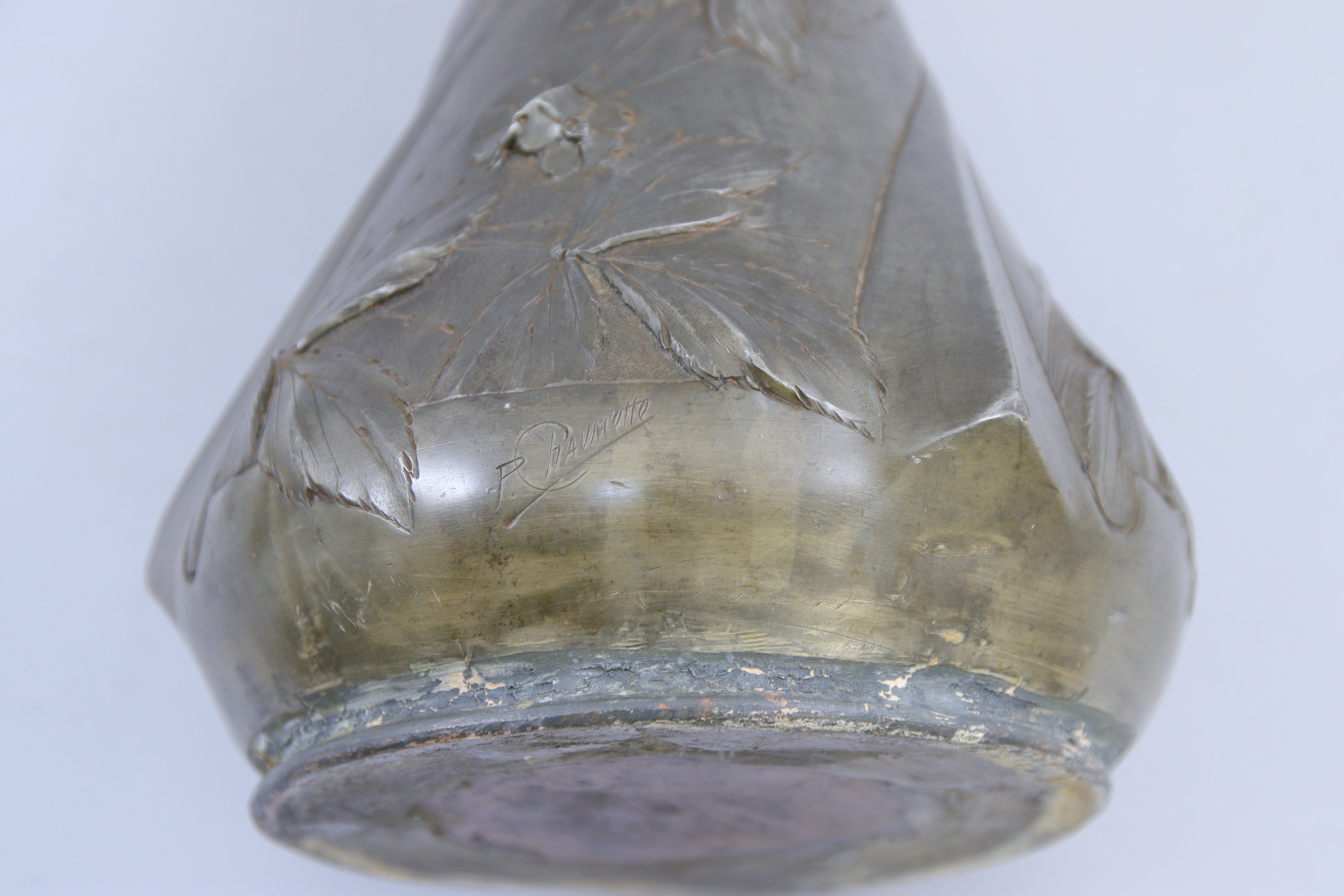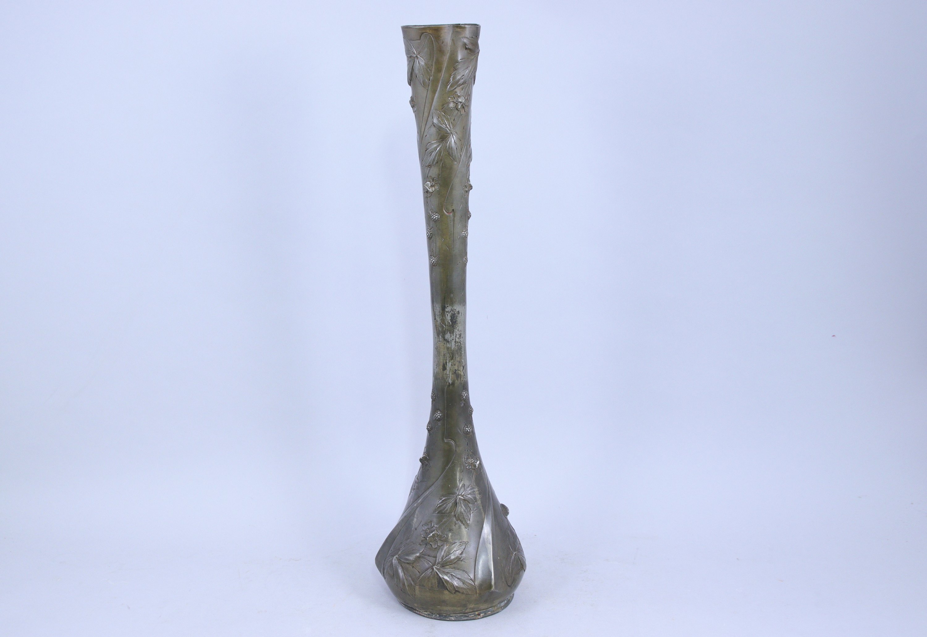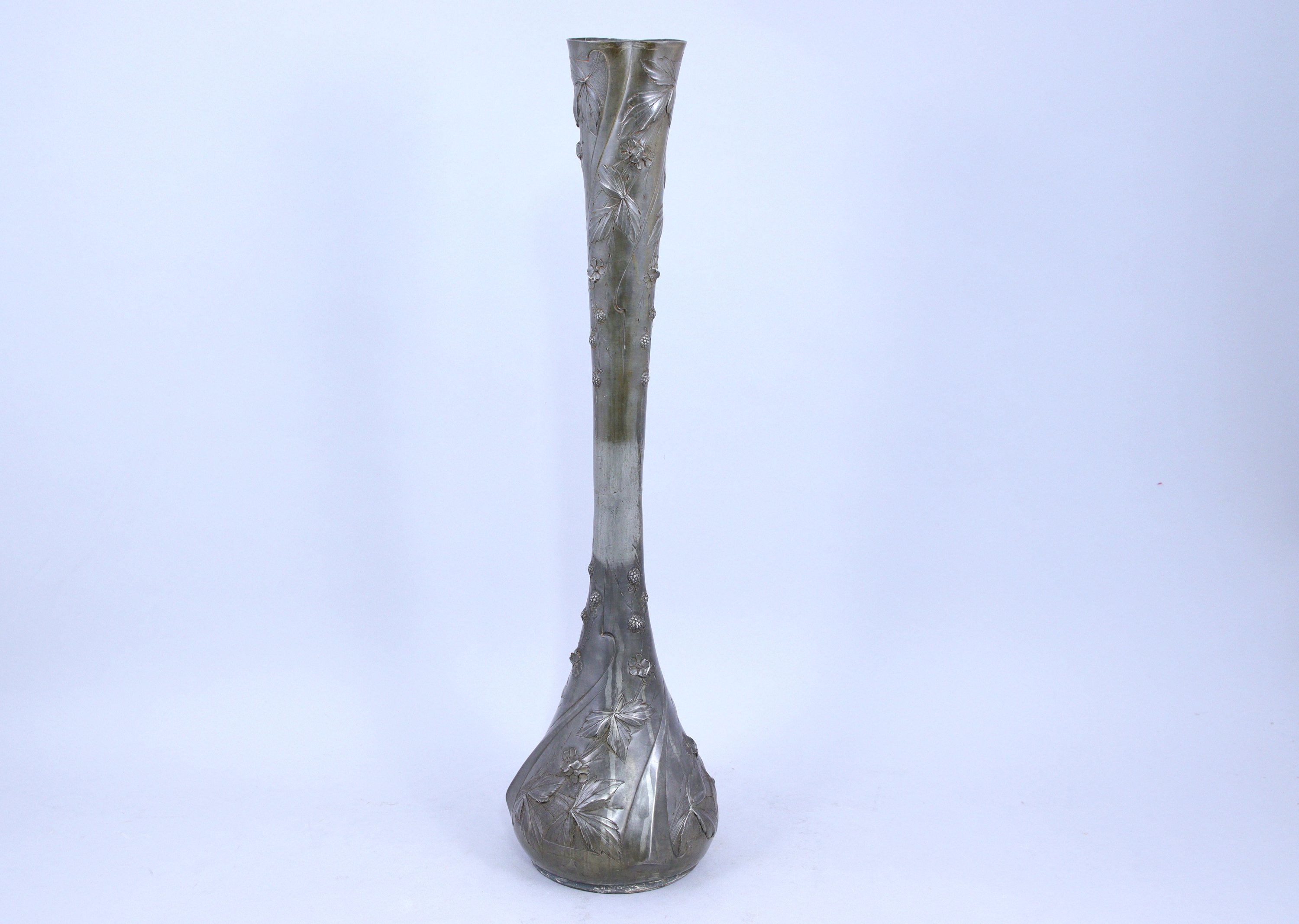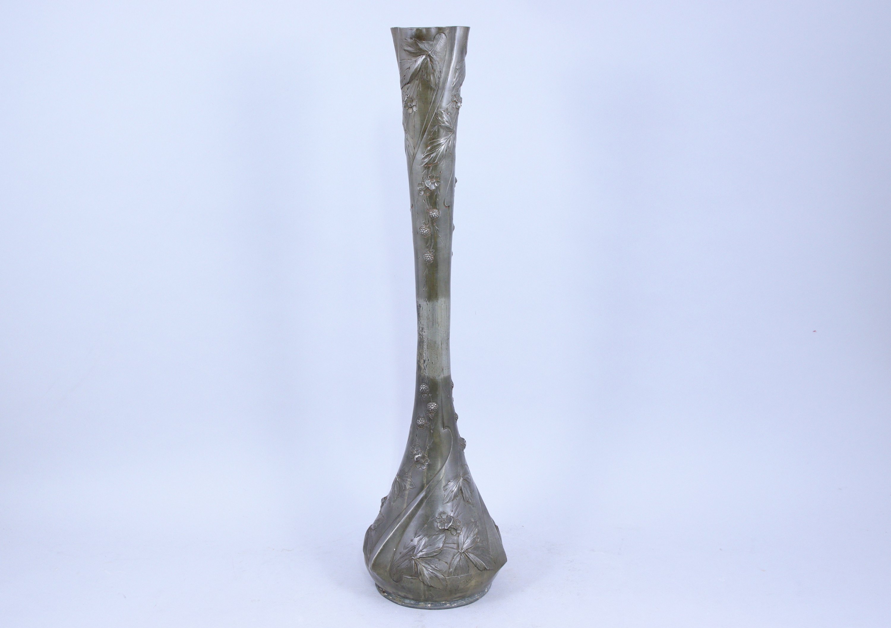 en étain au col trilobé, à décor en relief de branches de framboisiers.
