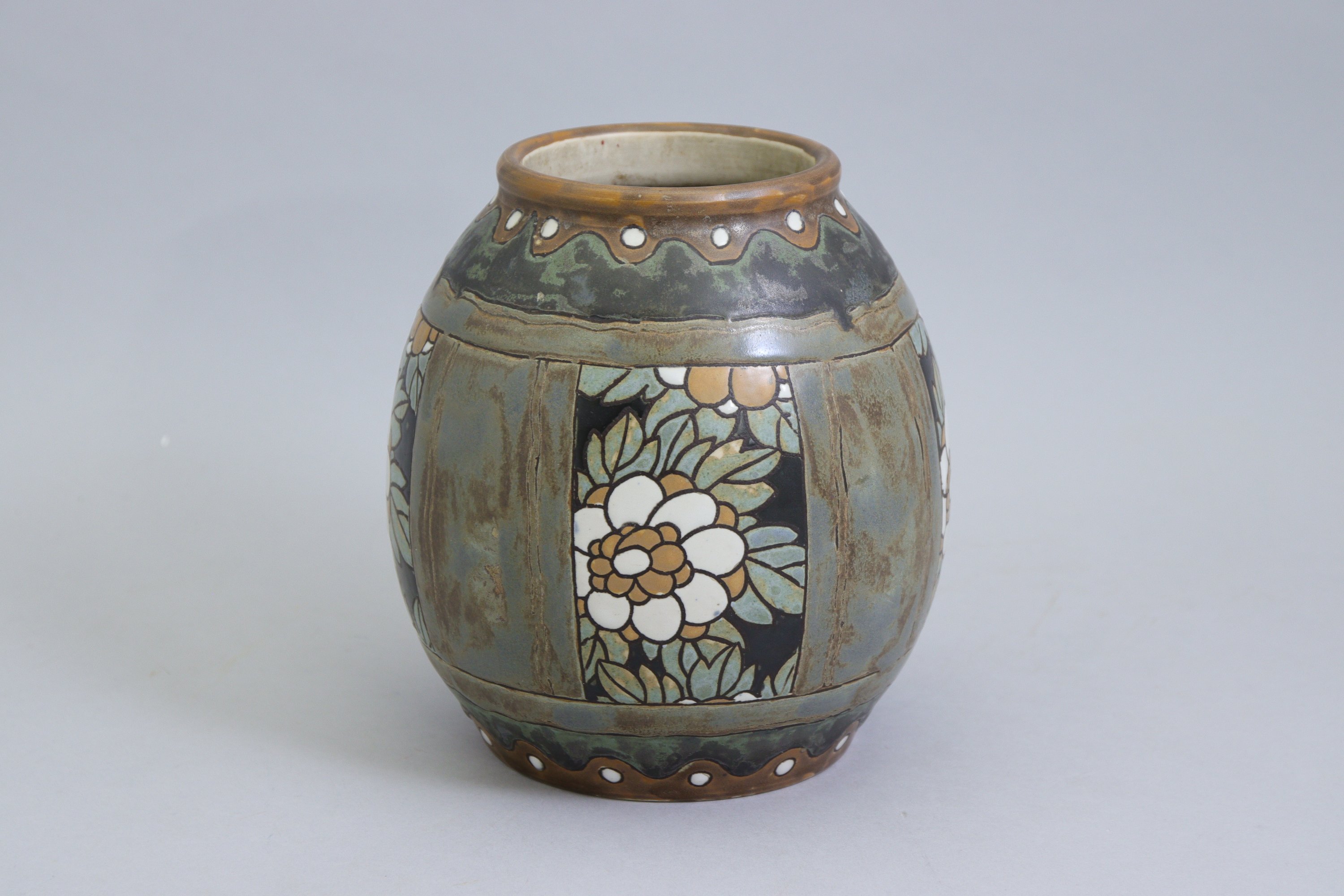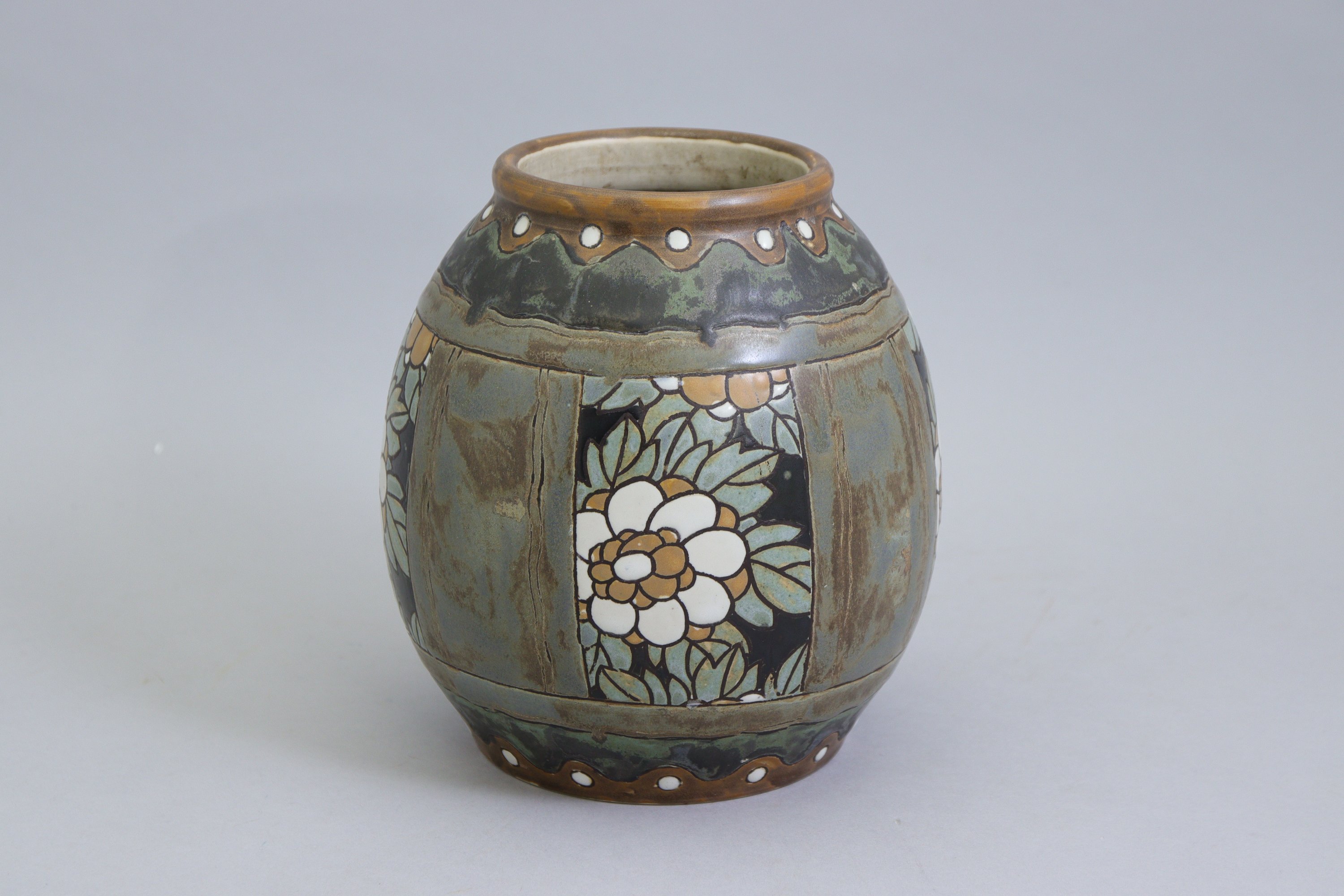 en grès à décor émaillé de fleurs dans des cartouches. Le col et le pied présentent une frise de perles dans des vaguelettes.