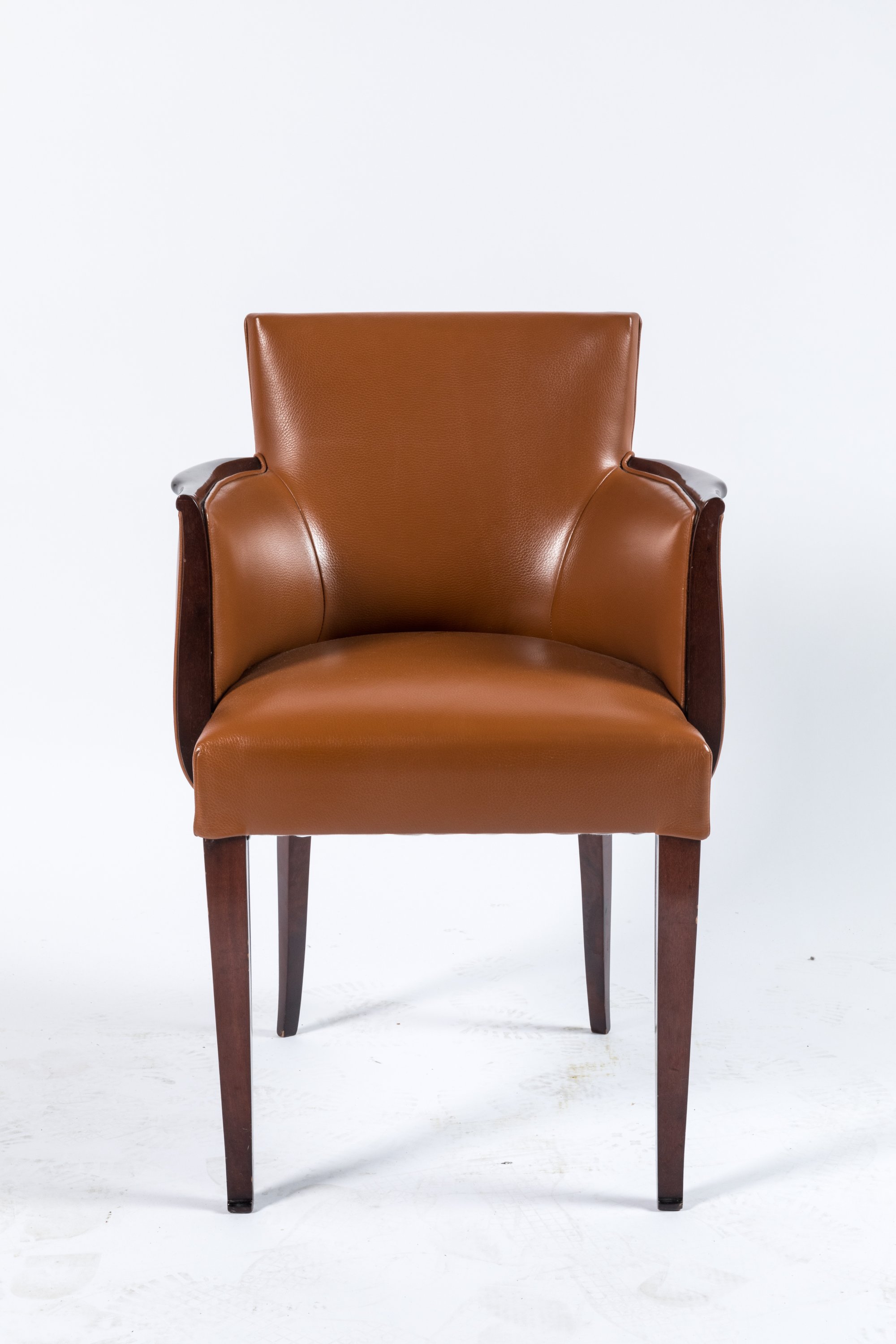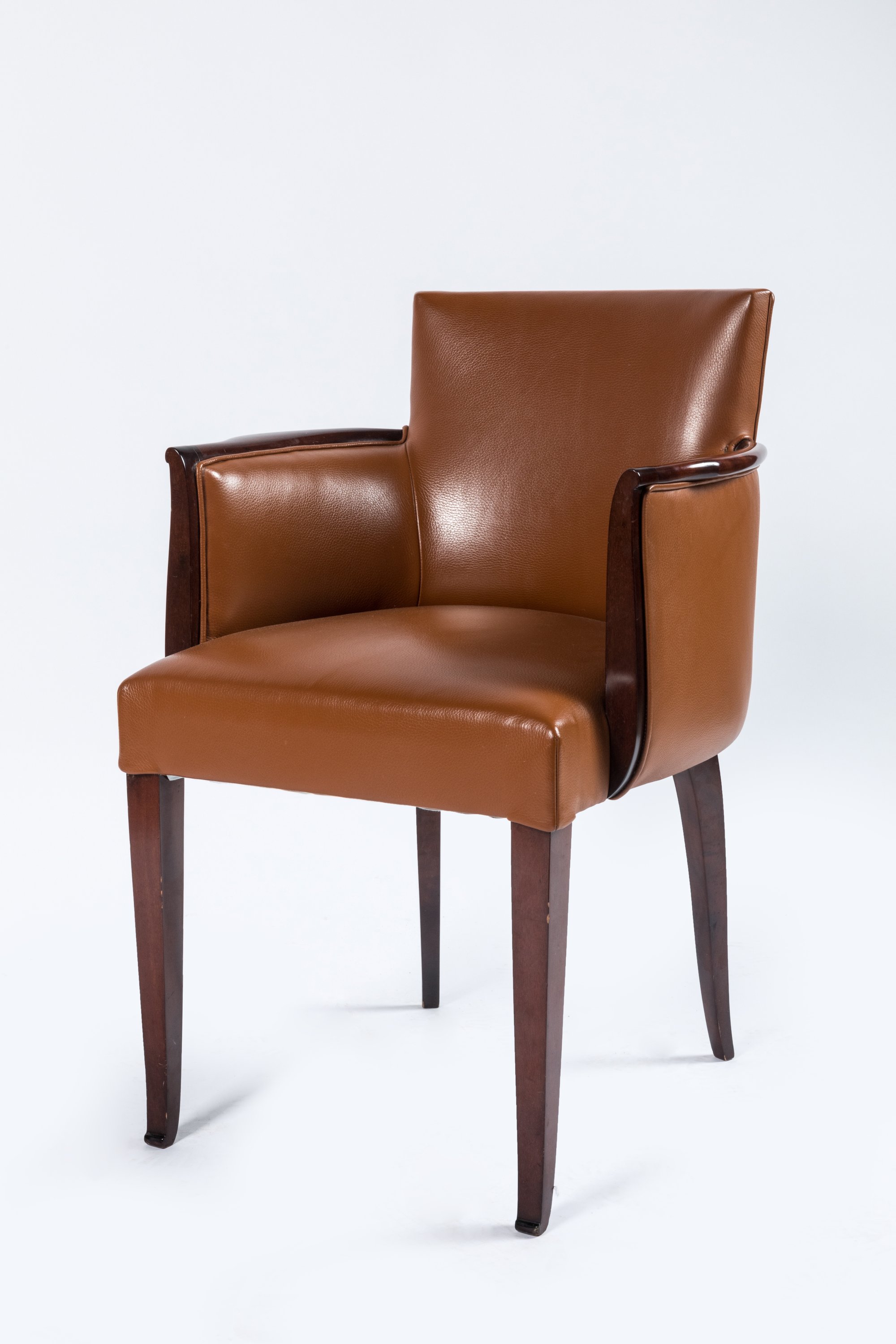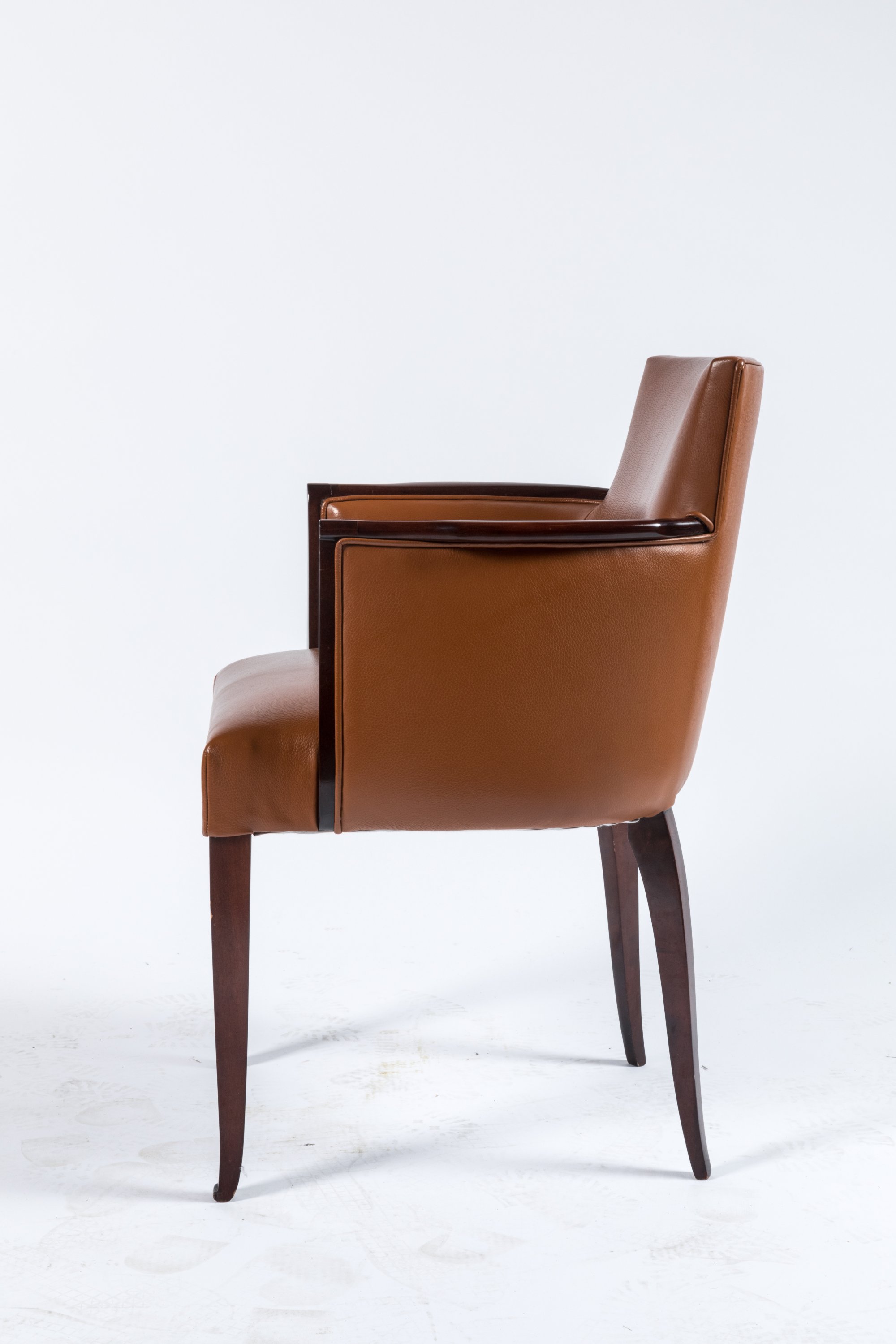 en acajou garni de cuir fauve. Dossier cabriolet et joues de l'assise pleines. Ils reposent sur quatre pieds de section carrée, les antérieurs terminés par un léger repli, les postérieurs légèrement mouvementés.