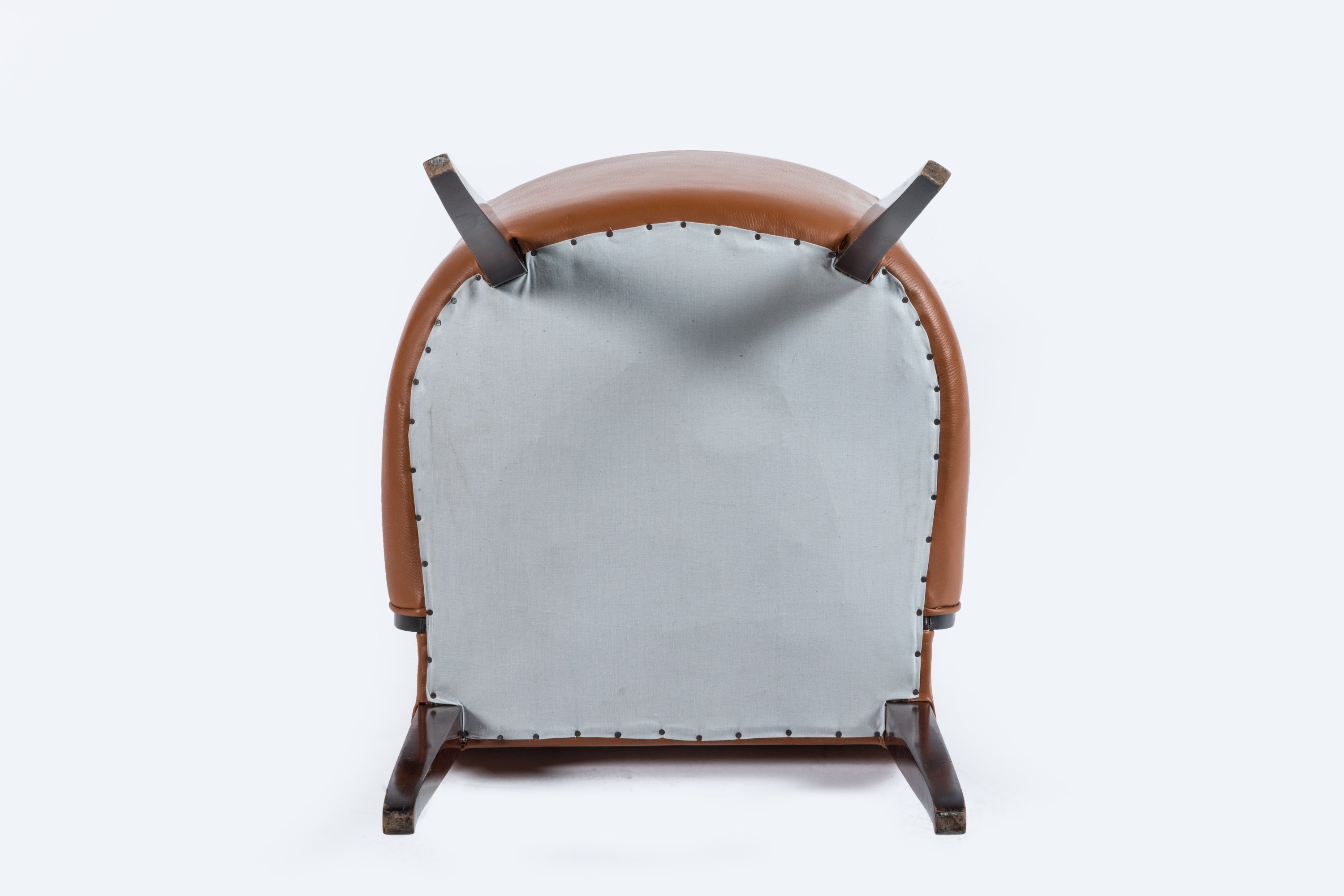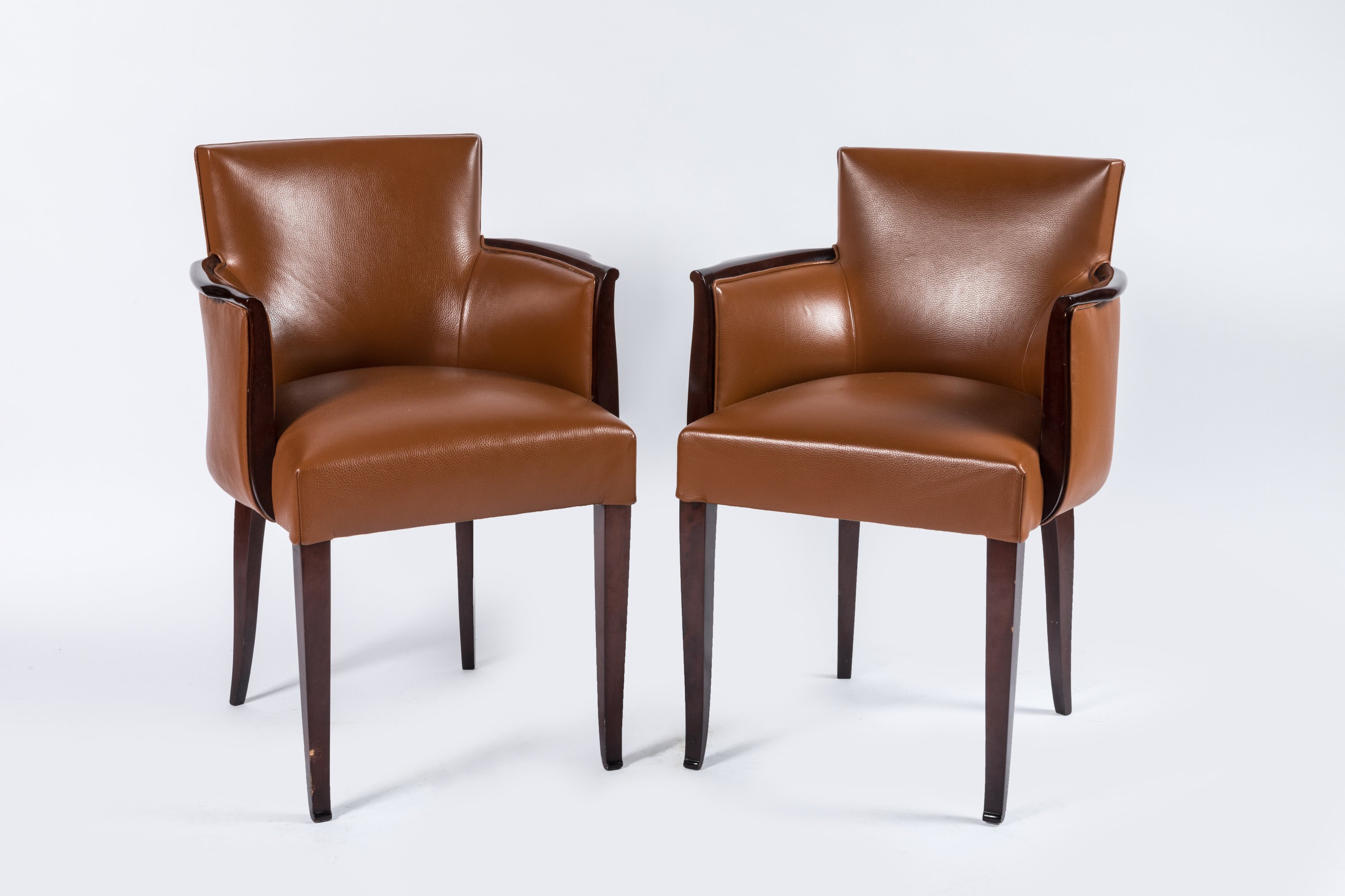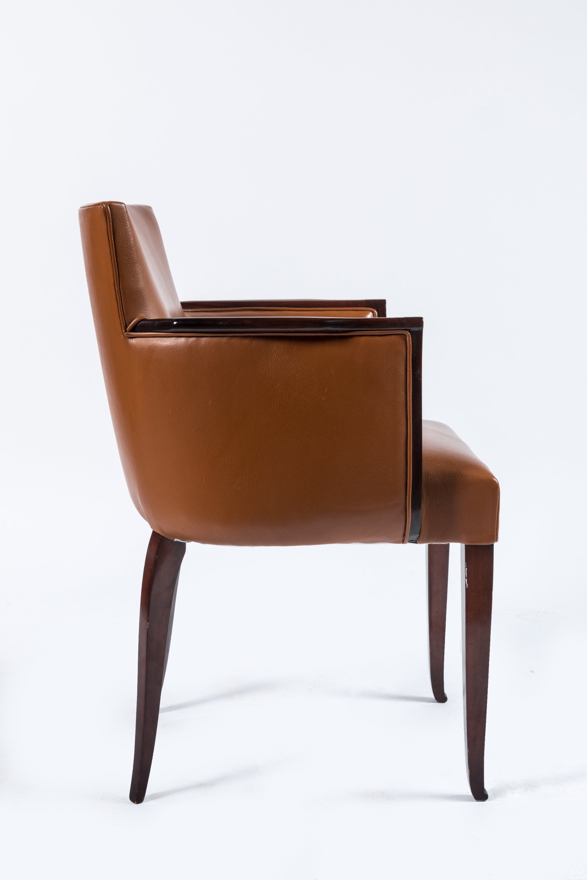 en acajou garni de cuir fauve. Dossier cabriolet et joues de l'assise pleines. Ils reposent sur quatre pieds de section carrée, les antérieurs terminés par un léger repli, les postérieurs légèrement mouvementés.