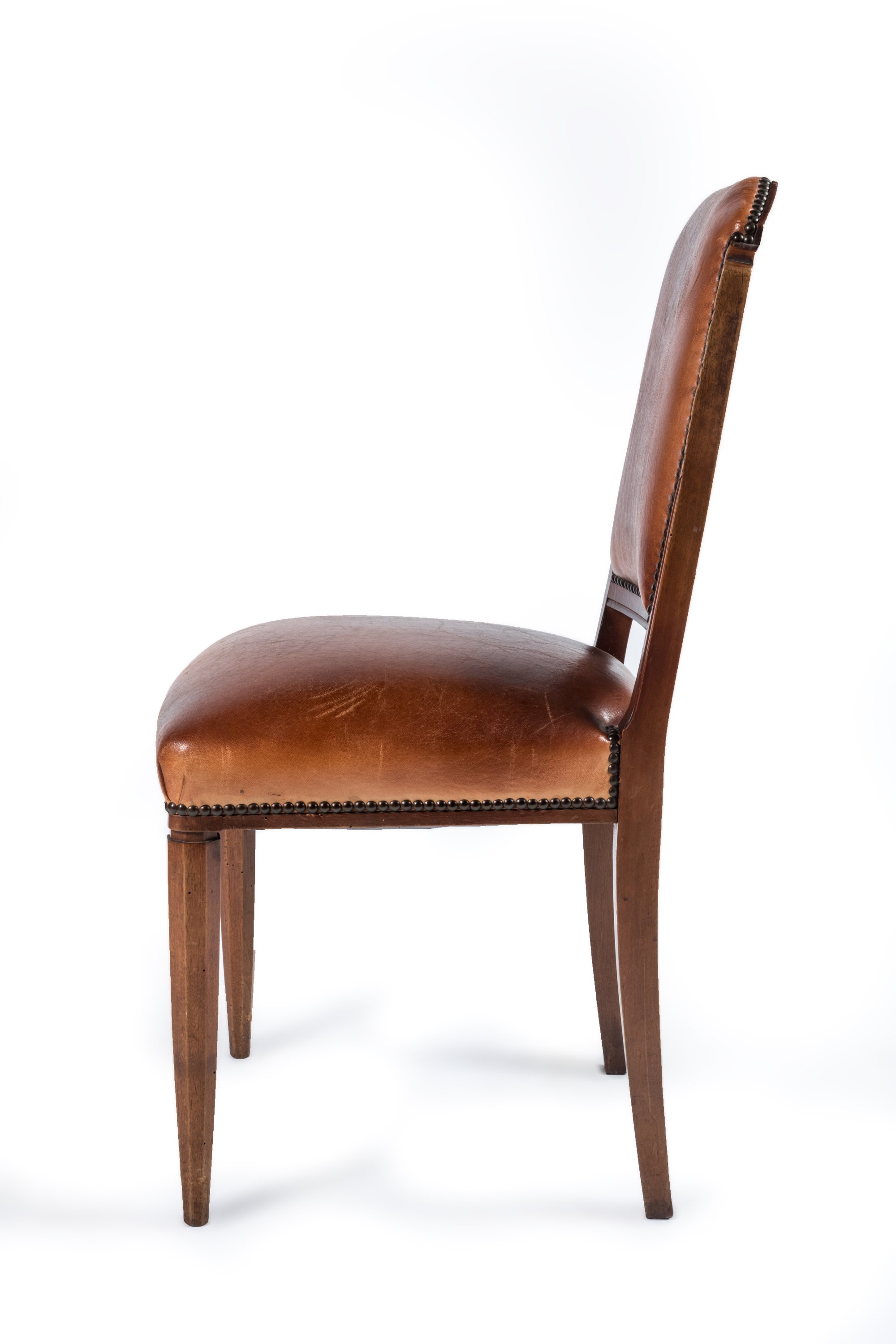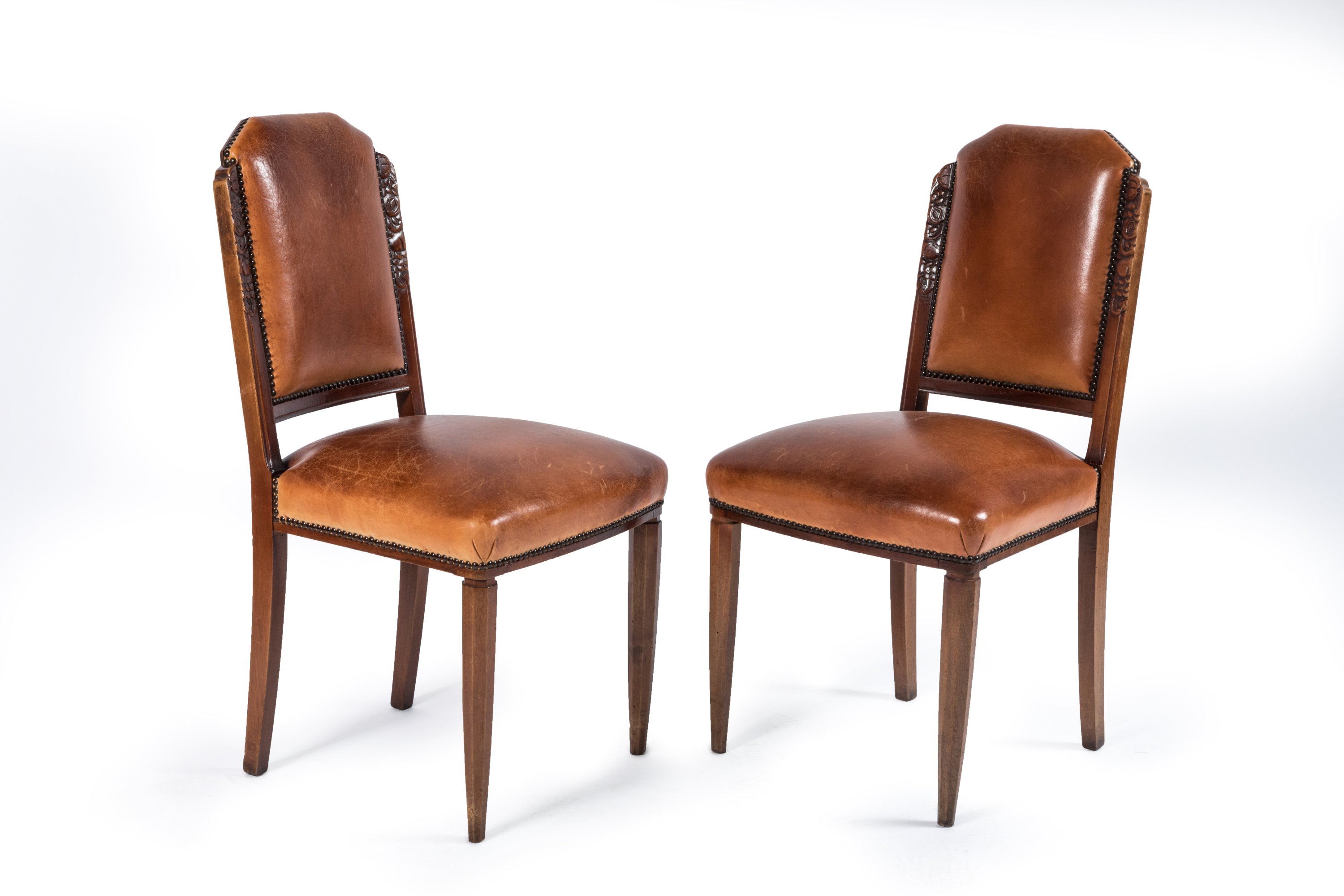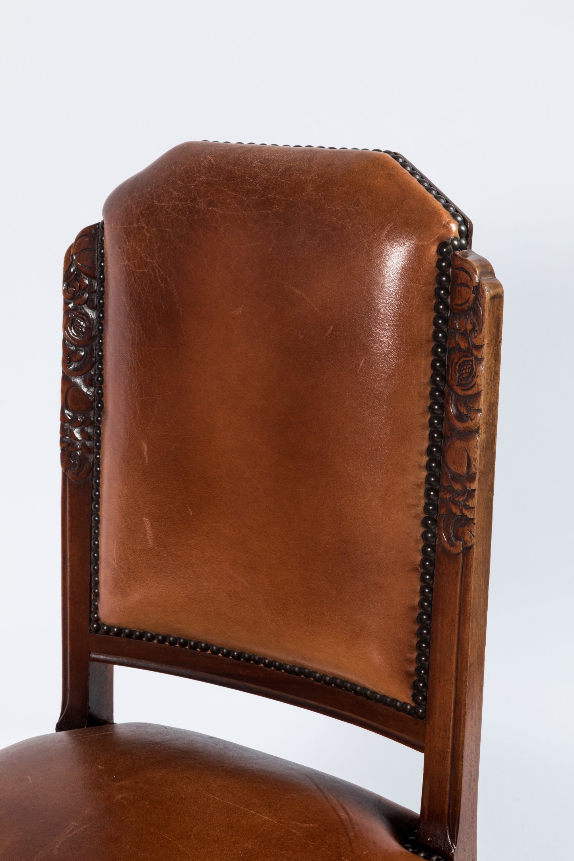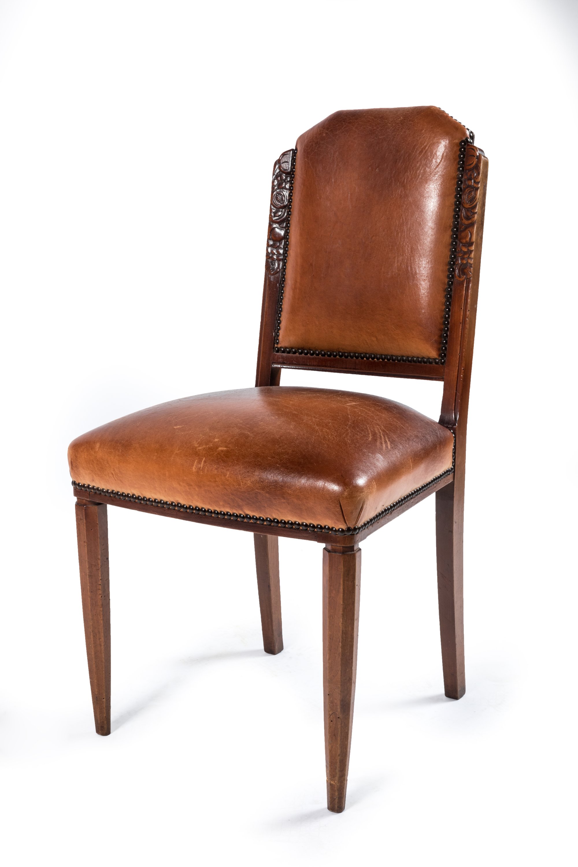 en noyer sculpté de motifs végétaux et floraux sur les montant de l'assise. L'assise et le dossier à pans coupés sont garnis de cuir brun. Les pieds antérieurs octogonaux sont fuselés.