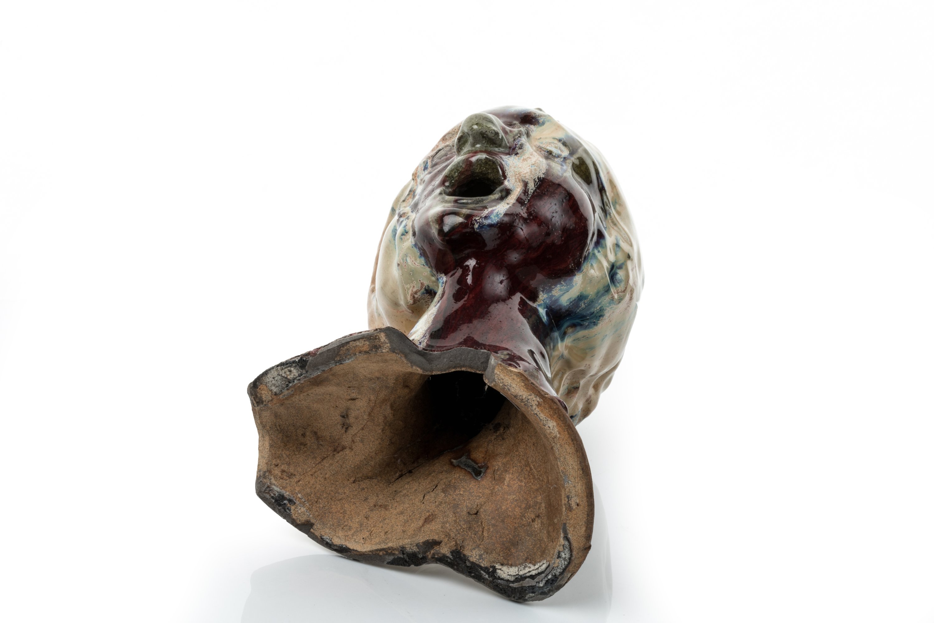 Ce troublant travail anonyme, découvert lors d'un vide grenier à Tours en 2022, montre tant la dextérité du ou de la céramiste qui maitrise la technique des grès flammés, à l'instar d'un Jean-Joseph Carries ou d'un Alexandre Bigot, que l'inspiration du célèbre "Cri" d'Edvard Munch qui résonne sur ce buste au niveau du thème bien sûr, avec cette femme au chignon redressé sur la nuque hurlant en silence, mais aussi au niveau du choix des couleurs qui l'ornent et qui composent la toile de fond de cette célèbre toile.