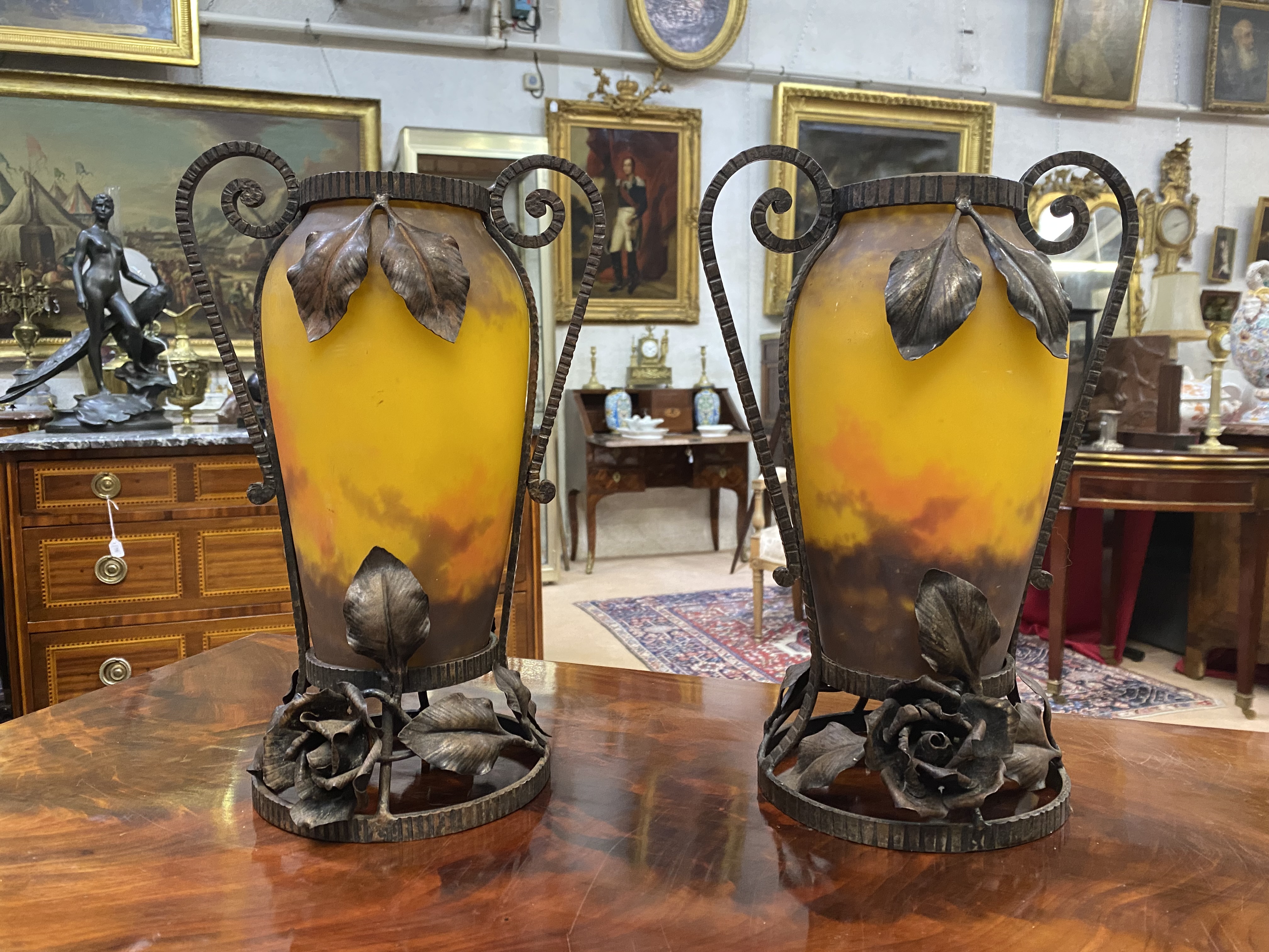 en verre à décor dégagé à l'acide à fond orangé. Ils sont inscrits dans une monture en fer forgé à deux anses dont le col est décoré de deux feuilles. Le piétement ajouré à une rose épanouie.