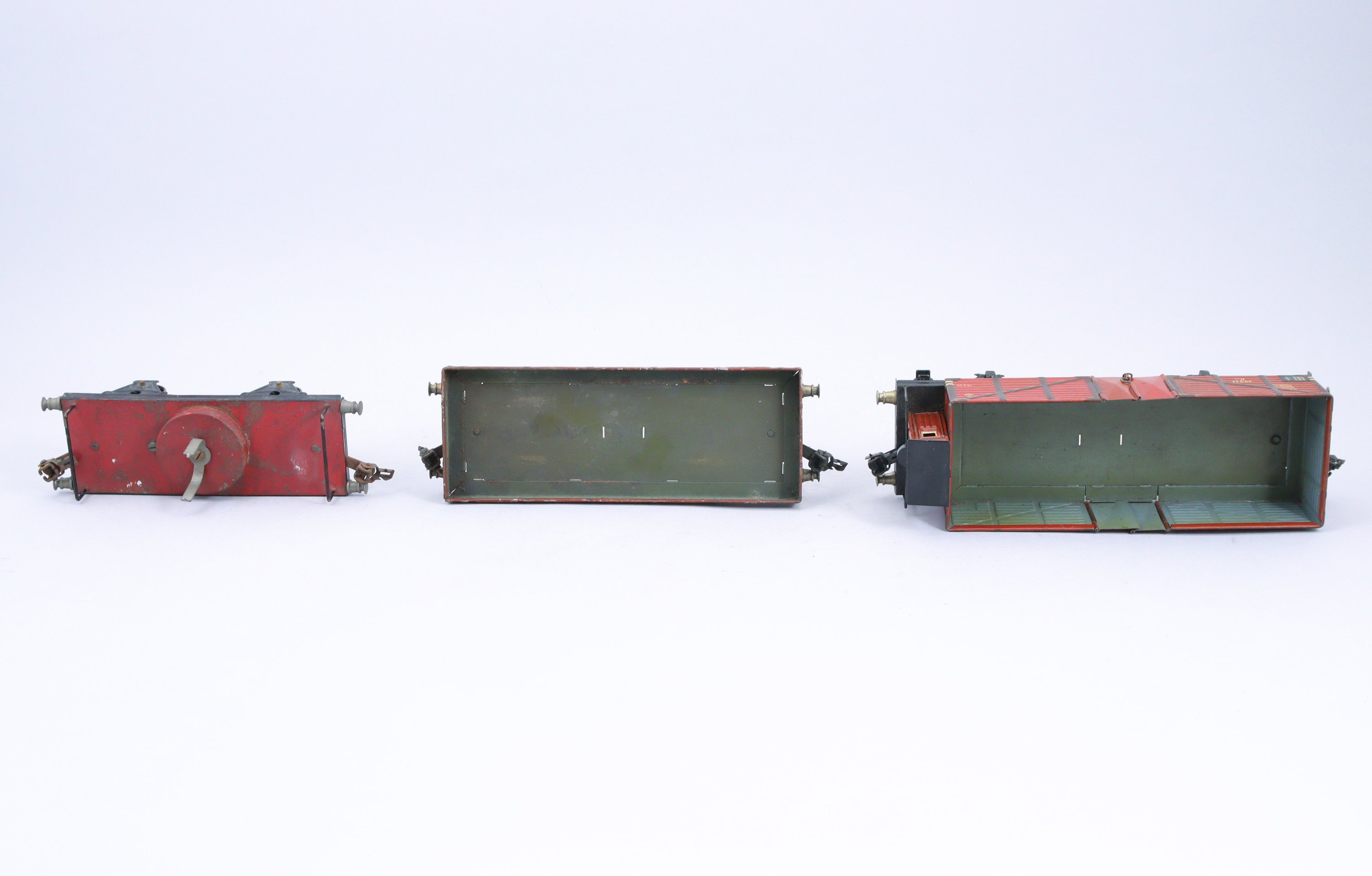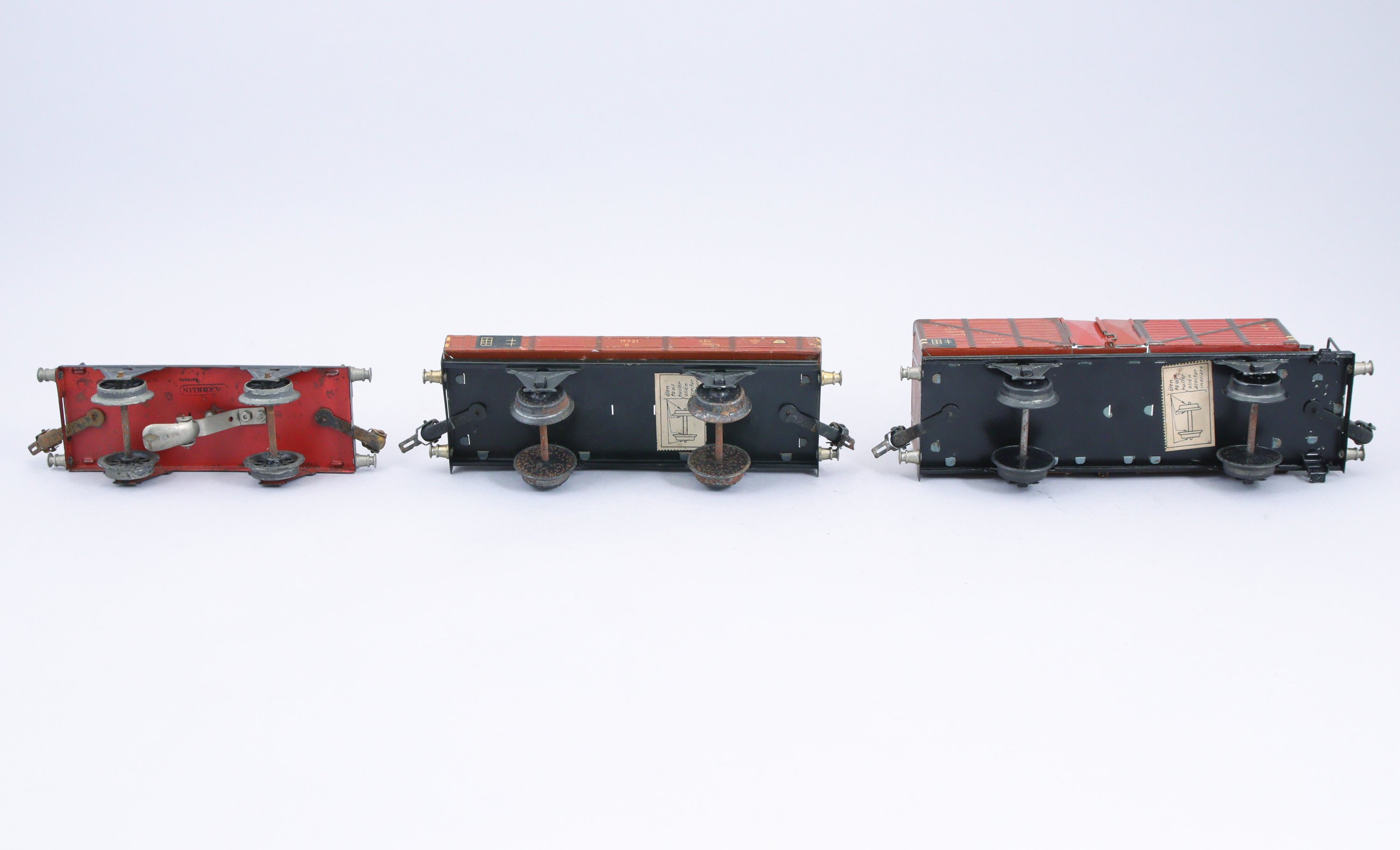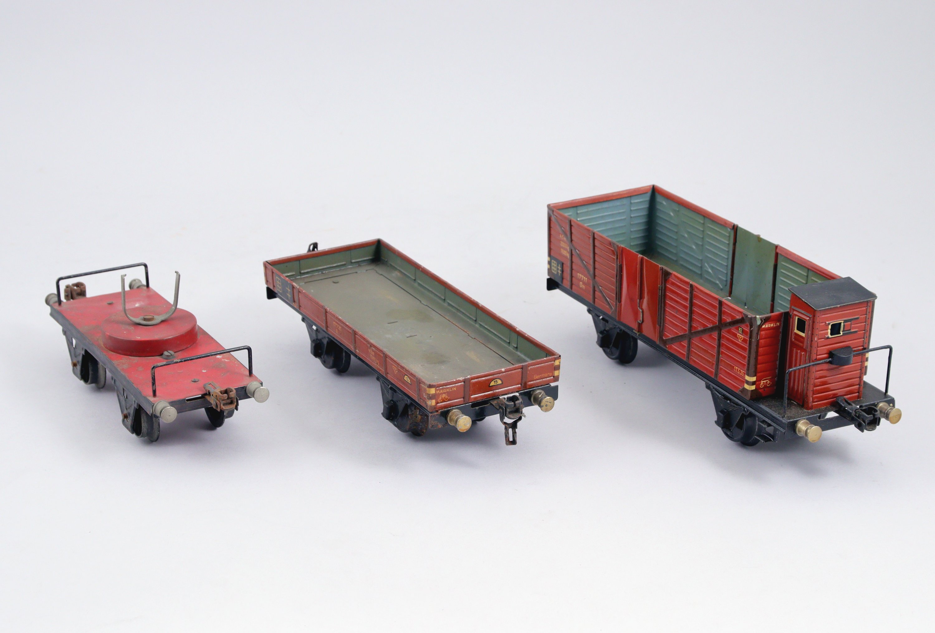 Märklin, écartement 1, trois wagons à essieux :- Tombereau marron...