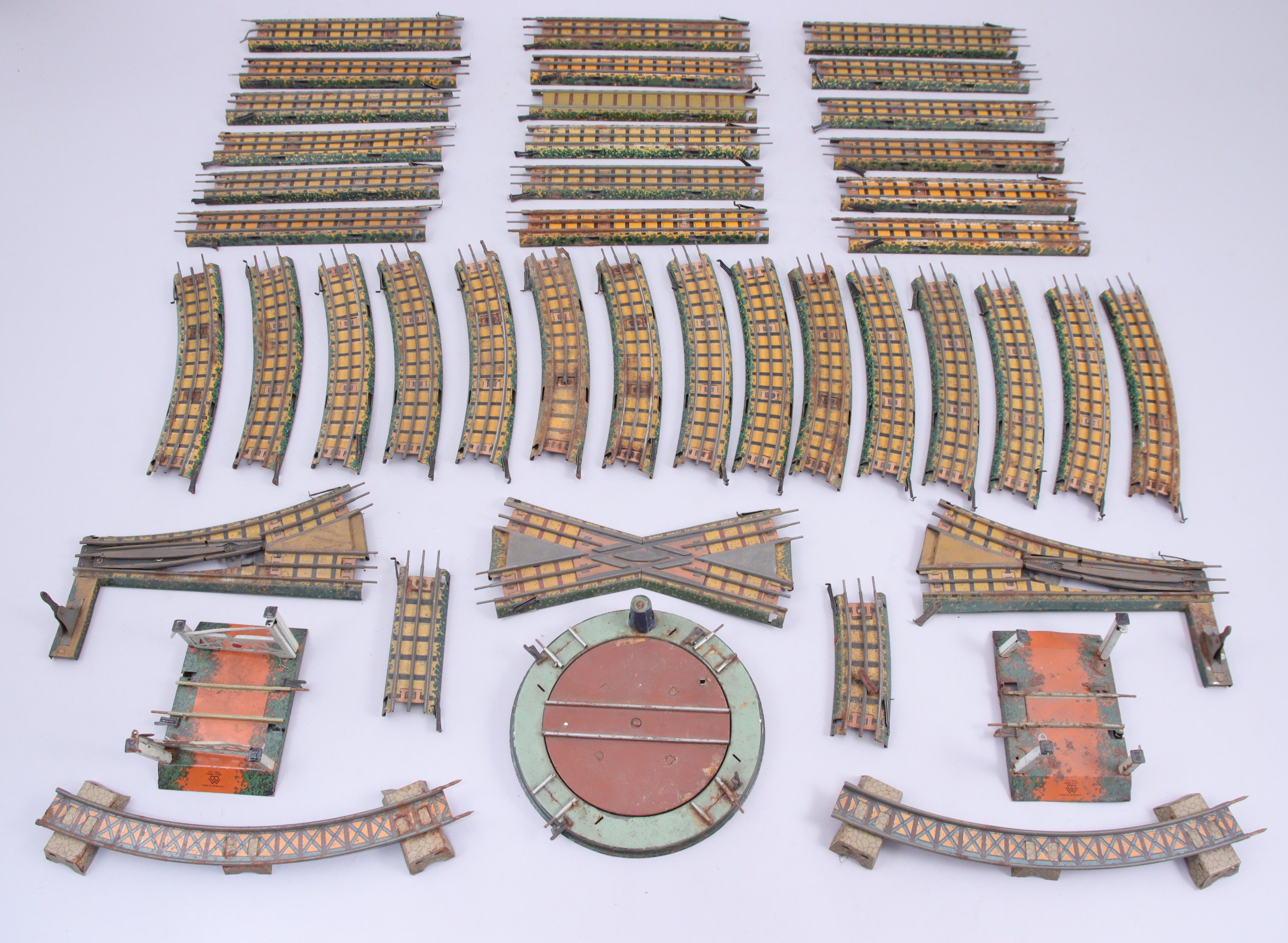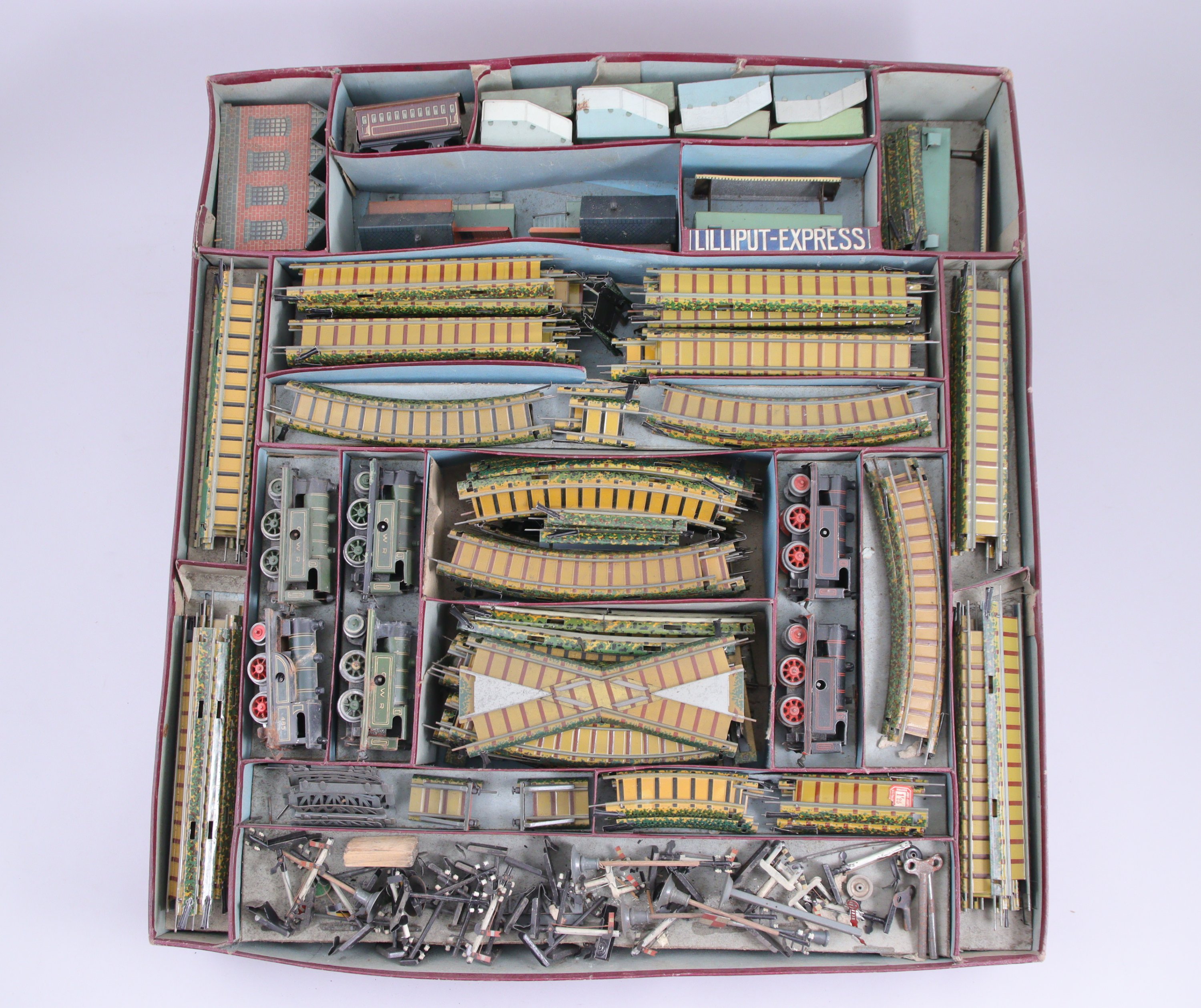 Deux grands coffrets (l'un avec couvercle) contenant différents éléments, dont deux locotenders électriques type 120 noires à filets rouges, deux locotenders type 120 mécaniques noires à filets rouges, une locotender mécanique 120 verte GWR, trois wagons Shell, trois fourgons, trois hangars, deux quais, deux quais de marchandises, important réseaux de rails, nombreux poteaux téléphoniques et sémaphoriques.