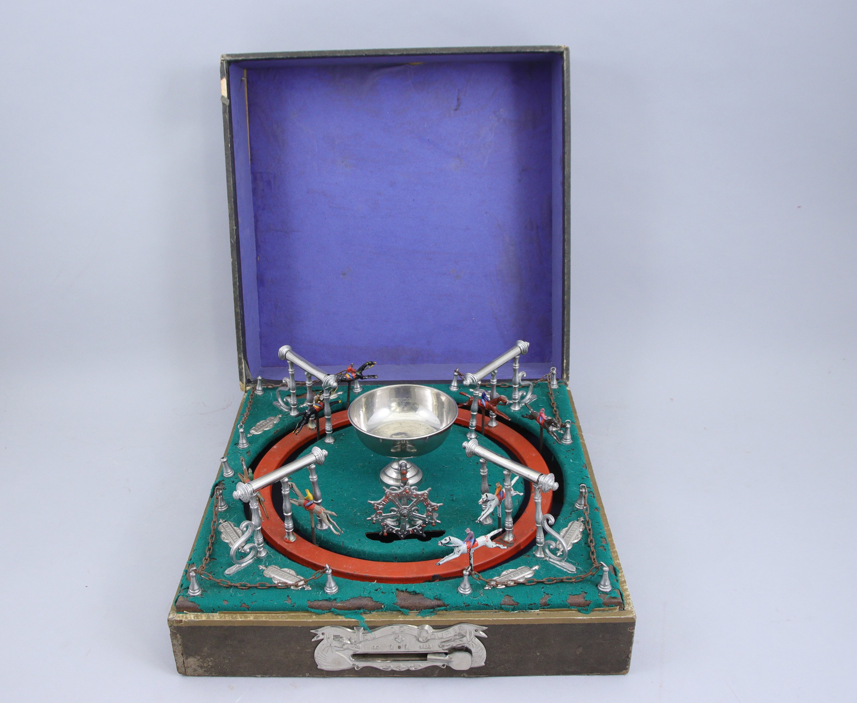 Ancien jeu mécanique à deux pistes et huit chevaux, en métal laqué et feutrine verte.