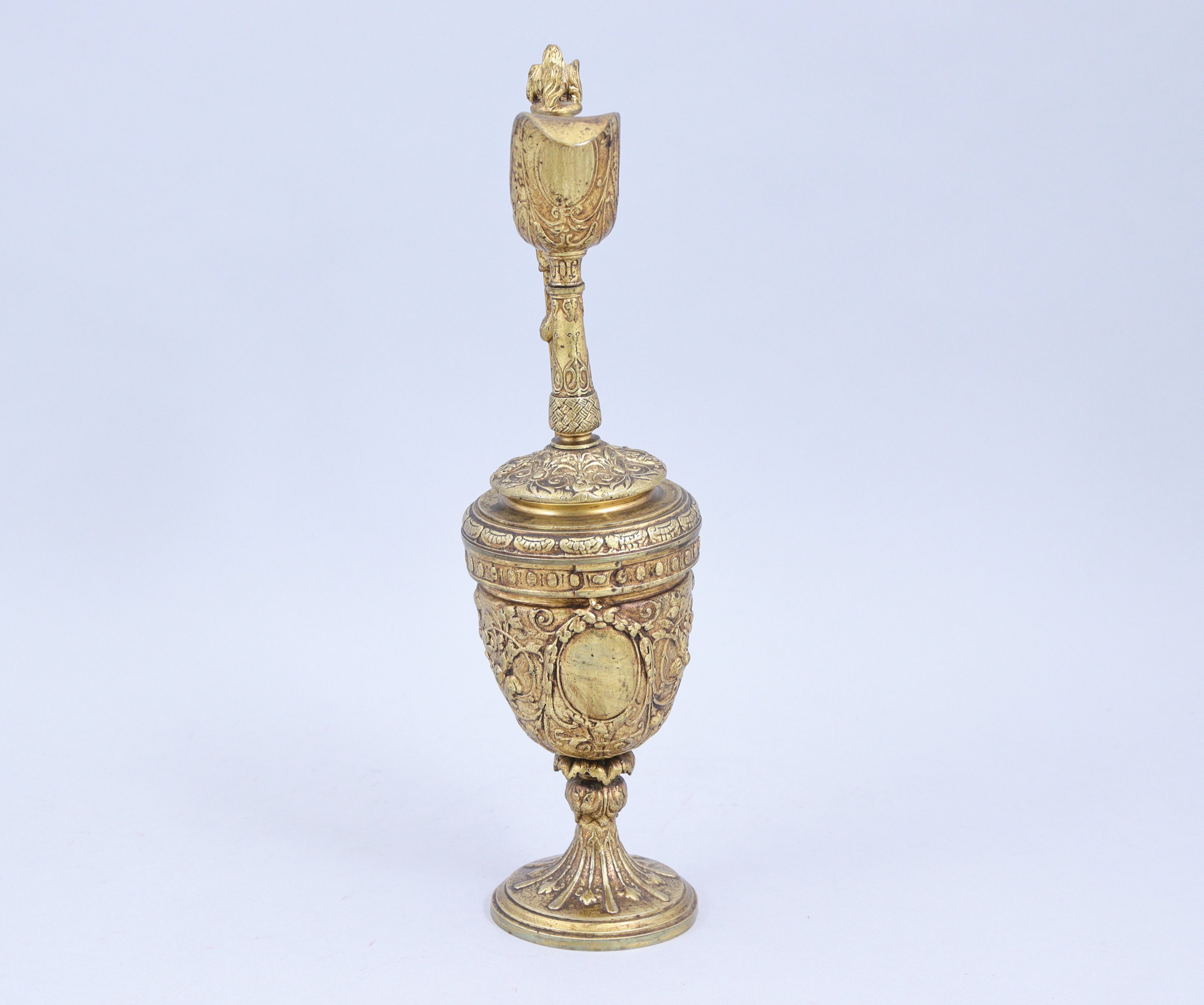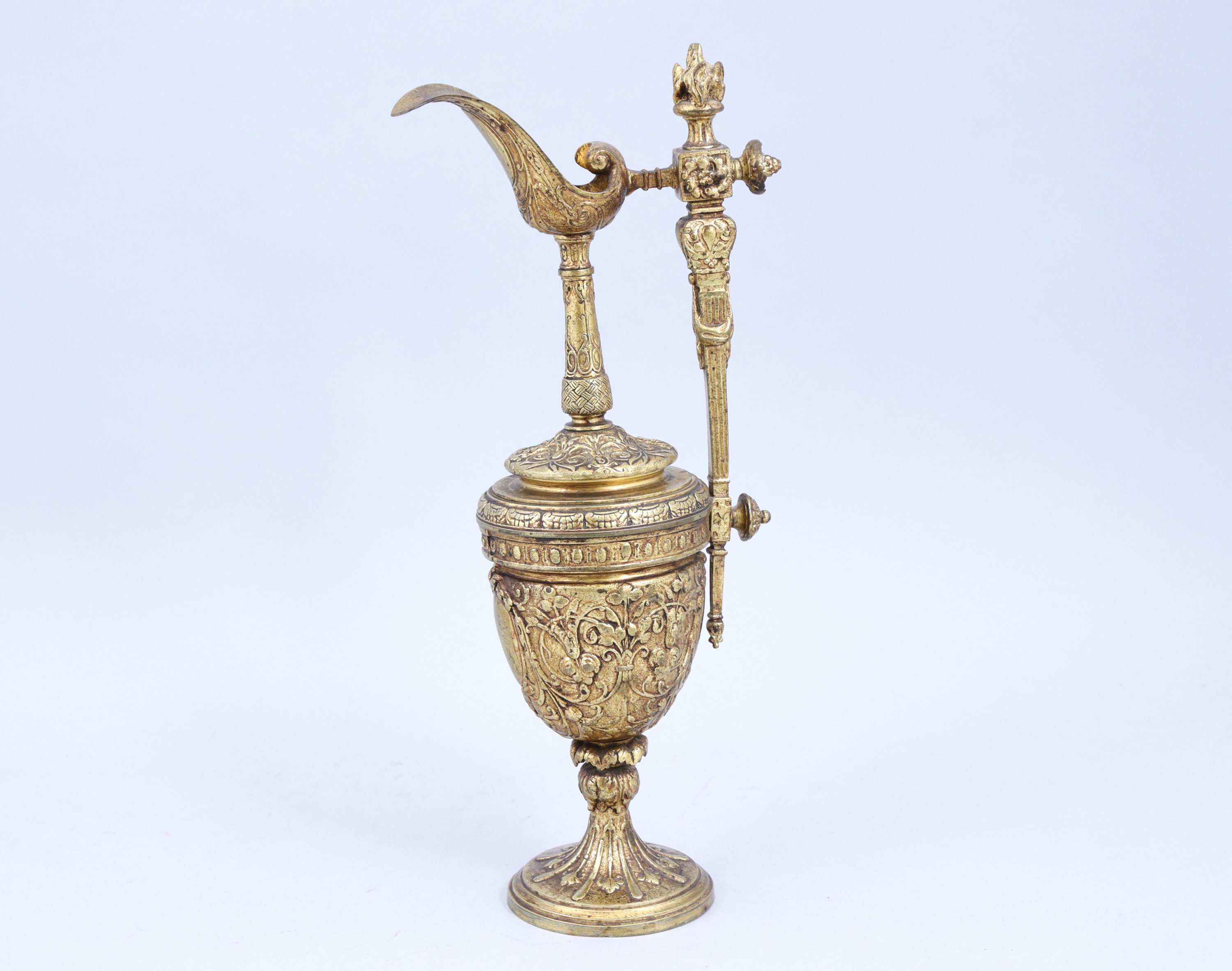 en bronze doré. L'anse coiffée d'un pot à feu, le bec verseur de forme évasée reposant sur un fin col. La panse est décorée de rinceaux entourant des médaillons à décor de guirlandes. Elle repose sur un pied circulaire à alternance de godrons et feuilles.