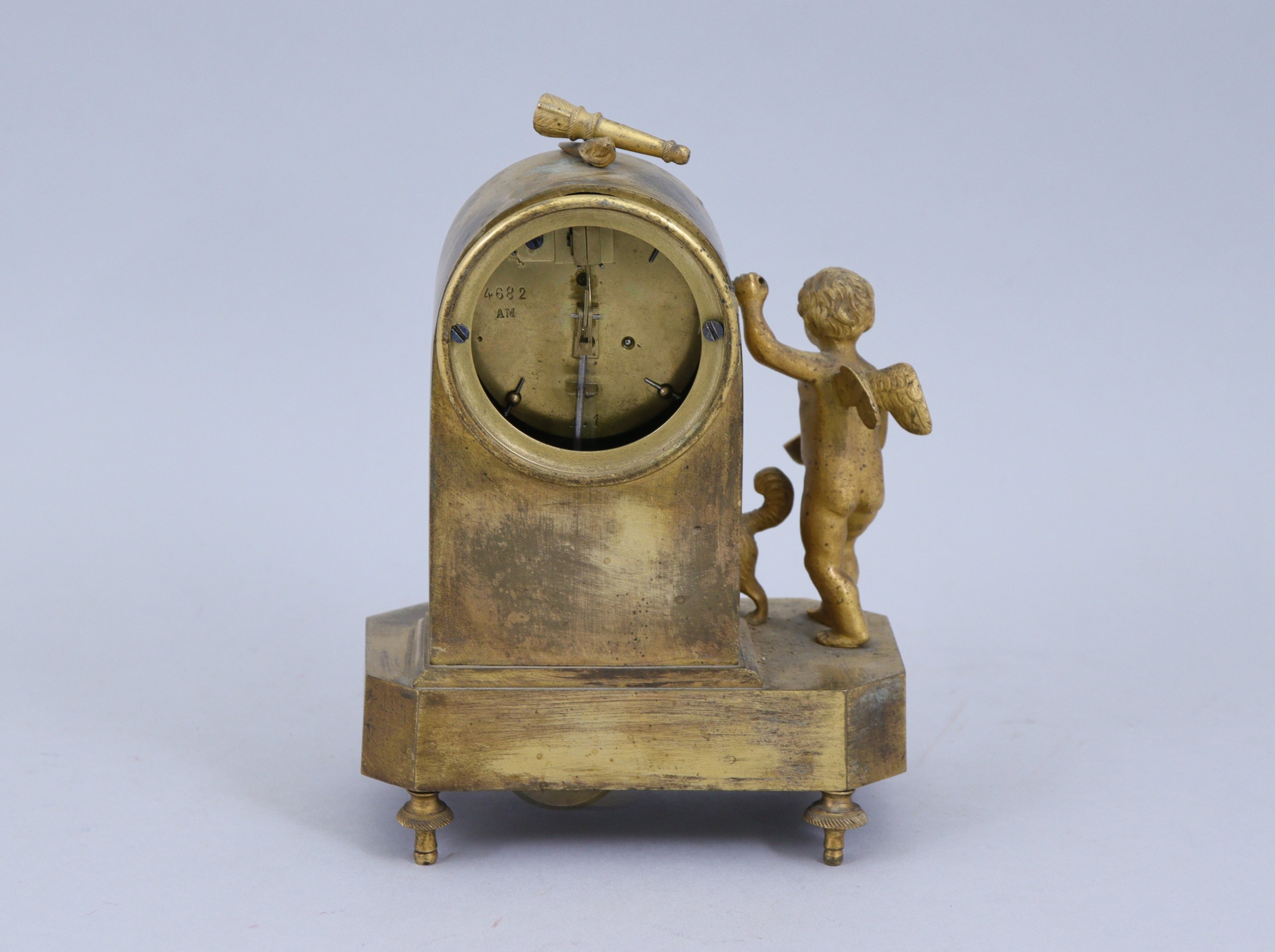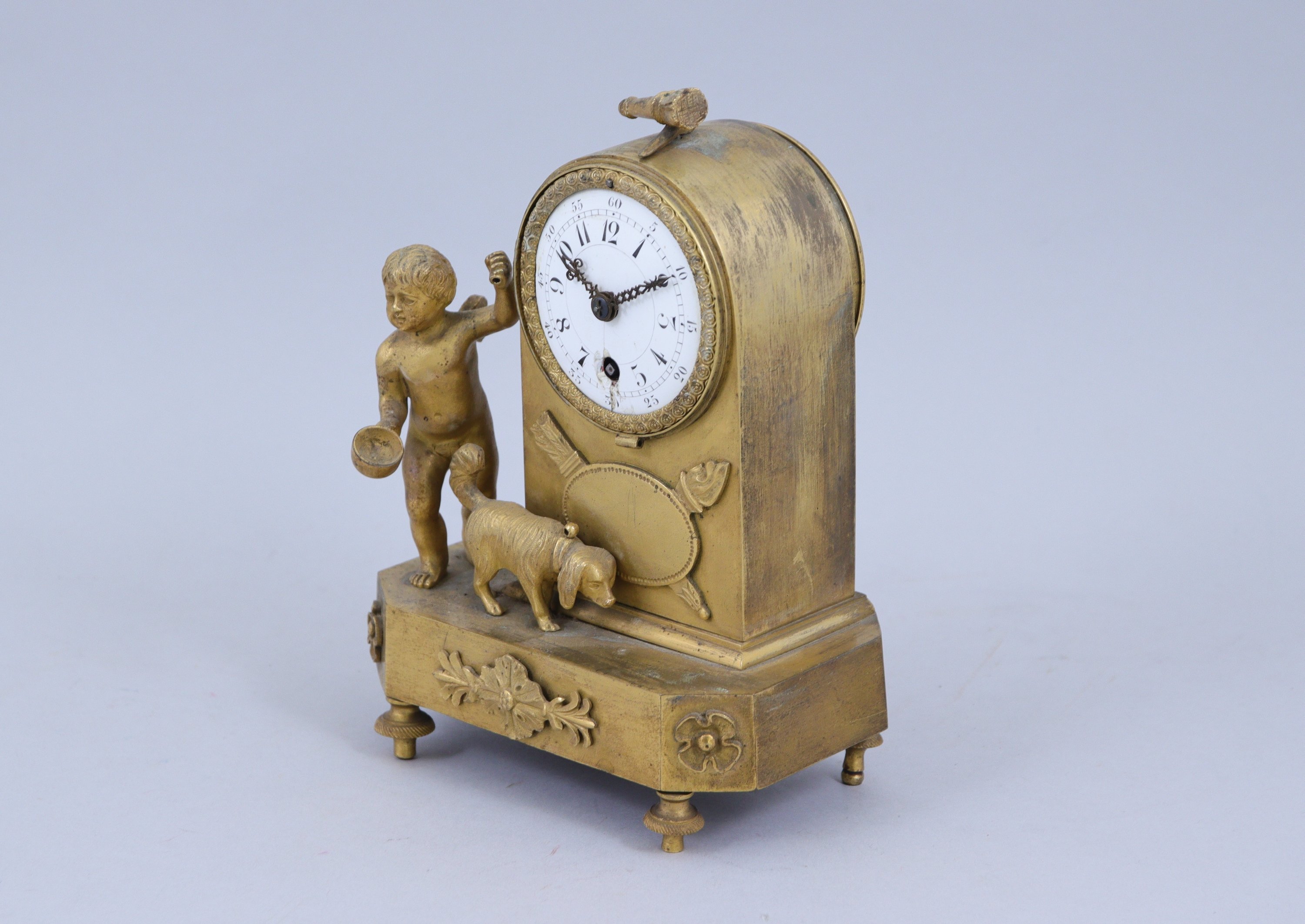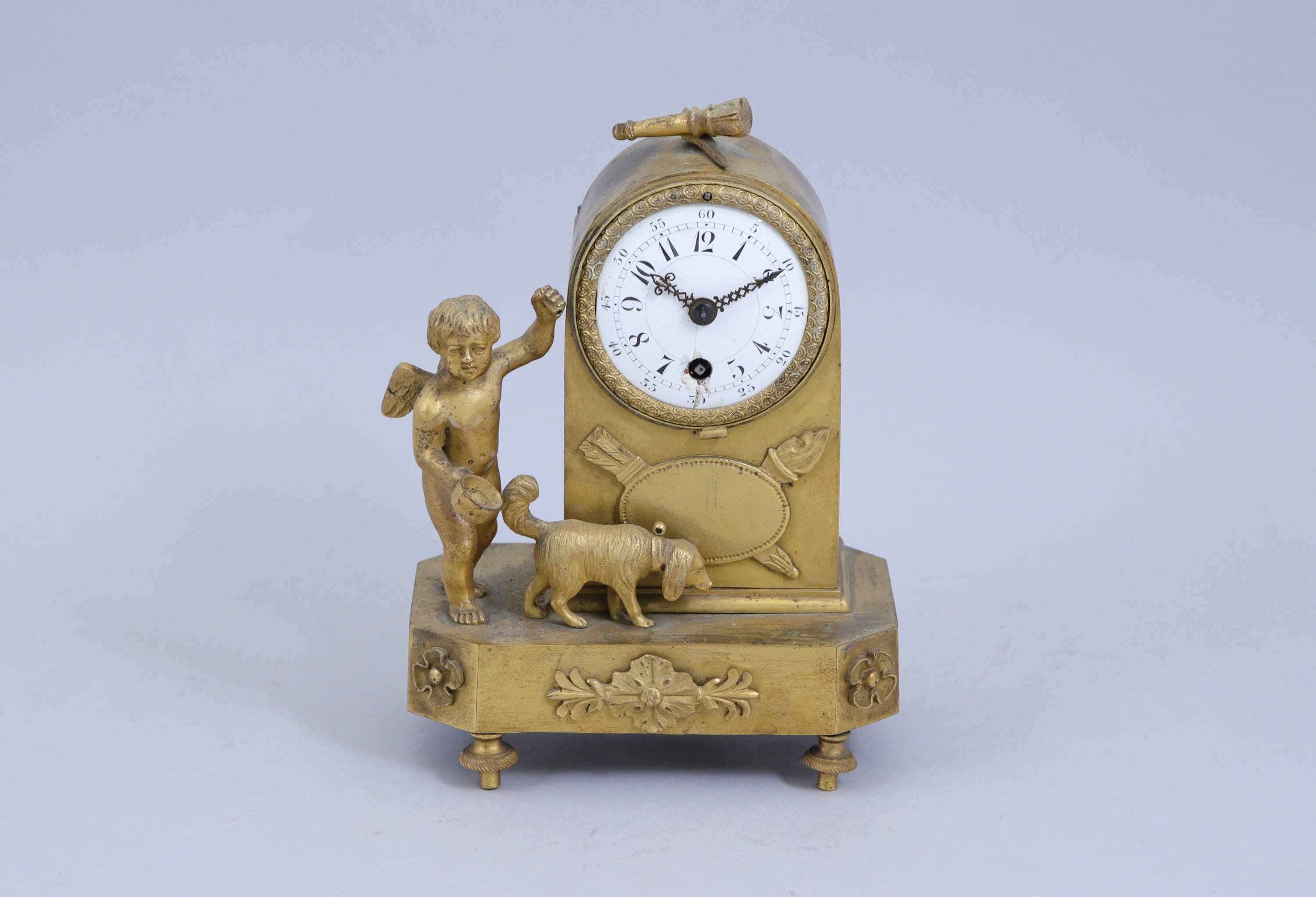 en bronze doré. Le cadran, inscrit dans une borne surmontée d'un carquois et d'une flamme, indique les heures et les minutes en chiffres arabes. A côté, l'Amour apportant une écuelle à son chien reniflant. L'ensemble repose sur une base à pans coupés décorée d'appliques de fleurs. Quatre pieds toupies.