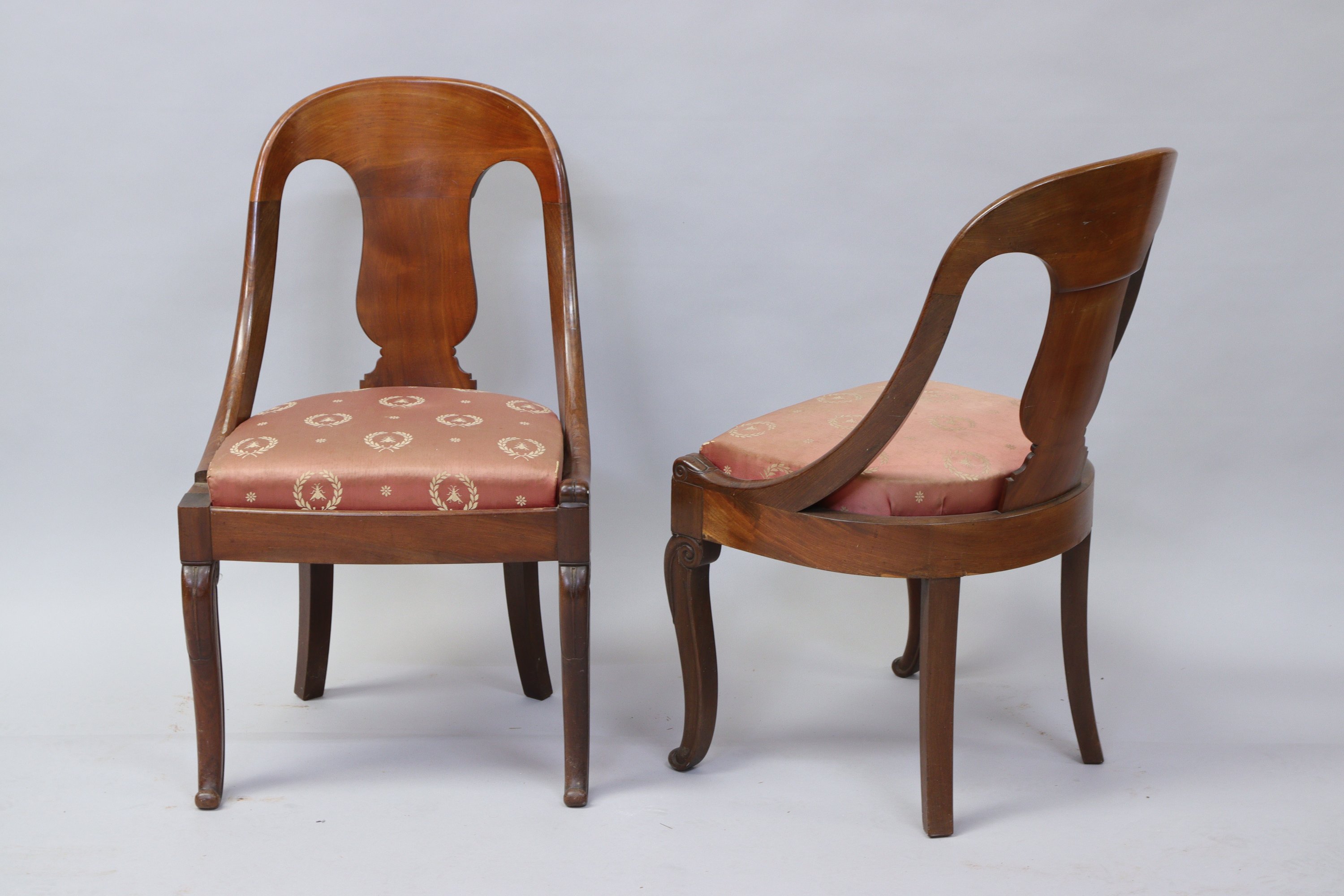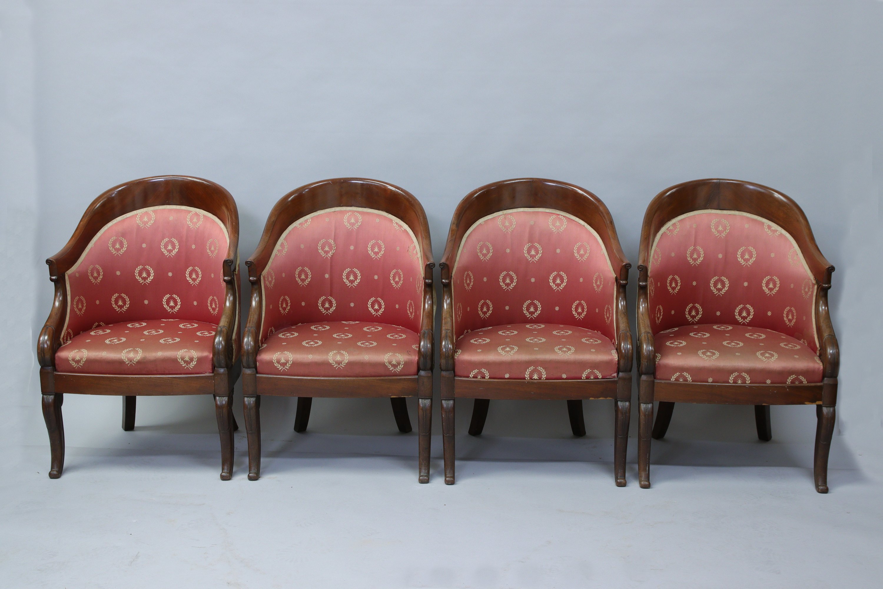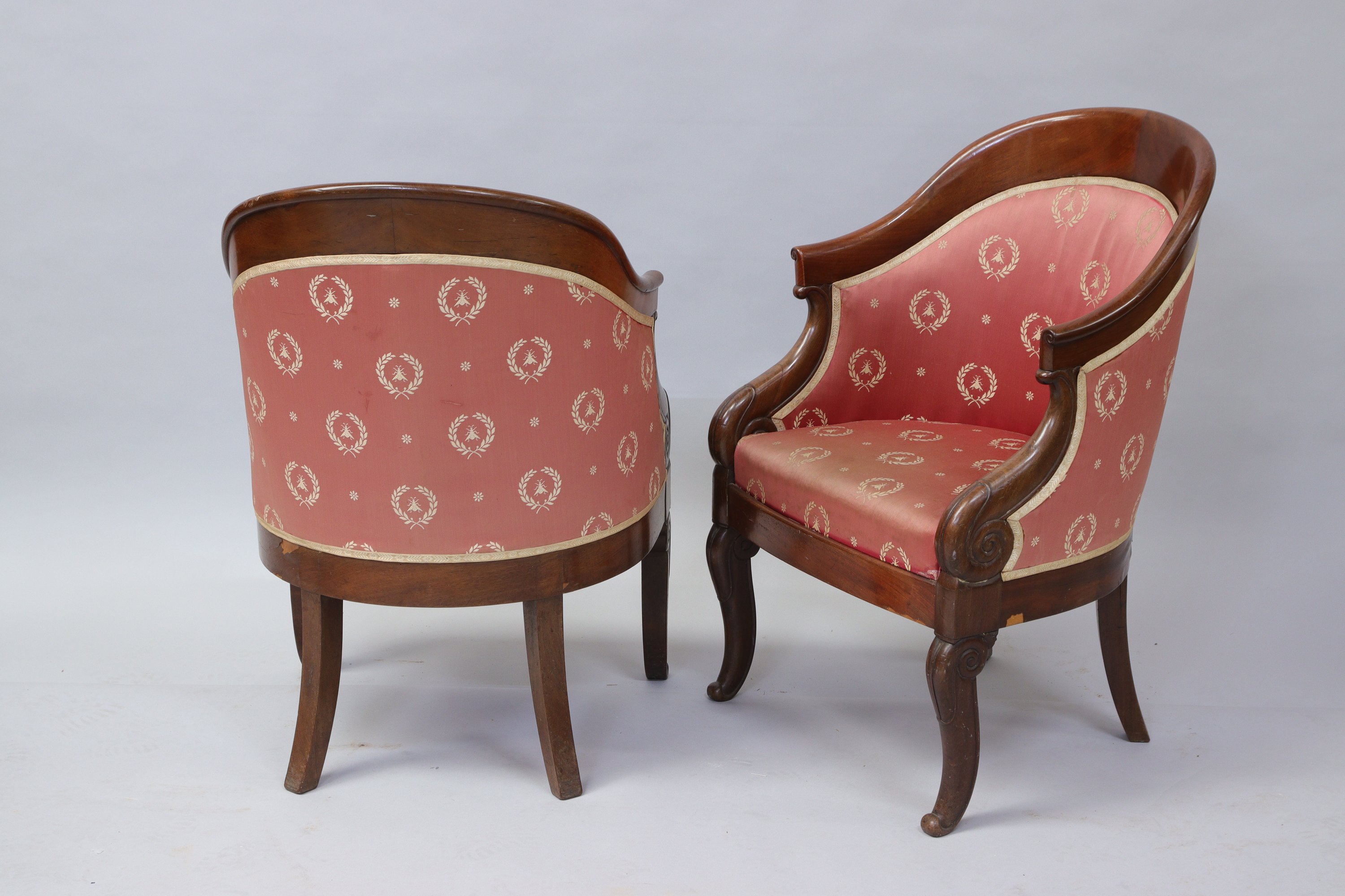 en acajou et placage d'acajou. Ils reposent sur quatre pieds, les antérieurs en jarret, les postérieurs en sabre. Garniture de soie à fond rose à décor de semis d'abeilles dans des couronnes de branches de laurier.
